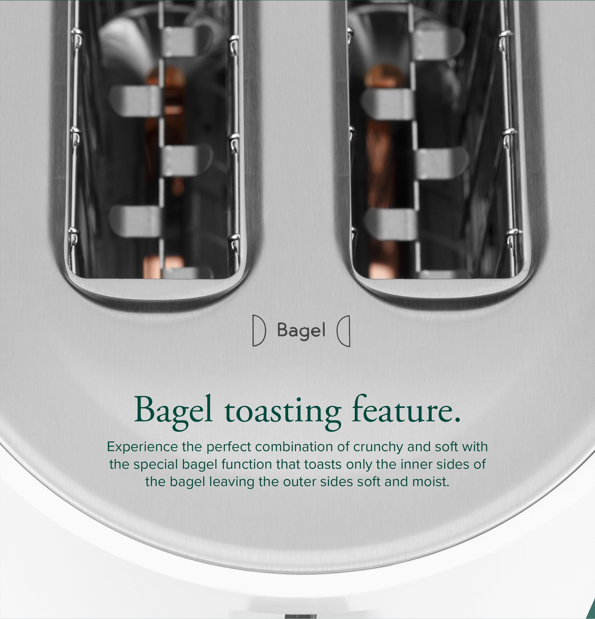 Bagel Toaster The unique bagel function toasts the inner side of the bagel and leaves the outside soft. An icon shows the proper way to insert the bagel to achieve perfect results