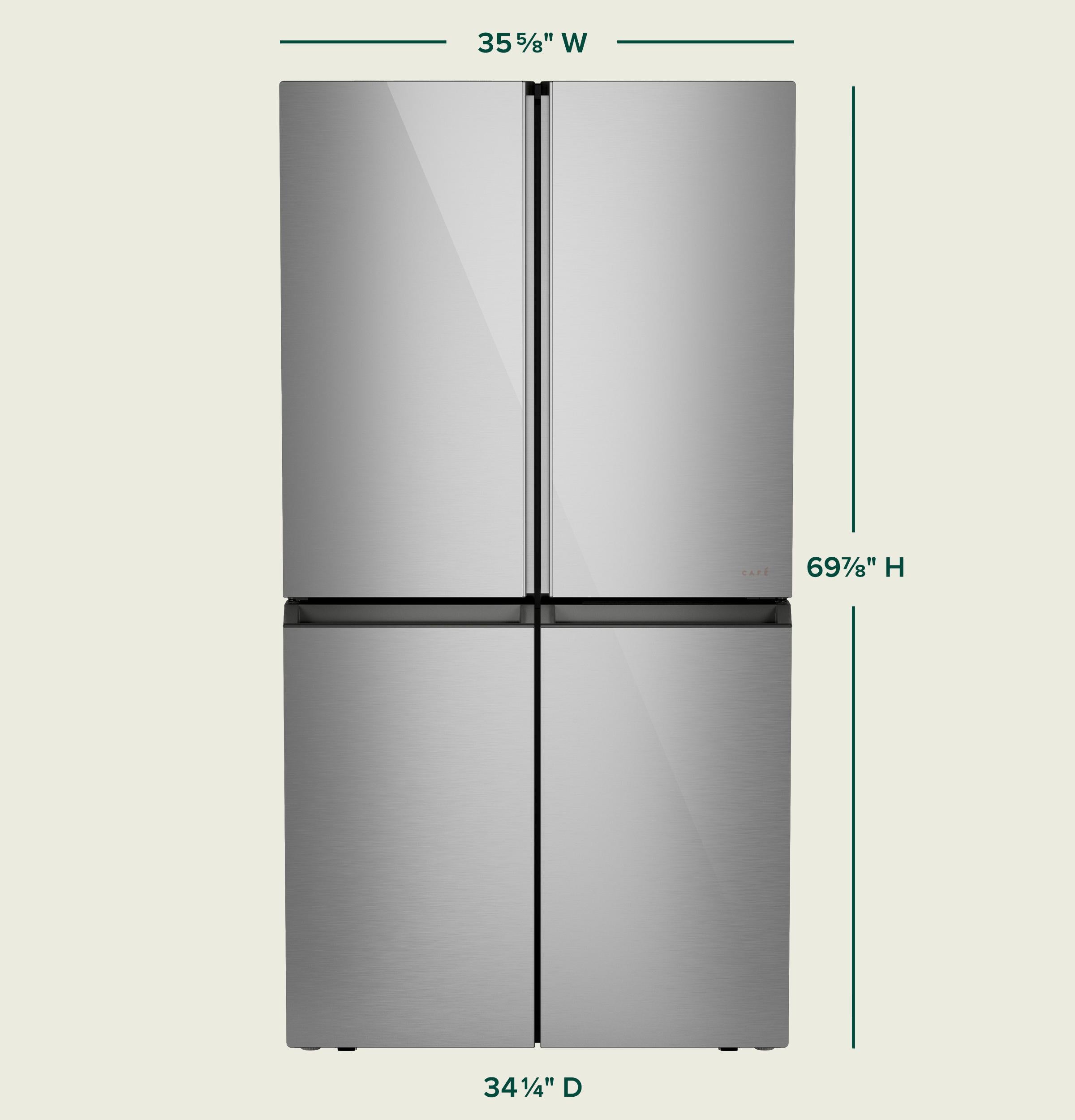 Elevate your kitchen with the Café™ 28.3 Cu. Ft. Smart Quad-Door Refrigerator (model CAE28DM5TS5). Its sleek Platinum Glass finish offers a contemporary look, while the Dual-Dispense AutoFill Pitcher ensures you have chilled, filtered water ready whenever you need it. The Fully Convertible Zone allows you to adjust temperatures from fresh food to full freeze, providing flexible storage options. With the largest ice storage in the industry, holding up to 12.5 lbs of filtered ice, you'll never run out during gatherings. The LED Light Wall spans the back, illuminating the interior for easy access to all your items. Built-in WiFi, powered by the SmartHQ app, keeps you connected, allowing for real-time notifications and control. This refrigerator is designed to meet diverse storage needs with a variety of compartments and adjustable features.