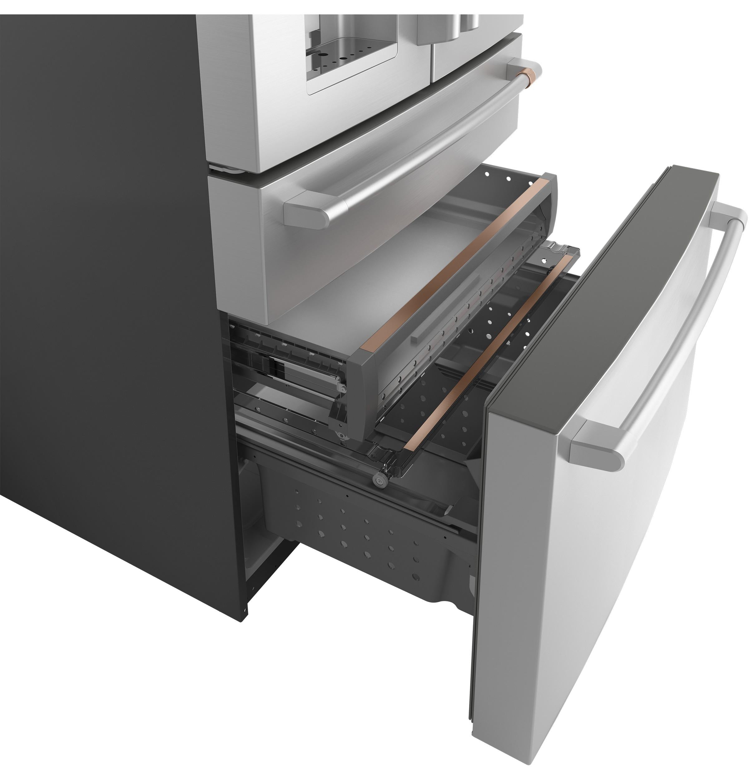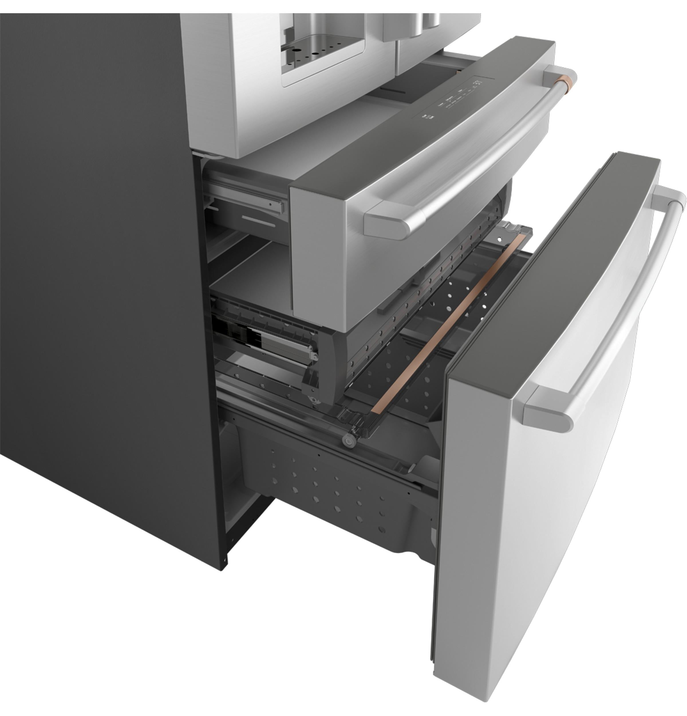 The Café CVE28DP2NS1 28.7 cu. ft. Smart French Door Refrigerator combines high-end aesthetics with cutting-edge technology to keep your food fresh and organized. Designed with a sleek stainless steel exterior and customizable hardware, this refrigerator seamlessly integrates into modern kitchens. The spacious interior includes flexible storage options, such as adjustable glass shelves, a full-width temperature-controlled drawer, and TwinChill™ evaporators that maintain separate climates in the fresh food and freezer compartments for optimal preservation.