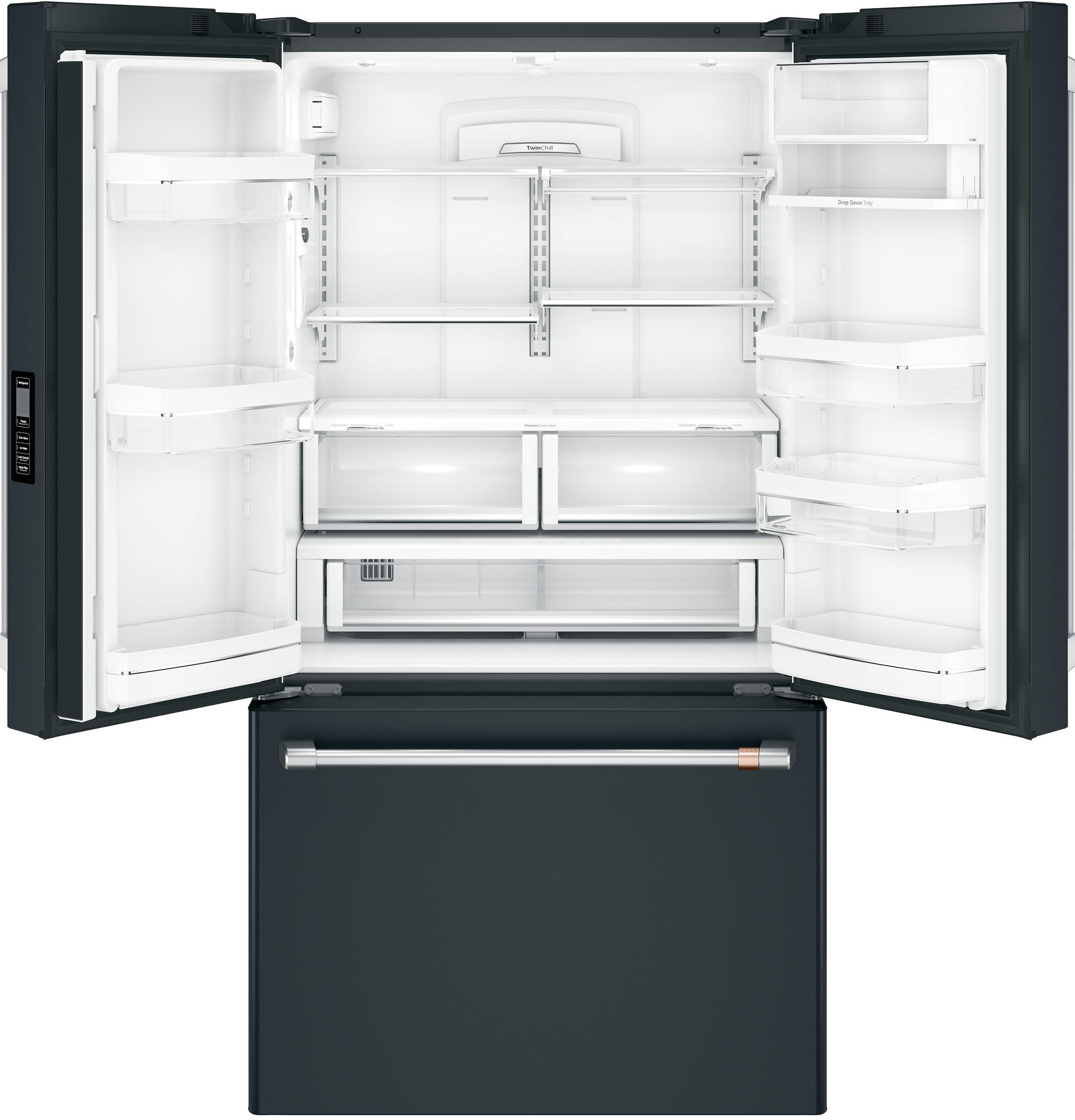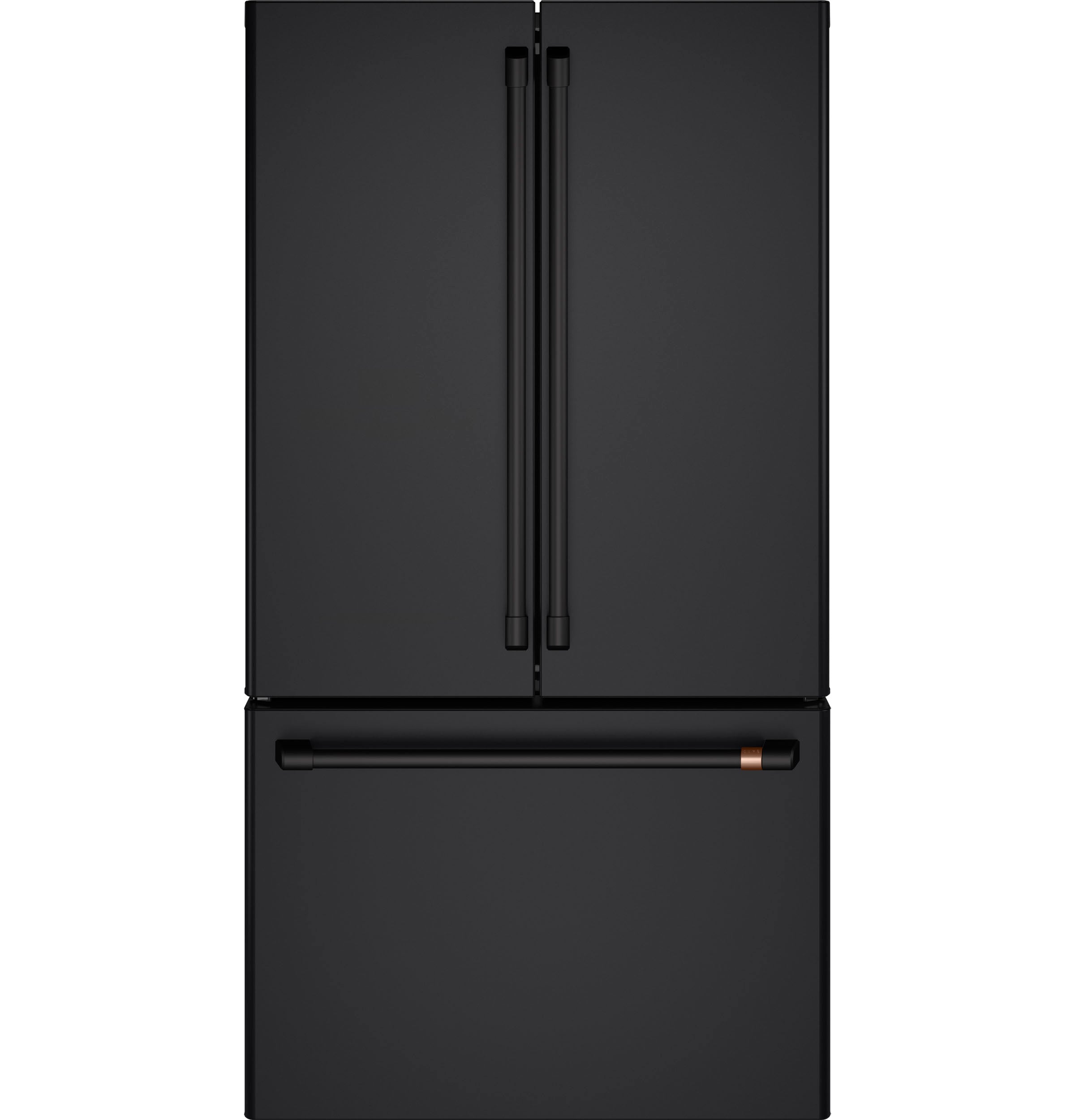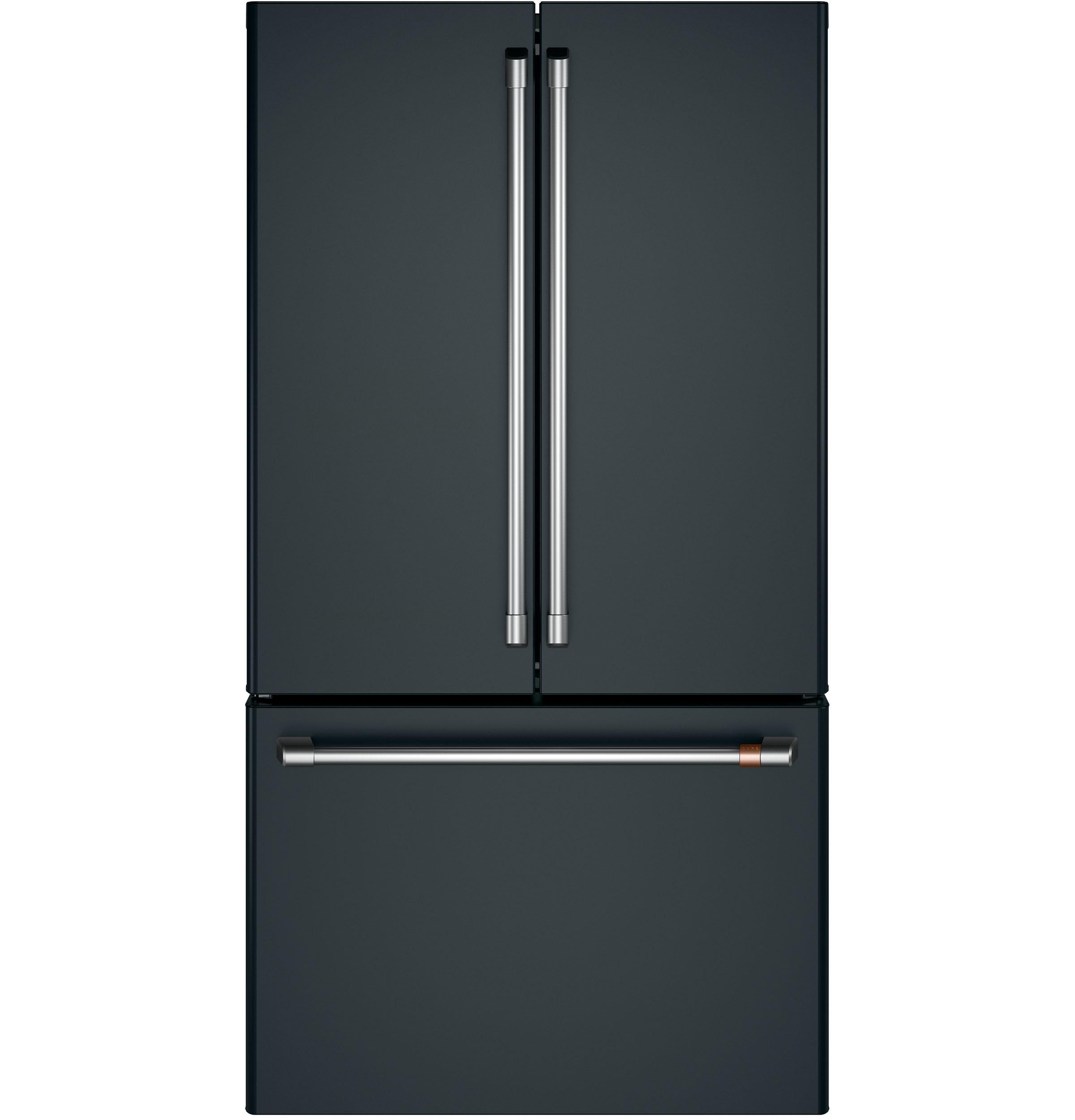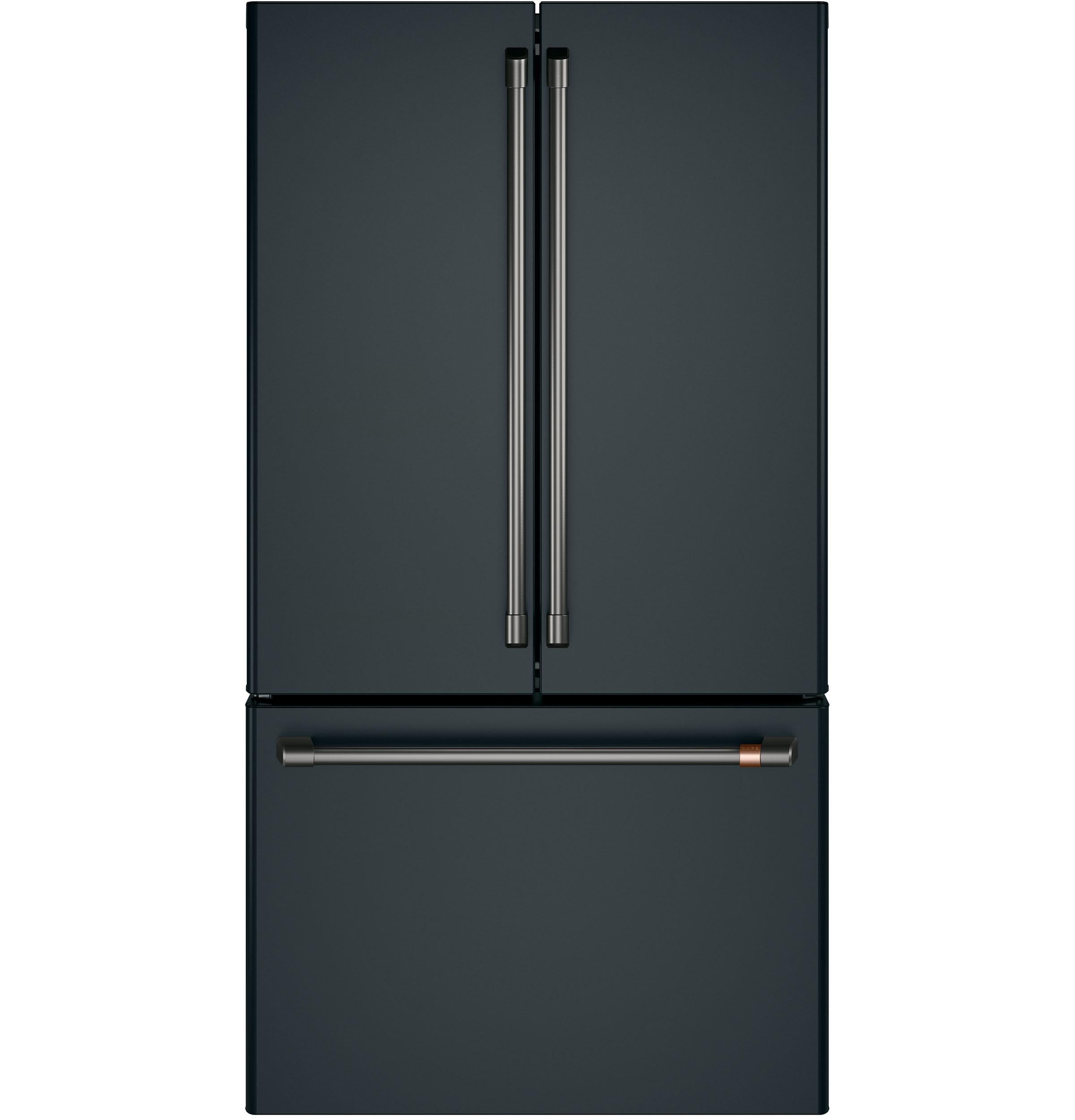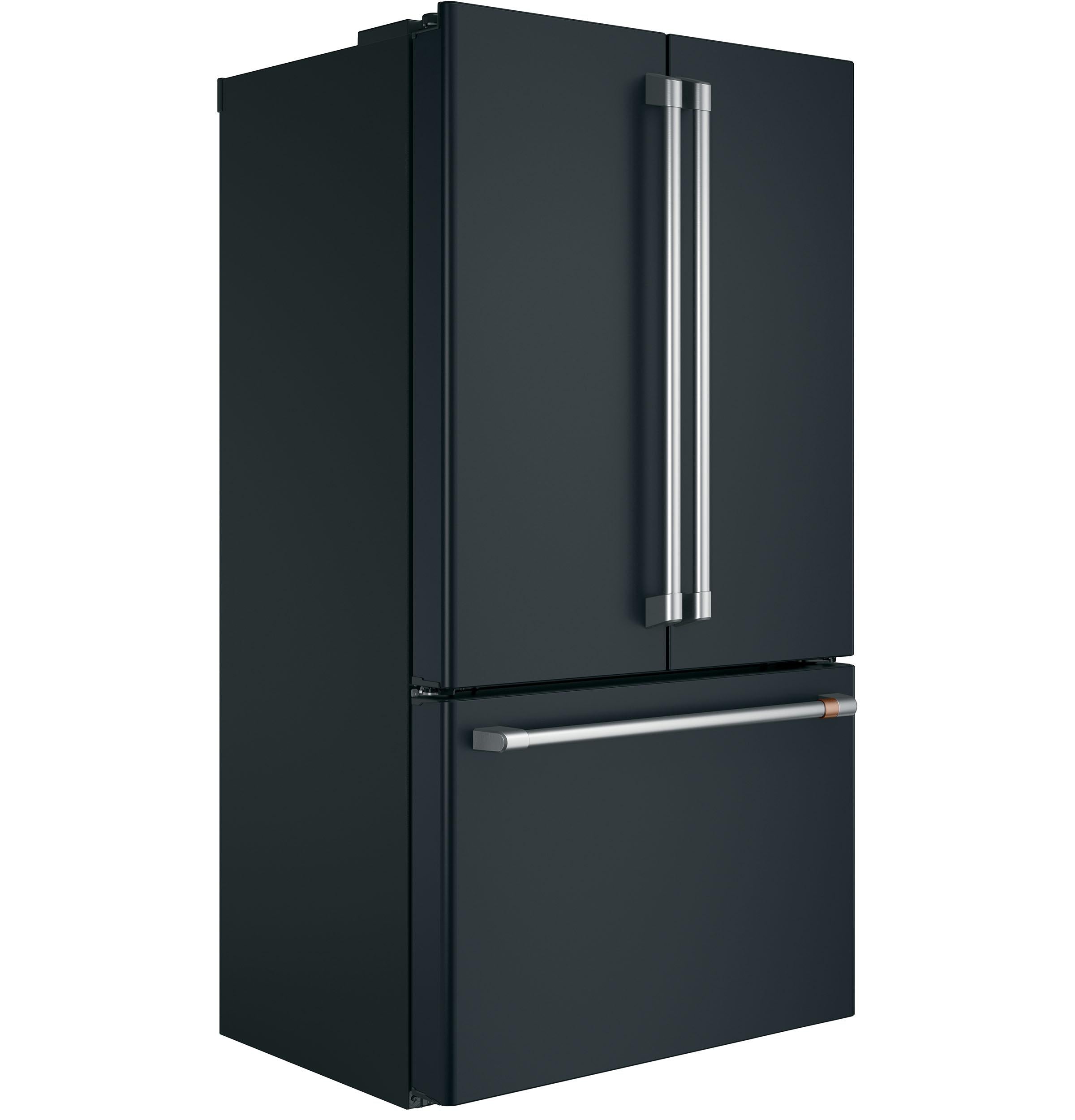 The Café CWE23SP3MD1 23.1 cu. ft. Counter-Depth French Door Refrigerator is designed for those who want a stylish yet high-performing appliance in their kitchen. With a Matte Black finish and customizable hardware, this refrigerator allows you to personalize your space while adding a premium aesthetic.
