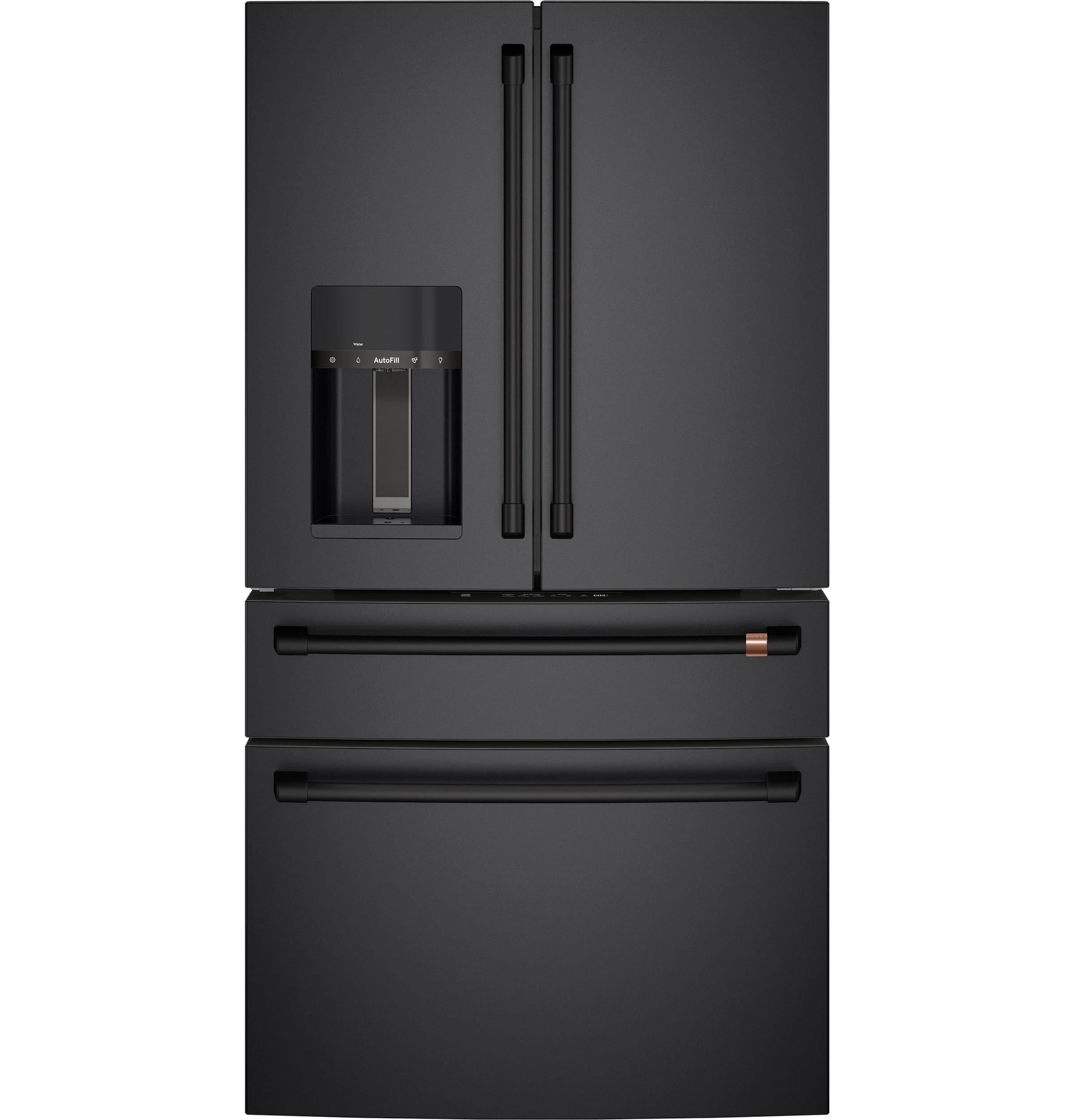 The Café CXE22DP3PD1 refrigerator offers a spacious 22.3 cu. ft. capacity within a counter-depth design that aligns seamlessly with your kitchen cabinetry. Its four-door French-door configuration includes a versatile convertible drawer with five temperature settings—Soft Freeze, Meat, Beverage, Snacks, and Wine—ranging from 23°F to 42°F, allowing customized storage for various items. The hands-free AutoFill feature ensures the perfect amount of filtered water is dispensed as you multitask. An LED light wall illuminates the interior uniformly, making it easy to locate items. Built-in Wi-Fi, powered by the SmartHQ app, enables you to receive alerts and control the refrigerator remotely. The Humidity Control System creates an optimal environment for leafy greens, keeping them fresh up to 2.5 times longer than standard vegetable drawers. The matte black finish with brushed stainless accents adds a touch of sophistication to any kitchen decor.