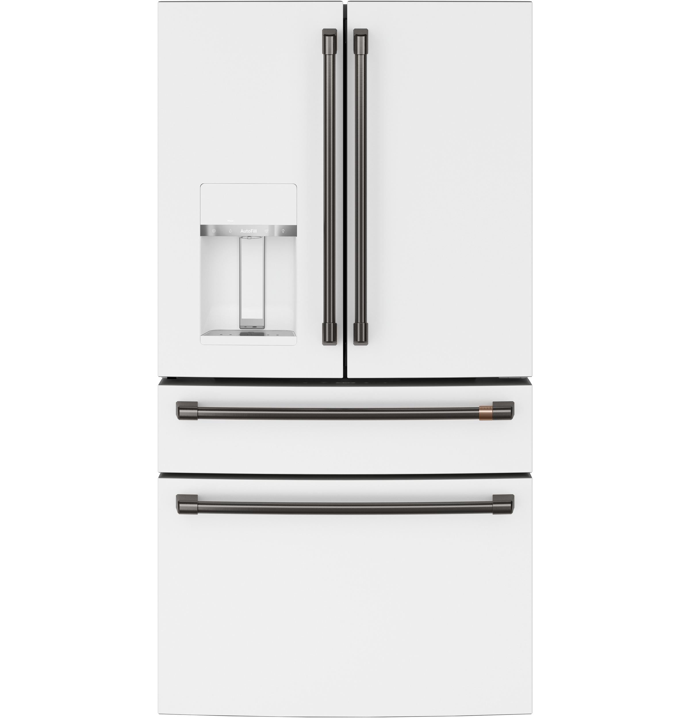 Elevate your kitchen with the Café™ 22.3 Cu. Ft. Smart Counter-Depth 4-Door French-Door Refrigerator (Model: CXE22DP4PW2). This refrigerator features a Convertible Drawer with Soft Freeze, providing five temperature settings—Soft Freeze, Meat, Beverage, Snacks, and Wine—ranging from 23°F to 42°F, allowing for flexible storage options. The LED Light Wall illuminates the interior with bright, uniform lighting, making it easy to find items. The Hands-Free AutoFill dispenser automatically fills your container with filtered water, letting you multitask with ease. Equipped with TwinChill™ Evaporators, it maintains separate climates in the fresh food and freezer sections to keep your food fresh longer. Integrated Wi-Fi connectivity powered by the SmartHQ™ app enables you to control and monitor your refrigerator remotely, receive alerts, and keep up with software updates. The counter-depth design fits flush with surrounding cabinetry for a seamless look, and customizable hardware options allow you to match your kitchen decor.
