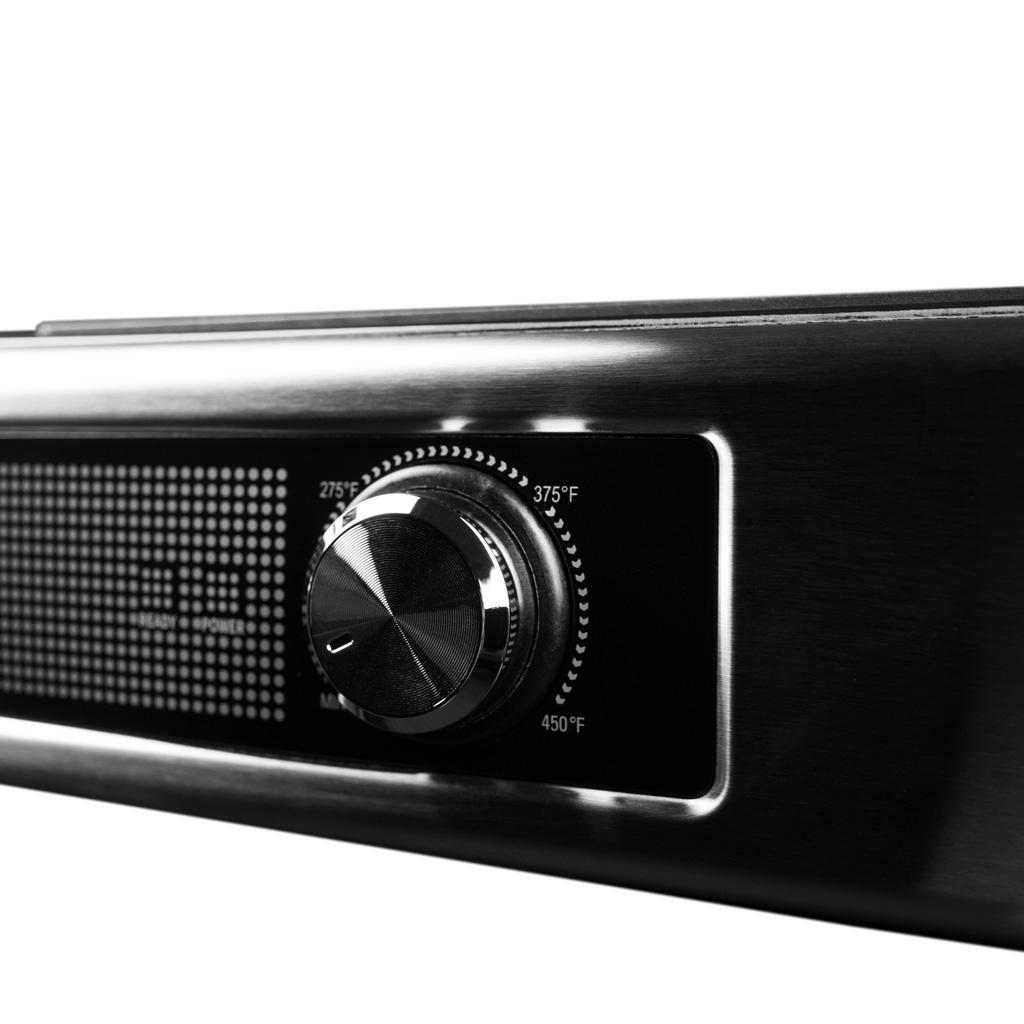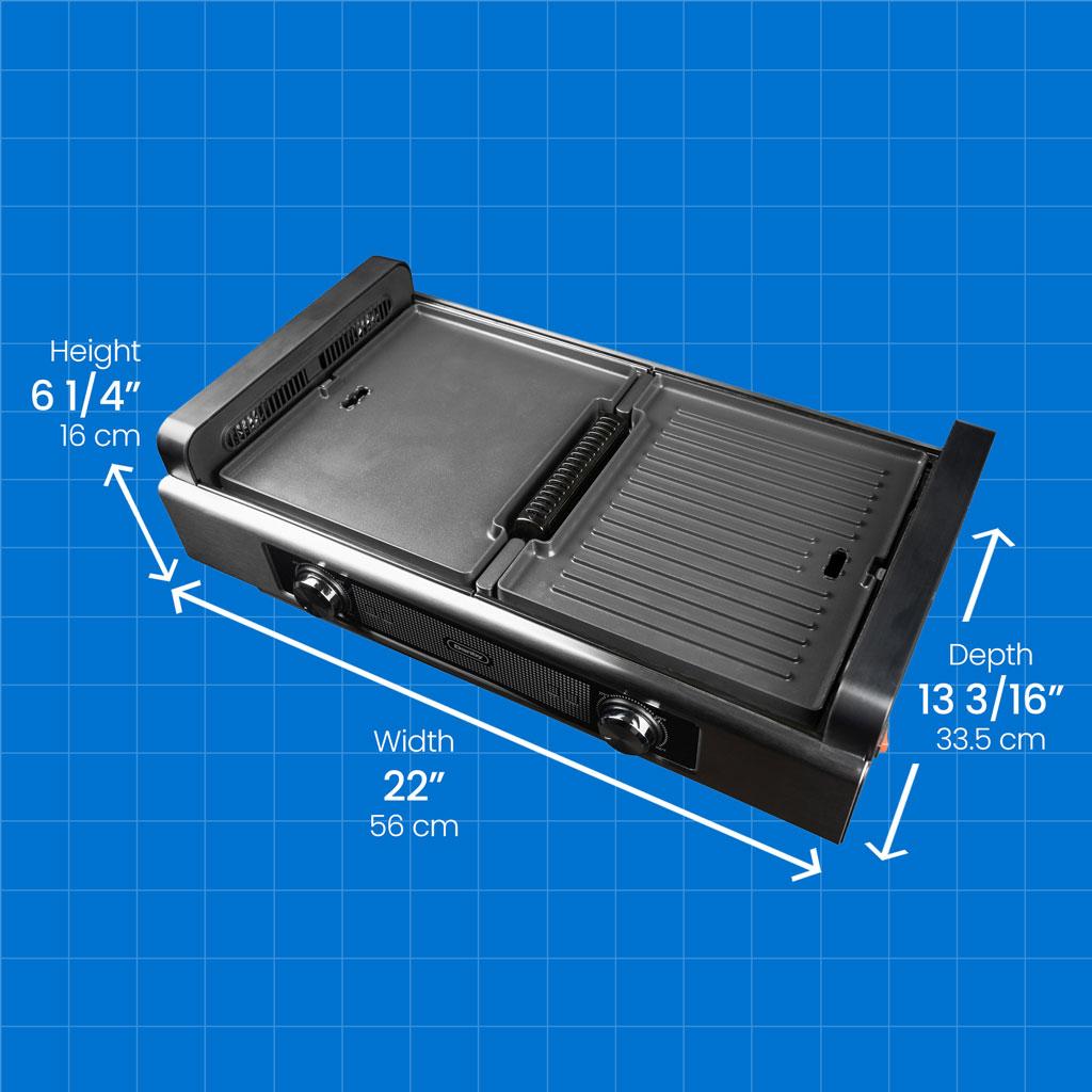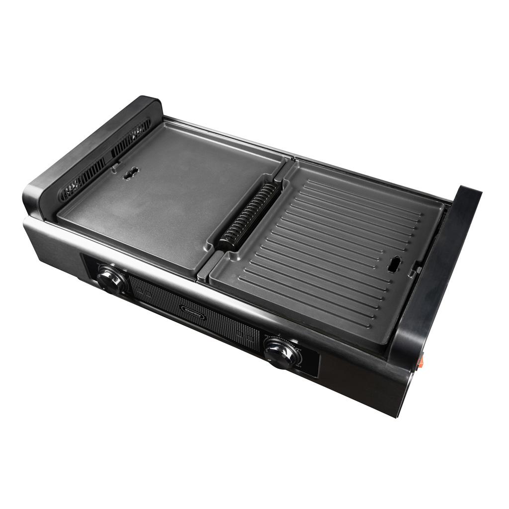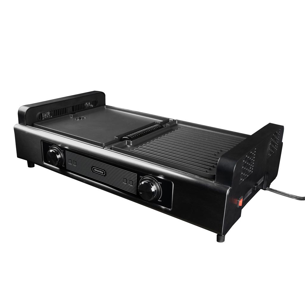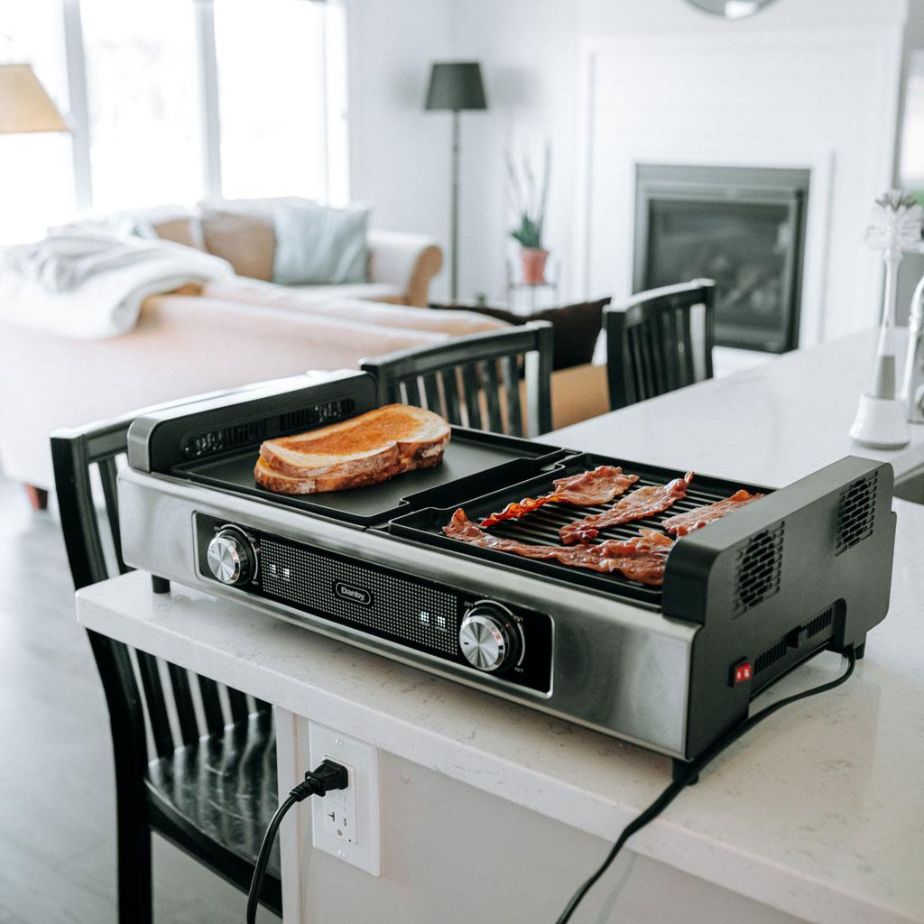 This electric grill uses a fan and filtration system to protect the home's air quality. To ensure a smokeless cooking experience, cooking contaminants are blown to the center of the grill and pulled downward through a filter, where they are captured. This model has reversible grill and griddle plates that can be set independently. Grill steaks on one side and toast the buns on the griddle on the other side! The two sides of this unit can be operated independently as well, with independent on/off and temperatures. This indoor grill heats up to an even, constant temperature range of 194-392F (90-200C) across the grill, avoiding burnt spots or rare centers. With 1800 watts of power, you can enjoy fast direct heating in minutes. Each dishwasher safe plate can be ejected with the push of a button for easy clean-up. The oil collection tray allows for healthier dishes and reduces a countertop mess. Always know when the grill is ready to go with a convenient preheat function that includes a ready light located on the front of the unit.