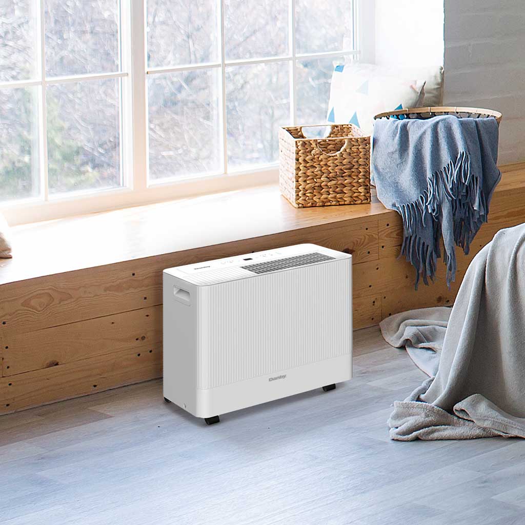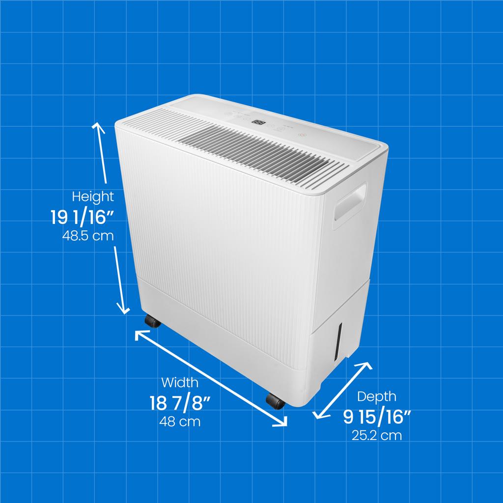 Introducing the Danby DDR050BSPWDB 50-Pint Dehumidifier, your ultimate solution for controlling humidity in spaces up to 3,000 square feet. With its Wi-Fi Connect feature and bucket full indicator in the app, monitoring and managing humidity levels has never been easier. The improved vertical pump allows the unit to pump water directly into a sink or drain, providing hassle-free operation. Enjoy continuous operation with the direct drain feature, while experiencing quiet operation at just 49 dB. Customize your comfort with the powerful 2-speed fan, and rest assured knowing this unit is ENERGY STAR certified for energy efficiency. With electronic controls and an LED display, programming the 24-hour timer is a breeze. Experience peace of mind with the auto restart function that kicks in after a power failure, and say goodbye to frost build-up with the auto de-icer feature. Operate the unit in temperatures as low as 5C with the low temp function, while the smart dehumidify feature automatically adjusts room humidity based on ambient temperature. Keep maintenance simple with the reusable, and washable filter. With easy-to-move castors and integrated handles, transporting this dehumidifier from room to room is effortless. Plus, enjoy the added assurance of a 2-year parts and labor warranty with carry-in service.