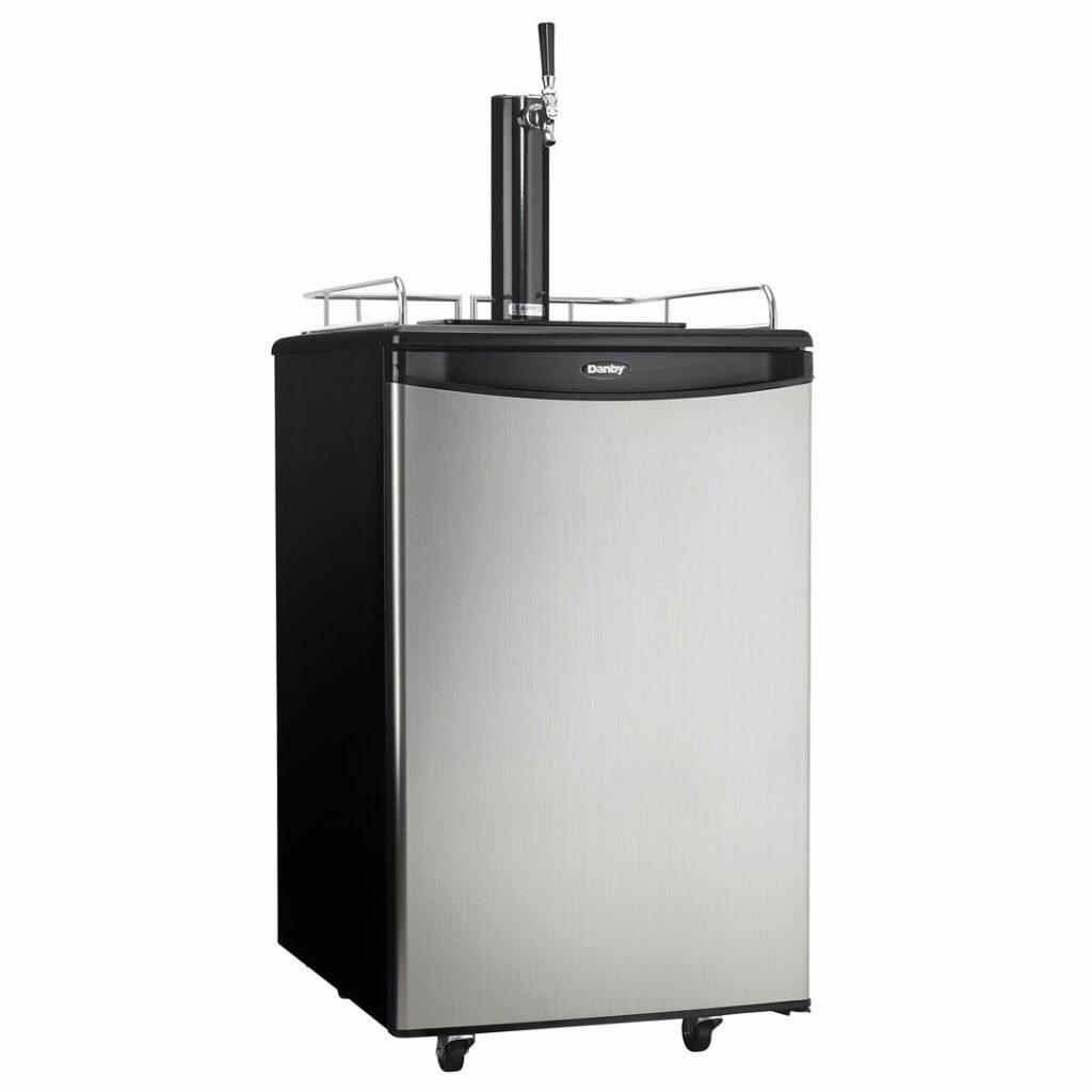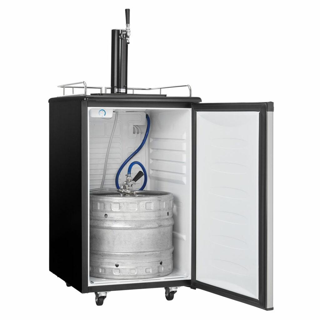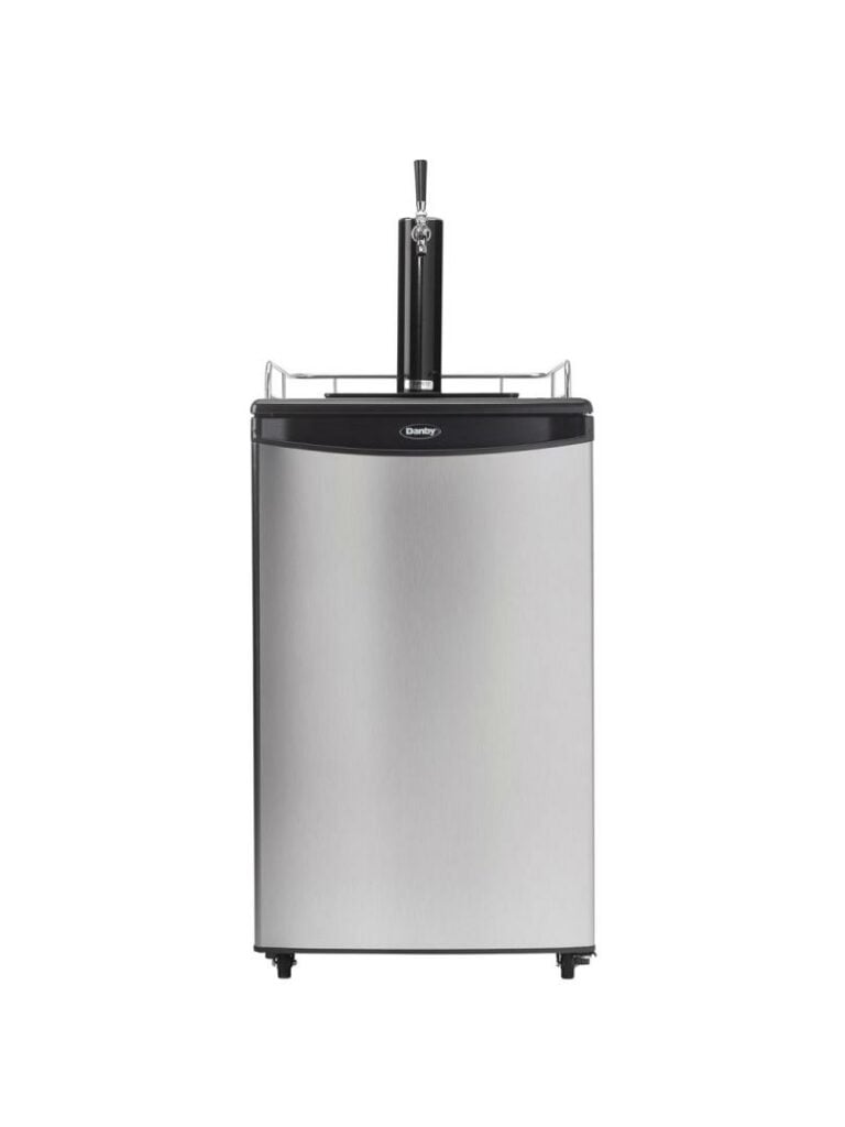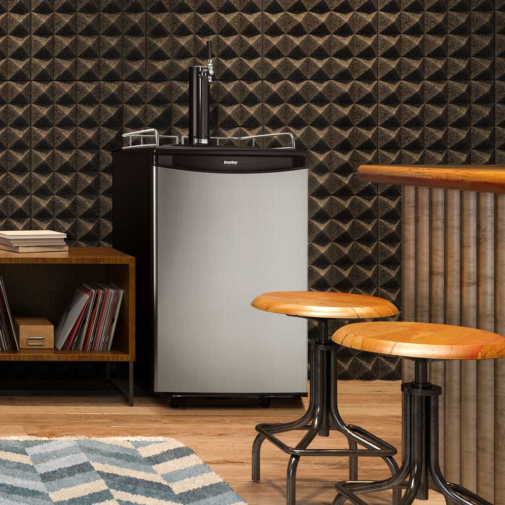 Whether you are a beer drinker or an avid entertainer you will be the best party host with this ultimate indoor freestanding kegerator by Danby Appliances. This single tap keg cooler is an exceptional addition to any wet bar, game room or man cave, and provides the convenience of cold beer on tap at once. Has an automatic-defrosting system which makes for an excellent product with hassle-free maintenance. This keg cooler includes a single gauge regulator, CO2 tank and all required hardware. It has a precise mechanical-thermostat to keep your beer cold and a spotless-steel finish resembling stainless-steel but much easier to clean. Did we mention it has a scratch-resistant worktop? Furthermore, this unit includes an American Sankey coupler, a chrome guard rail and drip tray, and optional swivel castors for easy portability. The door hinge is reversible which allows you to adjust it for either left or right-handed opening.