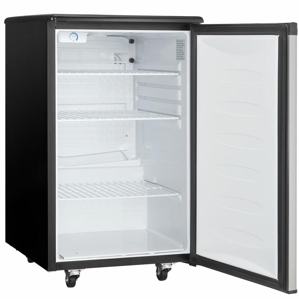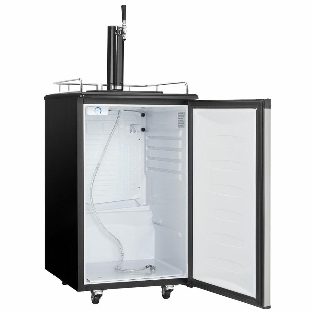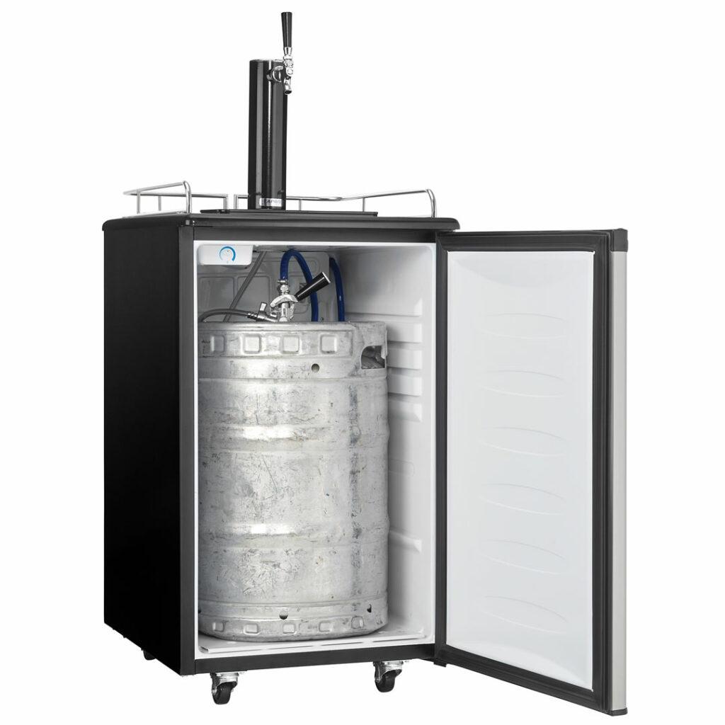 Whether you are a beer drinker or an avid entertainer you will be the best party host with this ultimate indoor freestanding kegerator by Danby Appliances. This single tap keg cooler is an exceptional addition to any wet bar, game room or man cave, and provides the convenience of cold beer on tap at once. Has an automatic-defrosting system which makes for an excellent product with hassle-free maintenance. This keg cooler includes a single gauge regulator, CO2 tank and all required hardware. It has a precise mechanical-thermostat to keep your beer cold and a spotless-steel finish resembling stainless-steel but much easier to clean. Did we mention it has a scratch-resistant worktop? Furthermore, this unit includes an American Sankey coupler, a chrome guard rail and drip tray, and optional swivel castors for easy portability. The door hinge is reversible which allows you to adjust it for either left or right-handed opening.
