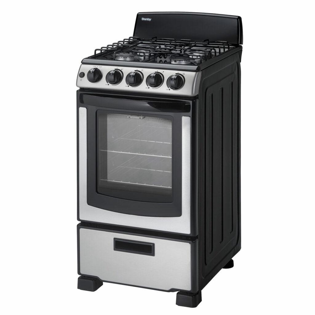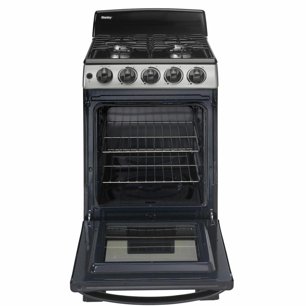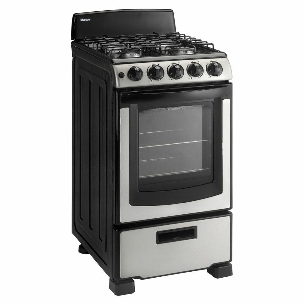 Cooking up your favorite dishes is always a breeze with this compact gas range by Danby Designer. This slim and elegant model is just 20 in. wide (50.8 cm) which makes it ideal for remote locations and smaller kitchen spaces. Its compatible with both natural gas and liquid propane and is controlled by a clever electronic ignition unit along with push-and-burn safety knobs. There is a pair of sturdy and durable racks in the 2.3 cu. ft. capacity oven along with a bright interior light, fashionable window and broiler drawer. The range provides four 9,100-BTU open burners and one 13,000 BTU oven burner as well as an integrated lip to contain any spills. This unit doesn't take much to clean due to its black and stainless steel, scratch-resistant porcelain surface and large backsplash. In addition, the gas range boasts a 12-month warranty on parts and labor along with convenient in-home service.