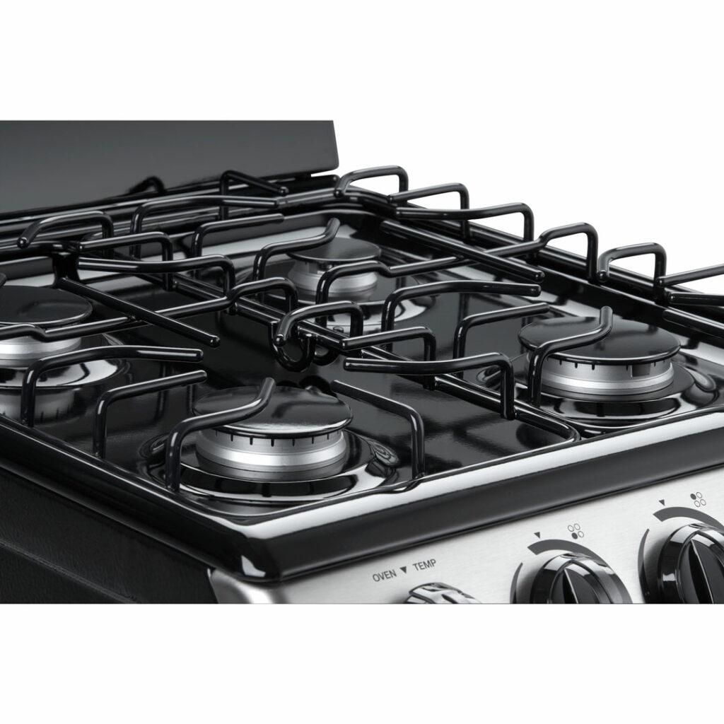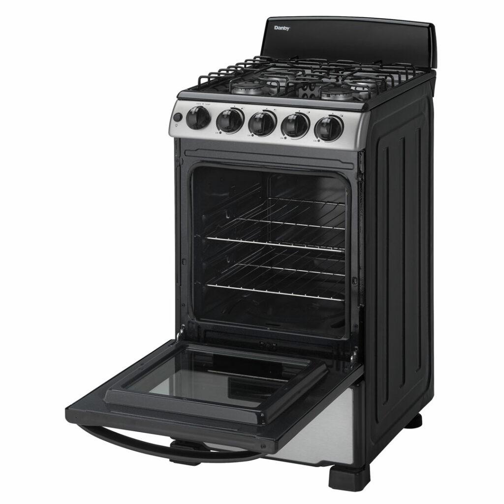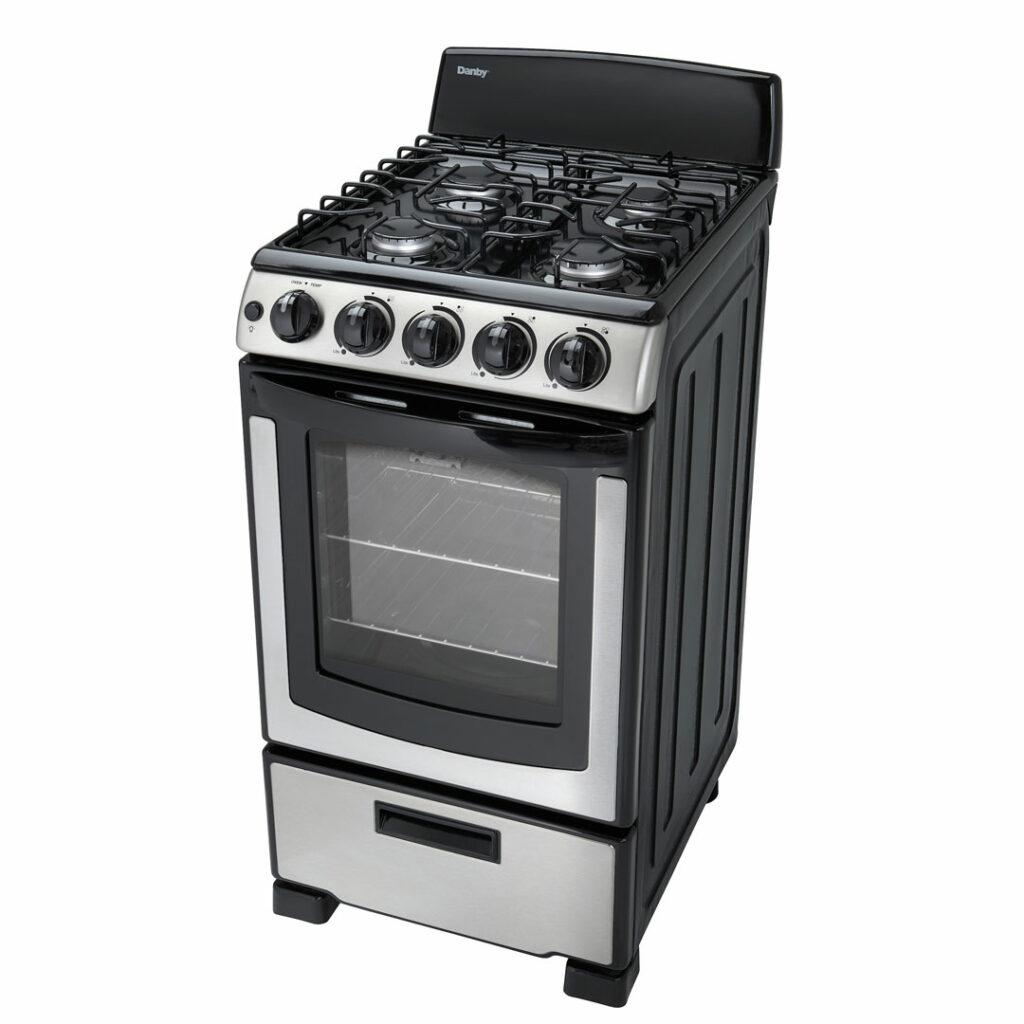 Cooking up your favorite dishes is always a breeze with this compact gas range by Danby Designer. This slim and elegant model is just 20 in. wide (50.8 cm) which makes it ideal for remote locations and smaller kitchen spaces. Its compatible with both natural gas and liquid propane and is controlled by a clever electronic ignition unit along with push-and-burn safety knobs. There is a pair of sturdy and durable racks in the 2.3 cu. ft. capacity oven along with a bright interior light, fashionable window and broiler drawer. The range provides four 9,100-BTU open burners and one 13,000 BTU oven burner as well as an integrated lip to contain any spills. This unit doesn't take much to clean due to its black and stainless steel, scratch-resistant porcelain surface and large backsplash. In addition, the gas range boasts a 12-month warranty on parts and labor along with convenient in-home service.