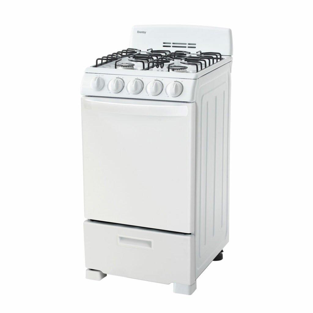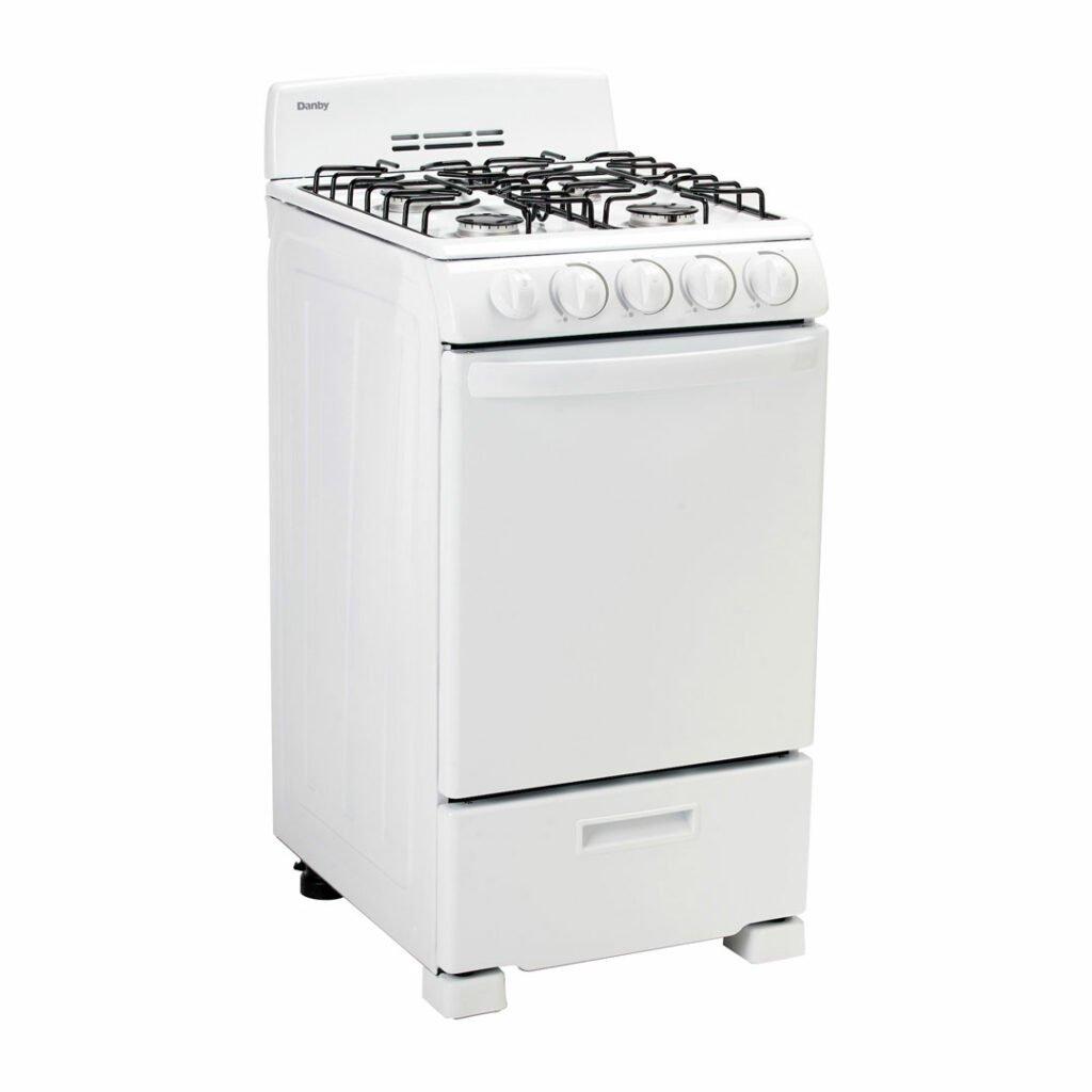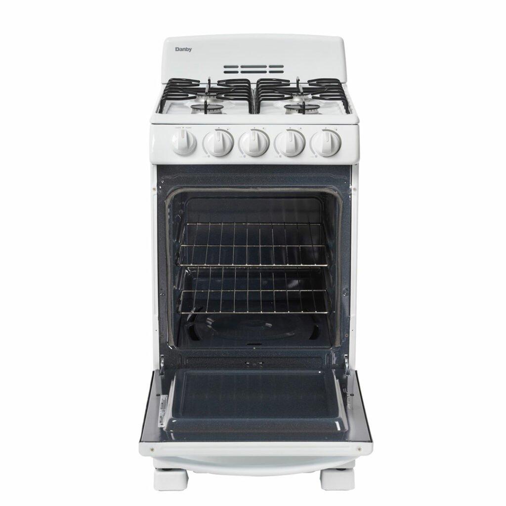 You don't need to be a world-class chef to enjoy cooking with this ultra-compact gas range by Danby. This attractive model may only be 20-inches wide, but it comes with everything you need for fine dining. This includes an oven and four burners. This trendy appliance provides 2.3 cubic feet of oven space making it ideal for small-space living such as apartments and cottages. It boasts an easy-to-clean pyrolytic blue oven interior for easy clean up. The oven dishes out a powerful 13,000 BTU of baking power. This dependable gas range comes with an angular control panel with push-and-turn front knobs for added safety and includes two oven racks with four adjustable positions and safety stops for optimal cooking. This range is ADA compliant and offers a 12-month warranty on parts and labor with convenient in-home service