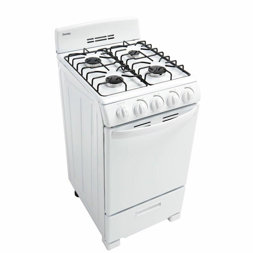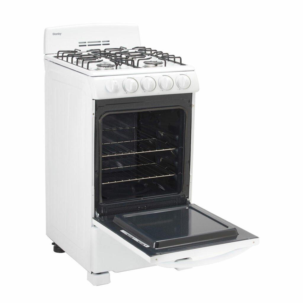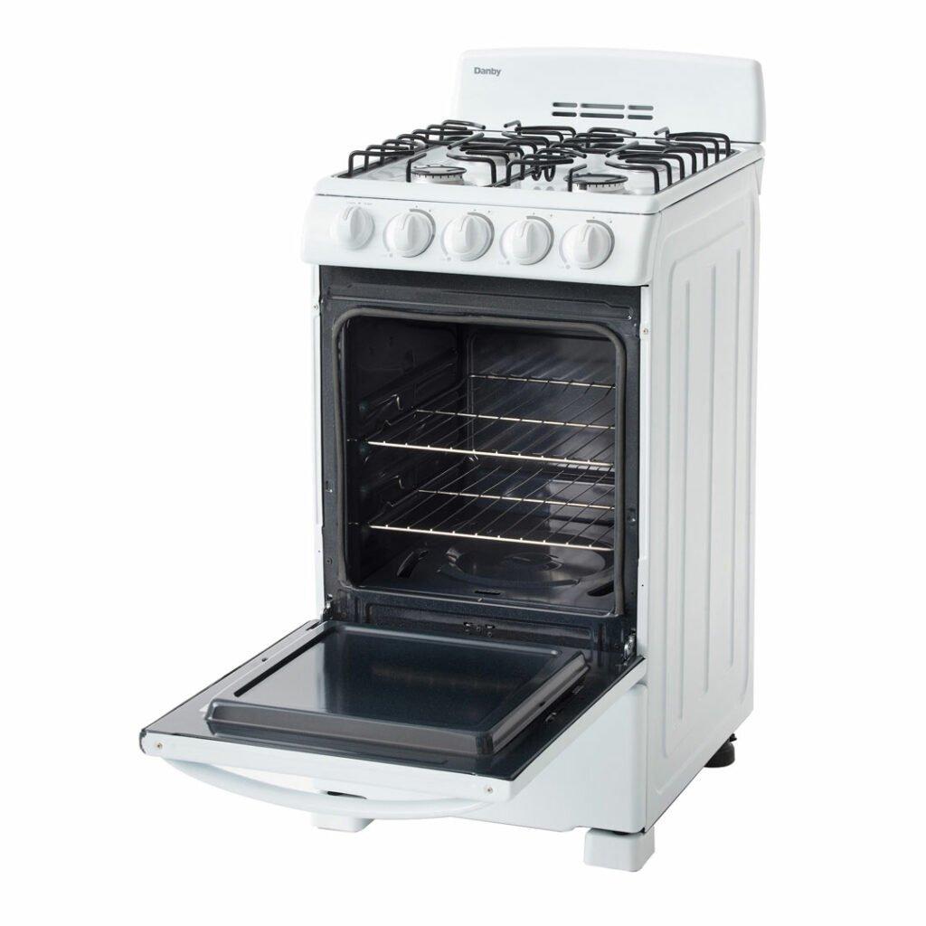 You don't need to be a world-class chef to enjoy cooking with this ultra-compact gas range by Danby. This attractive model may only be 20-inches wide, but it comes with everything you need for fine dining. This includes an oven and four burners. This trendy appliance provides 2.3 cubic feet of oven space making it ideal for small-space living such as apartments and cottages. It boasts an easy-to-clean pyrolytic blue oven interior for easy clean up. The oven dishes out a powerful 13,000 BTU of baking power. This dependable gas range comes with an angular control panel with push-and-turn front knobs for added safety and includes two oven racks with four adjustable positions and safety stops for optimal cooking. This range is ADA compliant and offers a 12-month warranty on parts and labor with convenient in-home service