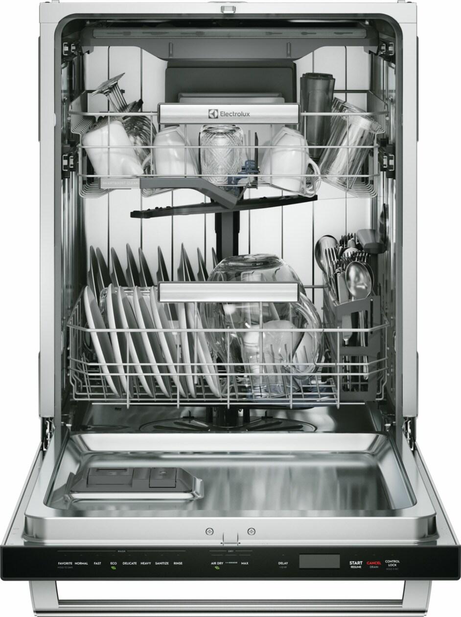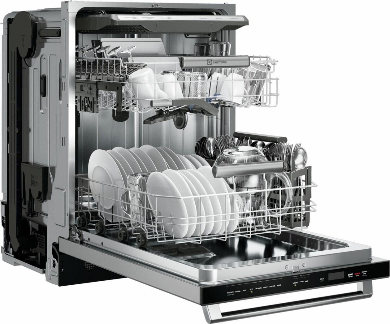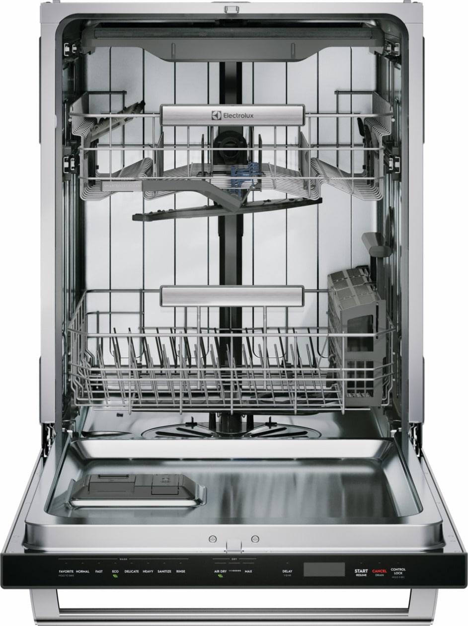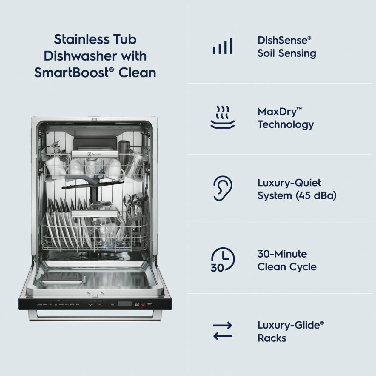 The Electrolux EDSH4944BS is a premium 24-inch built-in dishwasher designed to deliver exceptional cleaning performance and efficiency. Its robust stainless steel tub ensures durability and a sleek appearance. The innovative SmartBoost™ Clean Technology pre-mixes detergent with water before it reaches your dishes, effectively removing tough, baked-on foods. With an ultra-quiet operation at 45 dBA, this dishwasher runs discreetly in any kitchen environment. It offers eight versatile wash cycles, including a 30-Minute Clean cycle for quick cleaning between courses. The spacious interior accommodates up to 14 place settings, making it ideal for families and entertaining. Additional features include Max Dry Technology for superior drying performance, DishSense® Sensor Technology that adjusts the cycle based on soil levels, and a convenient third-level rack for utensils and culinary tools. Elevate your kitchen experience with the efficiency and advanced features of the Electrolux EDSH4944BS.