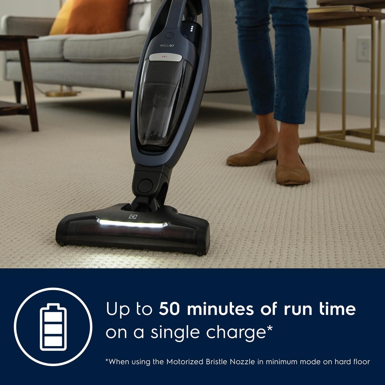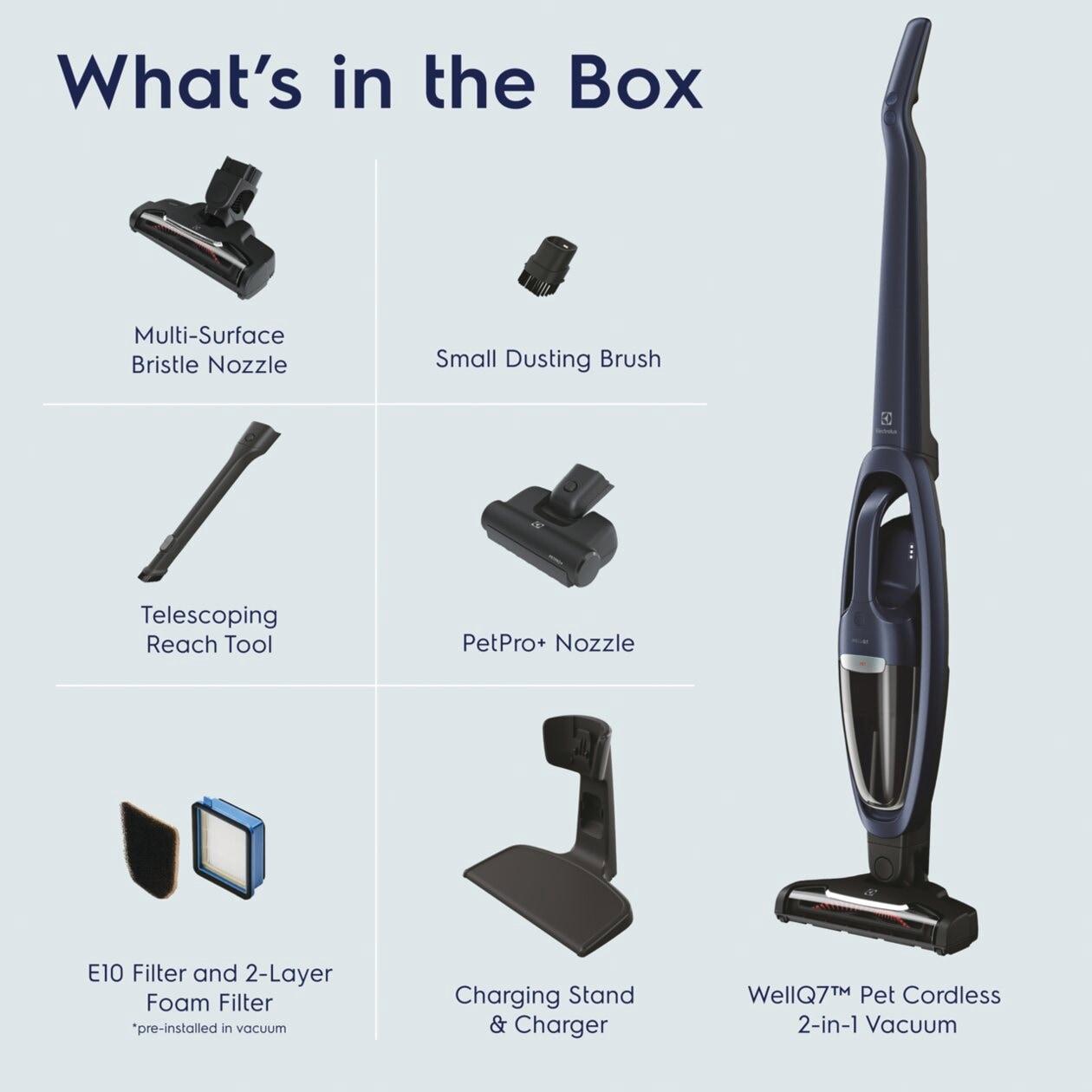 The Electrolux WellQ7(TM) Cordless 2-in-1 vacuum features a 5-step filtration system with integrated axial cyclonic technology that efficiently separates dirt and dust from the air helping to reduce clogging and provide a consistent experience throughout the entire clean. With the detachable handset you can easily attach the PetPro+ Nozzle to remove pet hair from furniture and other upholstered surfaces.