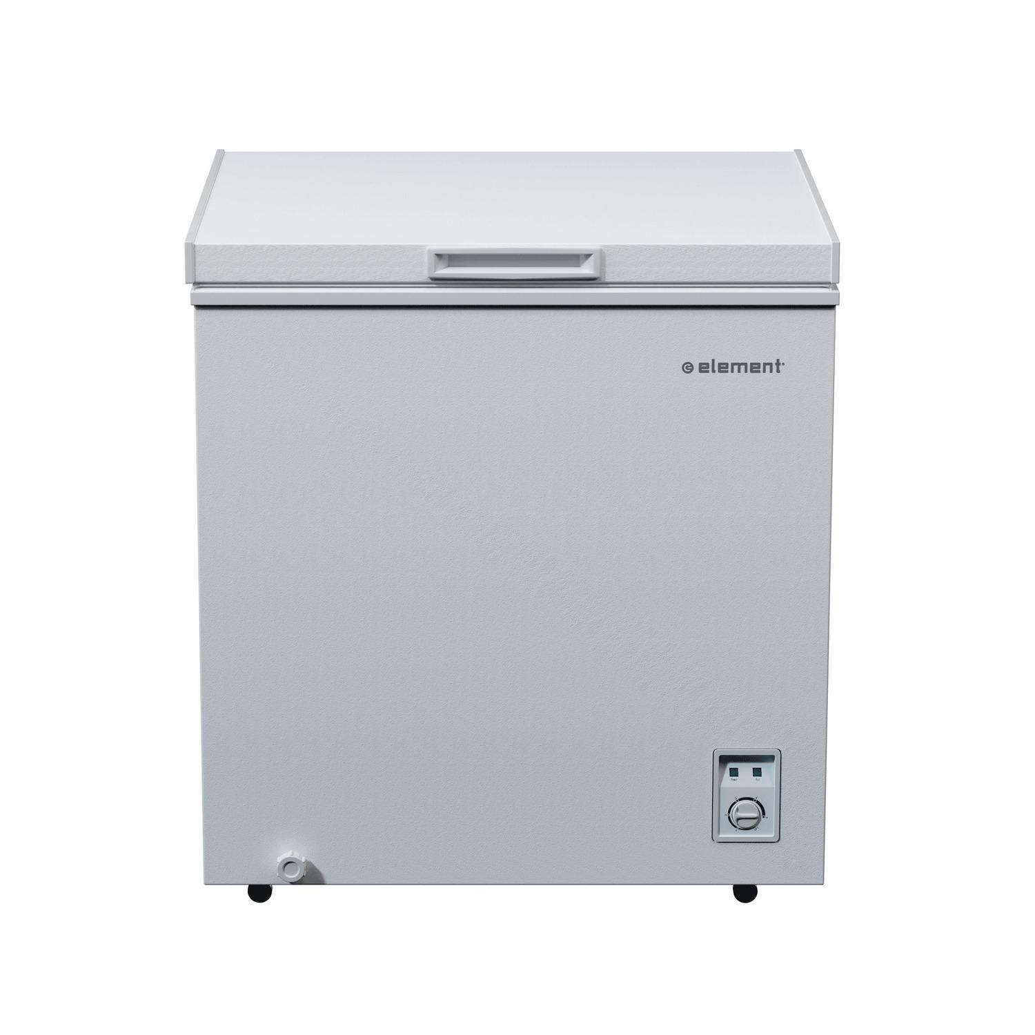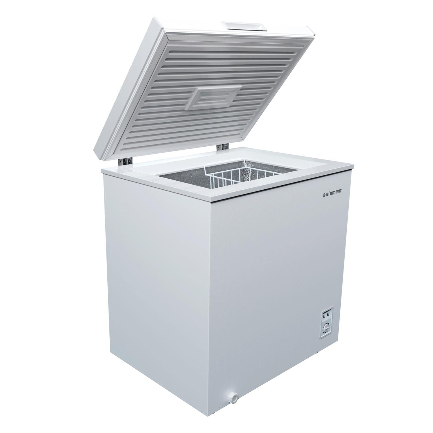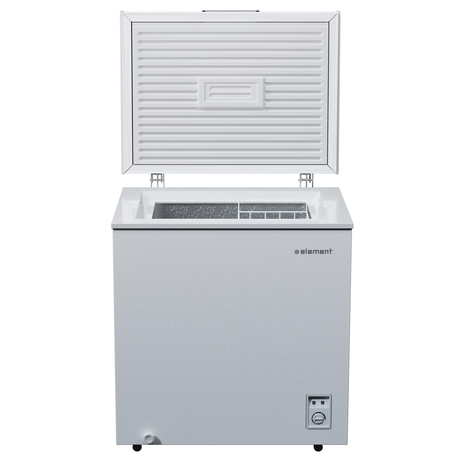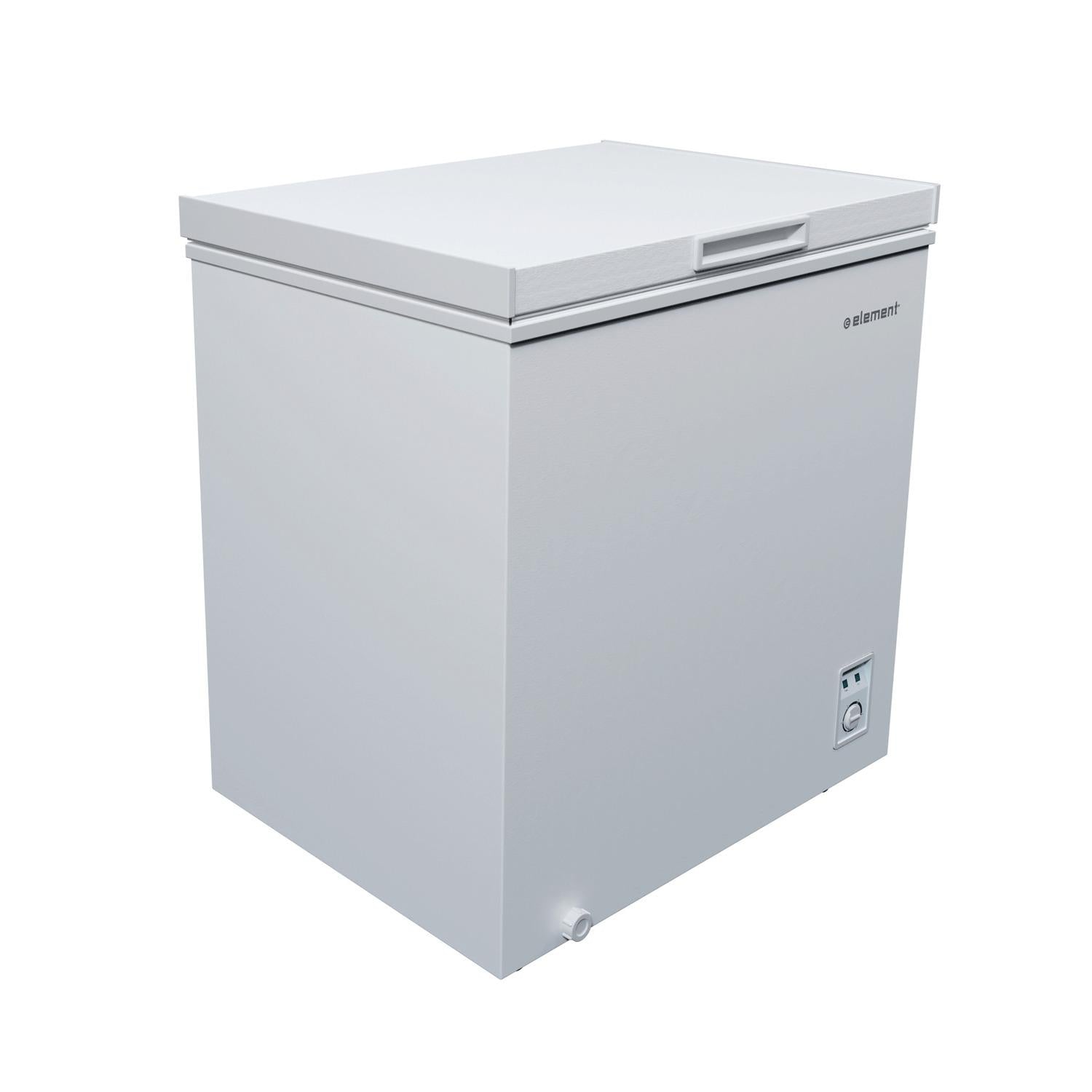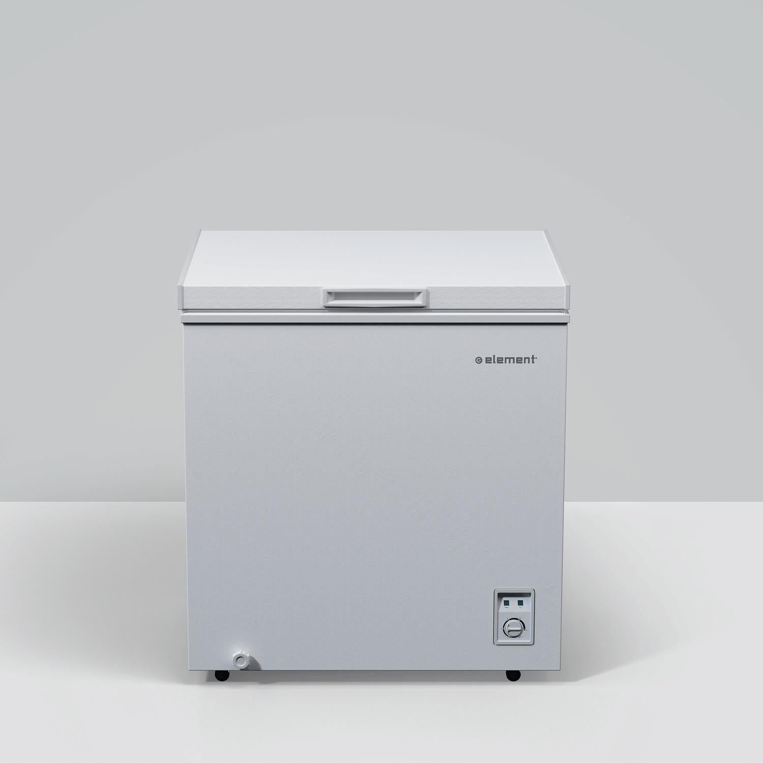 Are you running out of fridge space? The 5 cu. ft. Chest Freezer from Element Electronics has plenty of storage for all your frozen food favorites, yet compact enough to easily fit in your basement, storage room, or garage. The white powder coating finish and recessed handle creates a classic, streamlined look. Organize your small and bulky items efficiently with the removable wire storage basket. Set the temperature without needing to open the lid with the easy-to-use control dial found on the outside of the freezer. If you need to defrost, the chest freezer directs melted ice toward a drain for no-mess cleanup. Plus, Element freezers are Department of Energy-certified, using technology to lower Global Warming Potential, reduce energy usage, and keep electricity bills down. Load up on meat in bulk, store extra garden produce, or rock the clearance sale on your favorite frozen treat. Whatever you need to stay cold, maximize your freezer space with this 5 cu. ft. Chest Freezer.