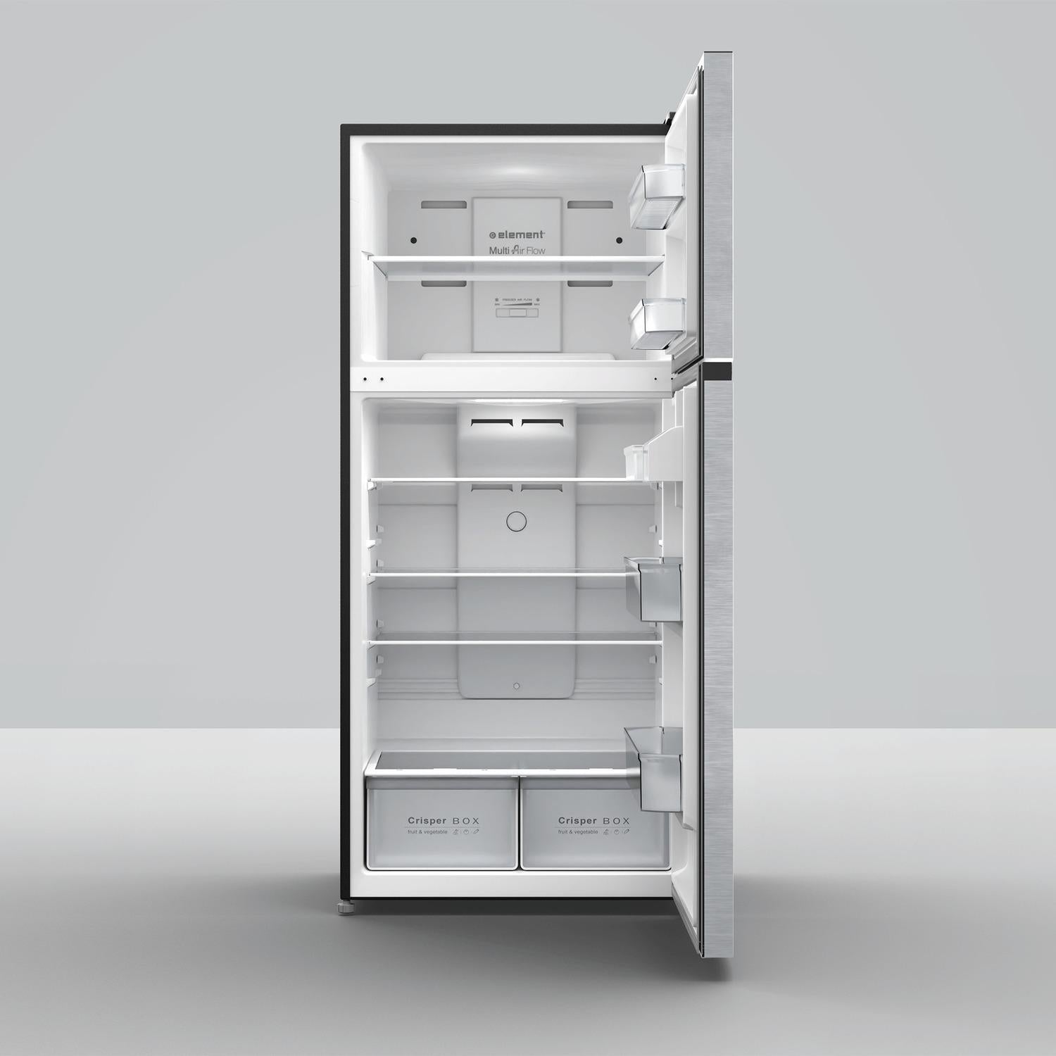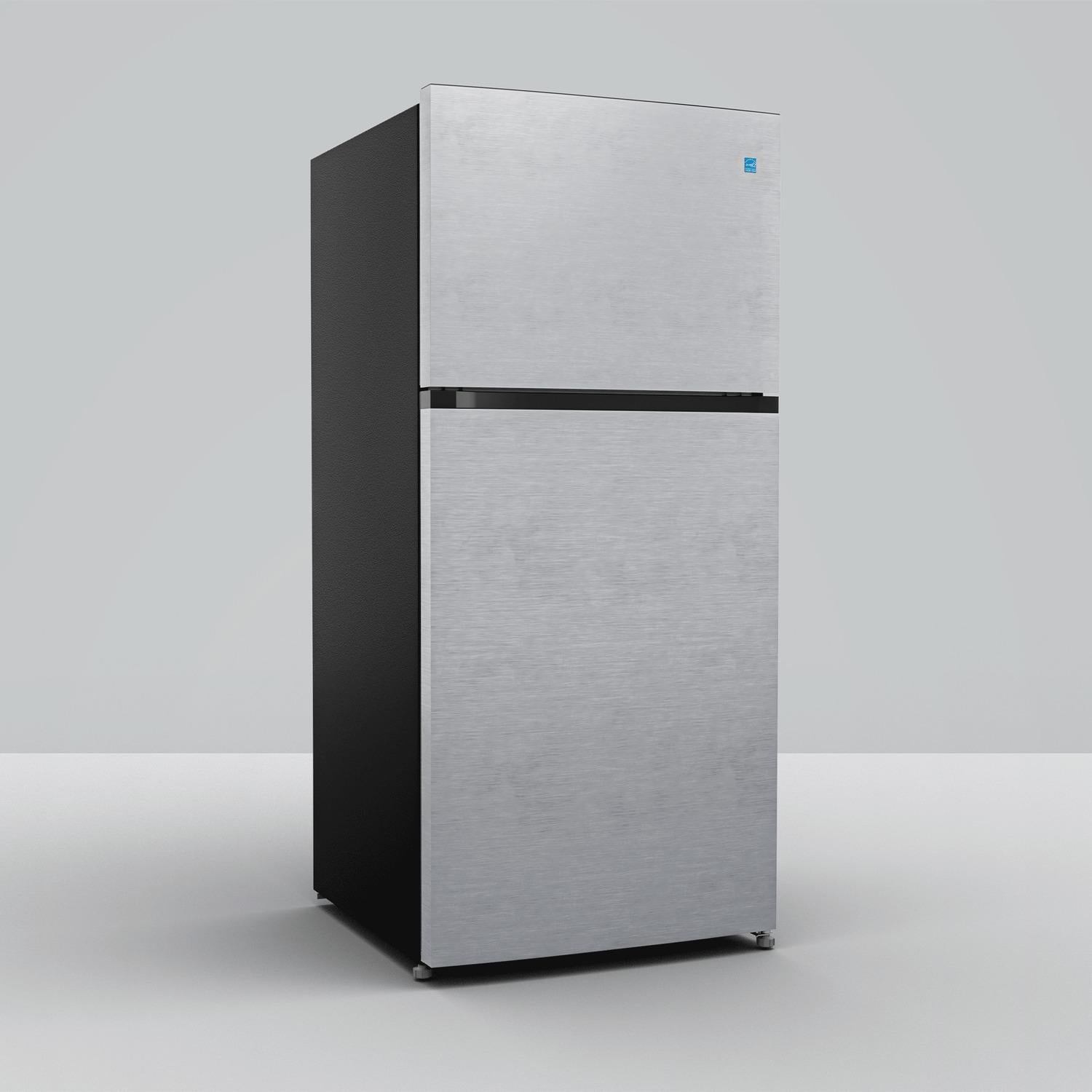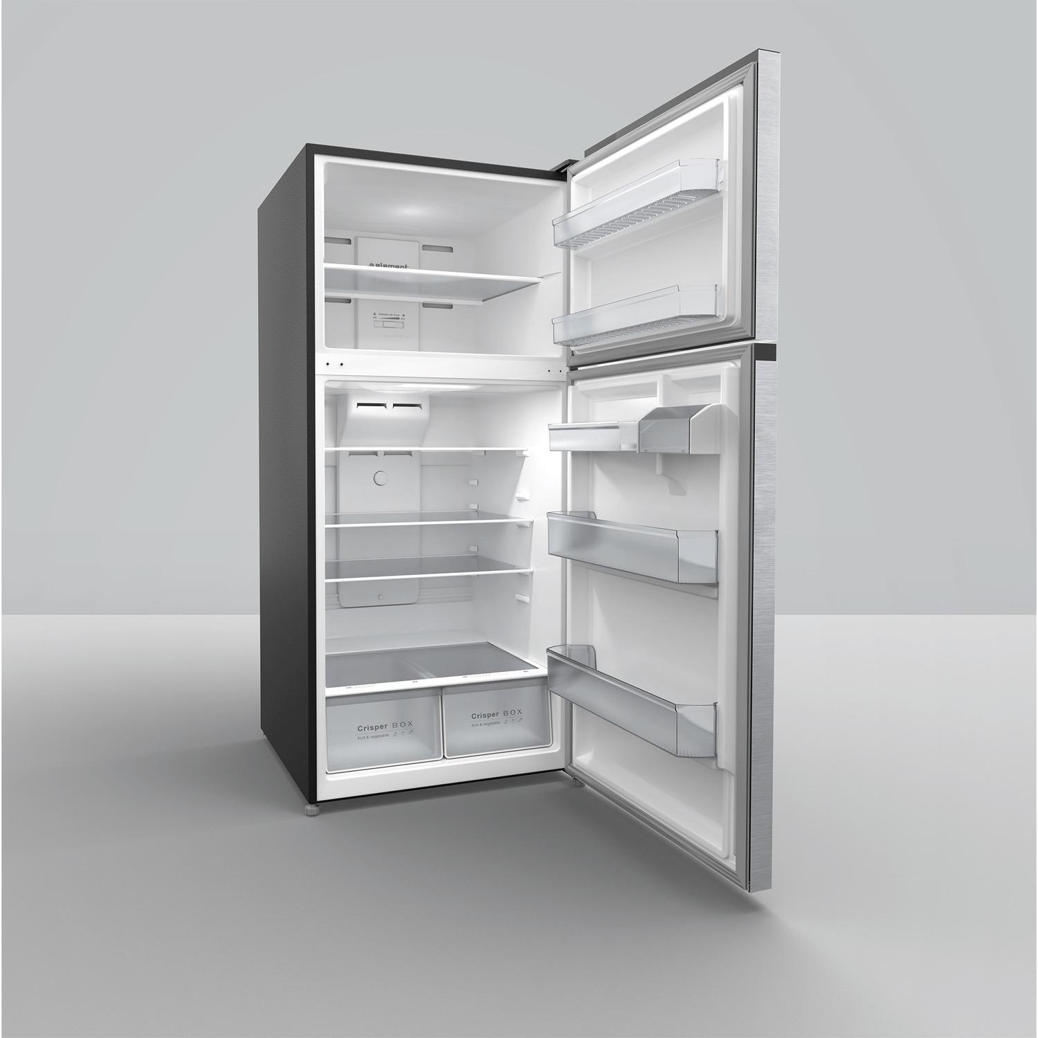 Element s 18 Cubic Foot Top Mount Refrigerator is perfect for storing your fresh and frozen foods. With two full-width adjustable glass shelves, you can customize its storage space to fit large or small containers easily. Plus, flexible door storage keeps your gallon-sized drinks handy while freeing up valuable shelf space. LED interior lights emit minimal heat to help you conserve energy while grabbing a late-night snack. Element fridges recessed handle creates a modern look while saving space. Its door is reversible to fit your kitchen layout best. The logo-less exterior and stainless-steel finish allow it to blend with your current appliances seamlessly. The freezer on the top is equipped with adjustable Multi AirFlow technology to provide a constant temperature for all of your frozen goodies. Element s refrigerators feature a no-frost system, so your food never frosts over; this reduces the chance for odors and freezer burn that can affect the taste of your food.