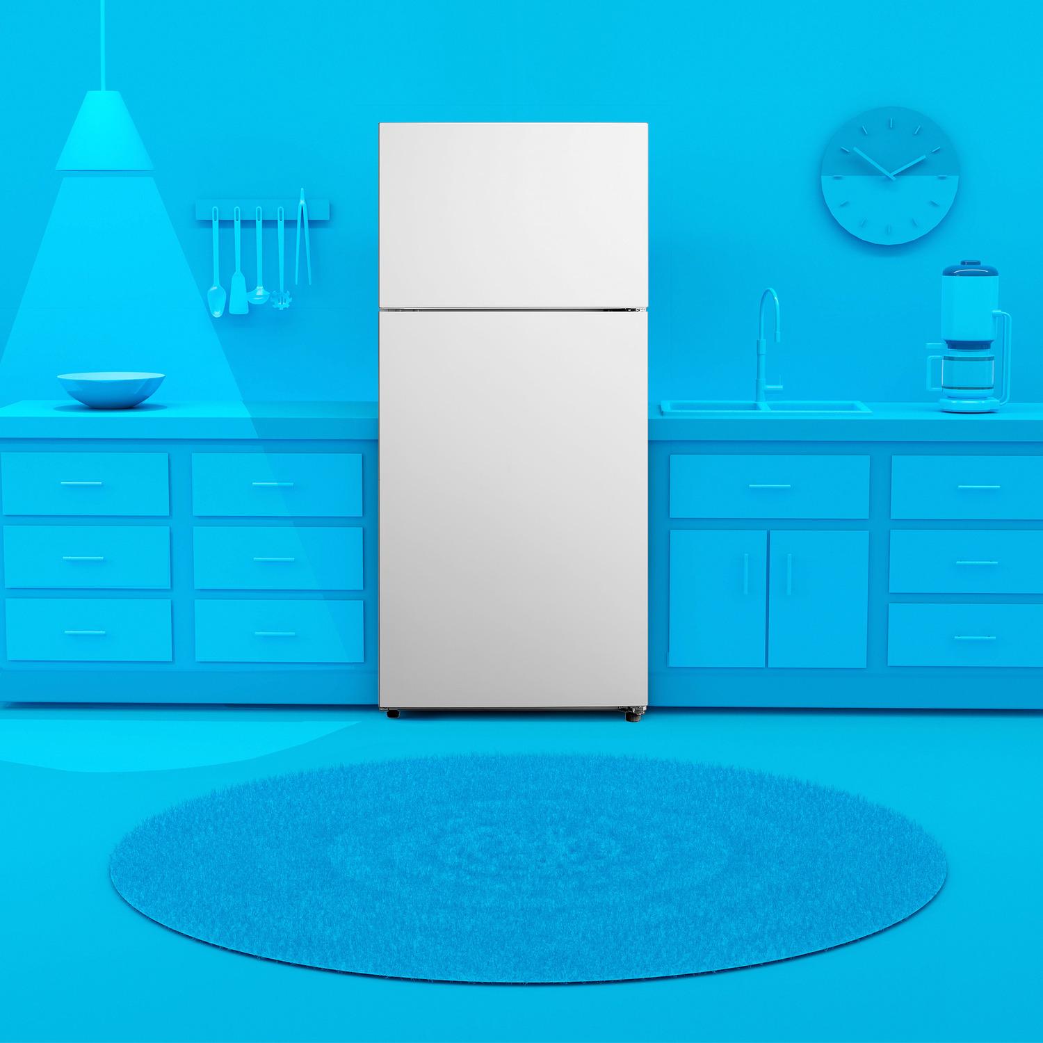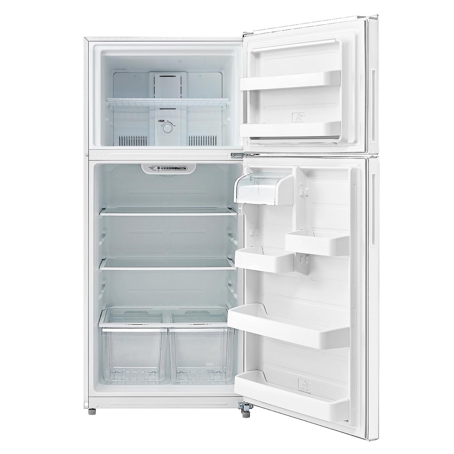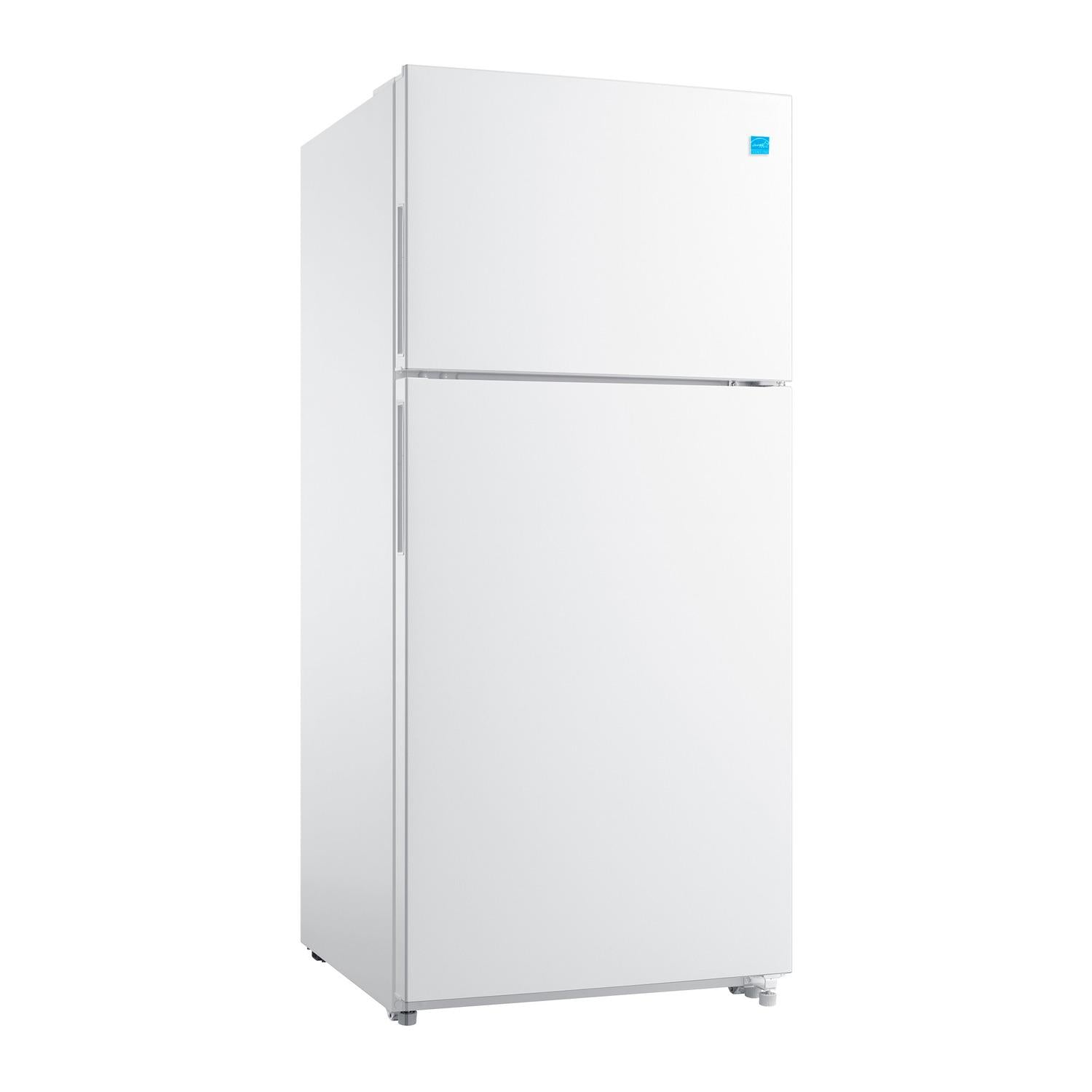 Element s 18.0 cubic foot Top Freezer Refrigerator is perfect for storing your fresh and frozen foods. With two full-width adjustable glass shelves, you can customize its storage space to fit large or small containers easily. Plus, flexible door storage keeps your gallon-sized drinks handy while freeing up valuable shelf space. Two crisper drawers keep your fruit, vegetables, and leafy greens delicious and ripe. Easily slide the humidity control setting for maximum freshness. Element refrigerators use R600a refrigerant and are ENERGY STAR(R) certified, lessening energy usage while also being more eco-friendly. Element fridges recessed handle creates a modern look while saving space. Its door is reversible to fit your kitchen layout best. The logo-less exterior and white finish allow it to blend with your current appliances seamlessly. Element s 18.0 cu. ft. refrigerators feature a no-frost system, so your food never frosts over; this reduces the chance for odors and freezer burn that can affect the taste of your food. Bring it home.