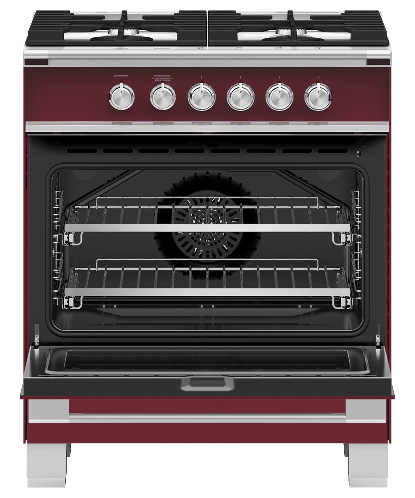 The brand Fisher & Paykel OR30SCG4R1 is a 30-inch Series 7 Classic 4 Burner Gas Range designed to combine professional-grade performance with elegant aesthetics. This freestanding range boasts a 3.5 cu. ft. oven equipped with AeroTech™ convection technology, ensuring even heat distribution for consistent cooking results. The cooktop features 4 sealed burners, including two dual wok burners capable of delivering up to 18,000 BTU for high-heat cooking. The oven offers three functions: Bake, Convection Bake, and Maxi Broil, providing versatility for various cooking techniques. Additional features include full extension telescopic shelves for easy access, a storage drawer for convenience, and a soft-close oven door for safety and durability.