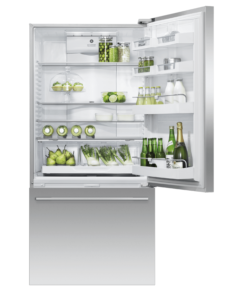 The brand Fisher & Paykel RF170WDRUX5N is a 32-inch bottom freezer refrigerator that blends contemporary design with smart functionality to support optimal food preservation. With a total capacity of 17.1 cu. ft., it includes a spacious upper refrigerator and a full-extension freezer drawer below, making frequently accessed items easy to reach. The refrigerator incorporates ActiveSmart™ technology that adjusts temperature, airflow, and humidity based on usage to ensure longer-lasting freshness. Humidity control bins create the ideal environment for fruits and vegetables, while adjustable spill-safe glass shelves provide flexible and secure storage. The EZKleen stainless steel exterior resists fingerprints and is easy to clean, and the reversible door adds installation flexibility. With a quiet, energy-efficient design and sleek, modern styling, the RF170WDRUX5N is built to complement any kitchen environment.