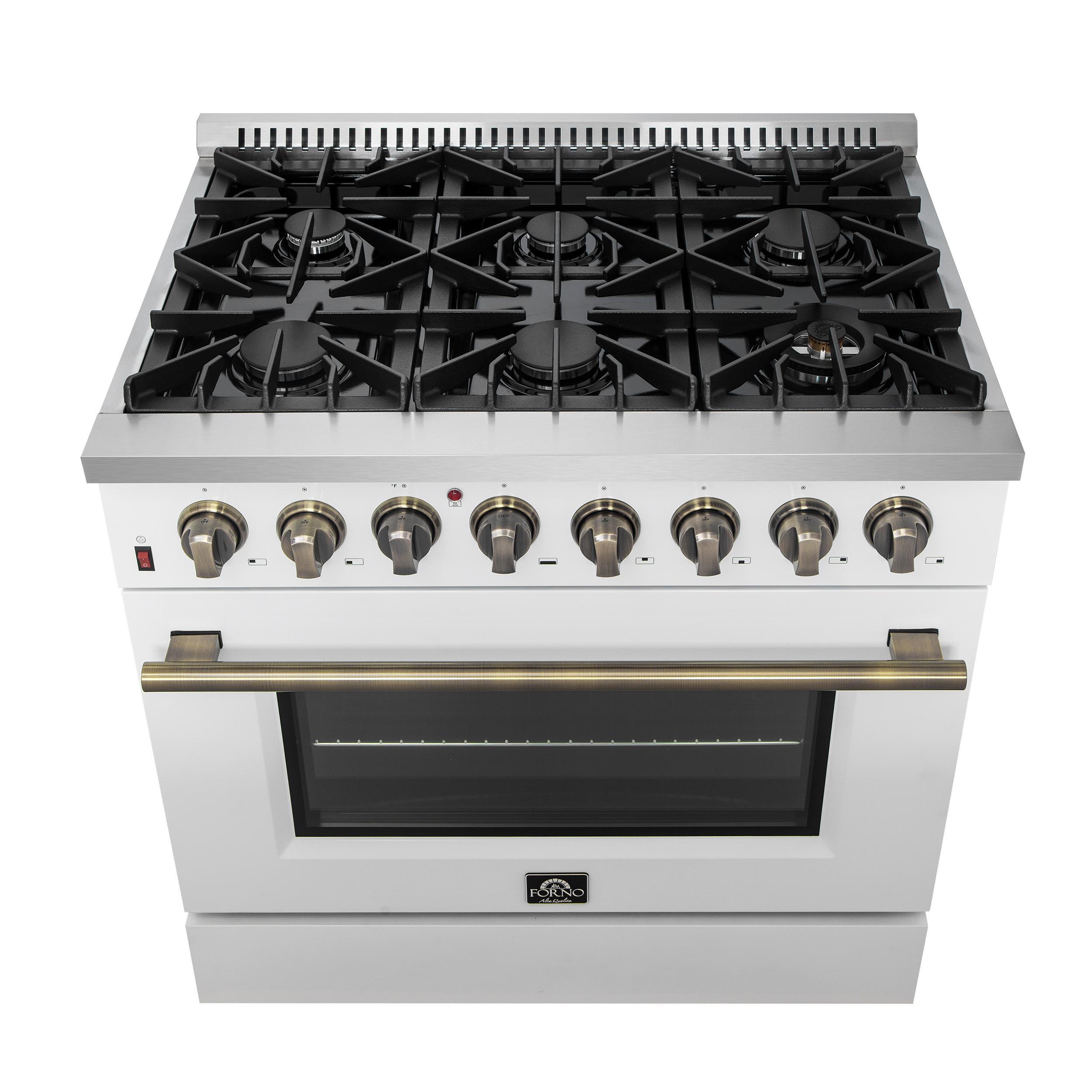 The Galiano 36" Dual Fuel Range blends professional style and performance in elegant white with antique brass accessories. Featuring six sealed burners with a total output of 83,000 BTU, including a powerful 20K dual-ring burner for boiling or searing, it gently simmers delicate foods, such as chocolate and sauces. The cast iron grates provide stability and smooth pan sliding, while the 5.26 cu. ft. electric oven delivers 6,300 watts of power, making it perfect for baking, roasting, and broiling with true convection options. Included are two oven racks, an LP conversion kit, and elegant zinc-coated metal knobs with bezel rings that retain their beauty.