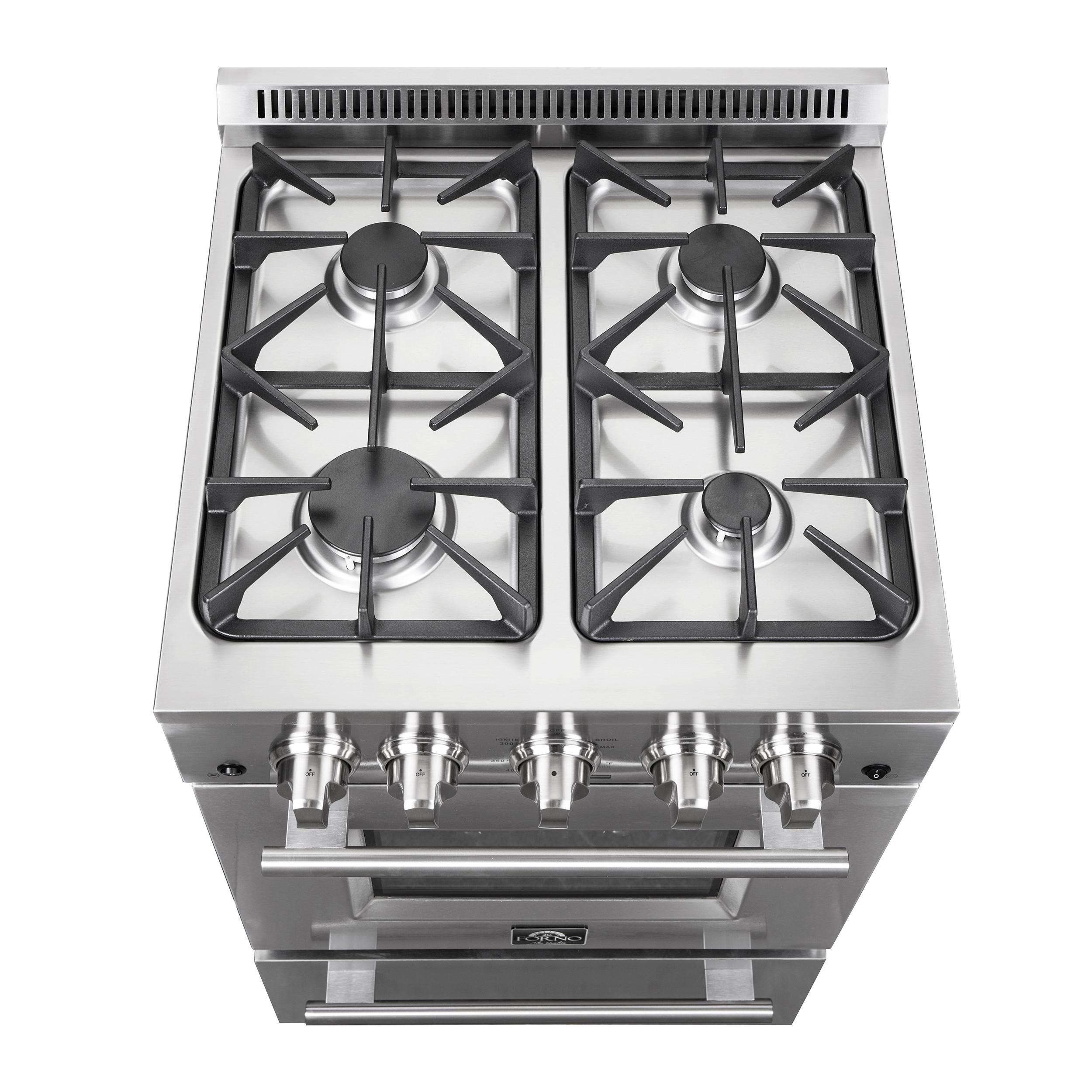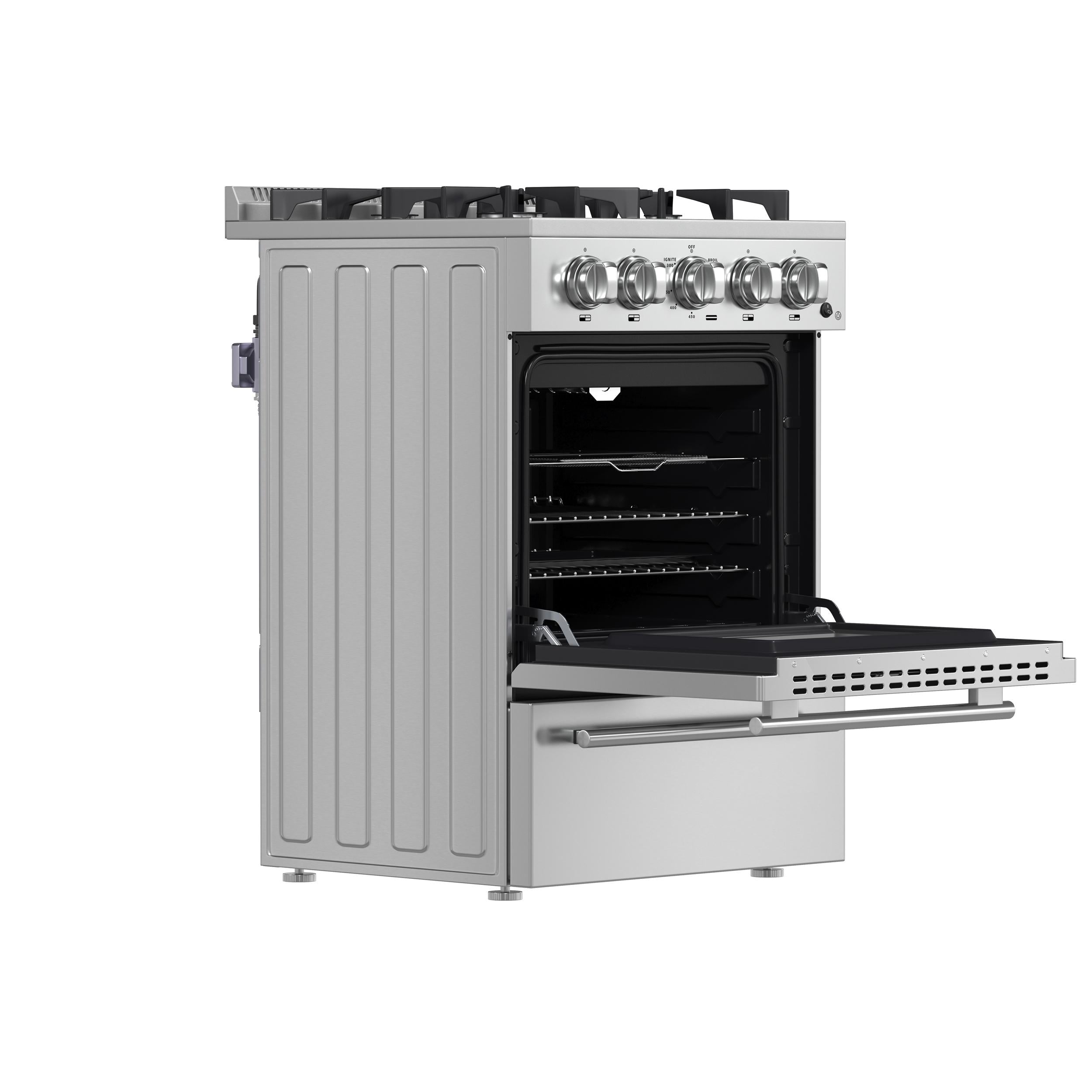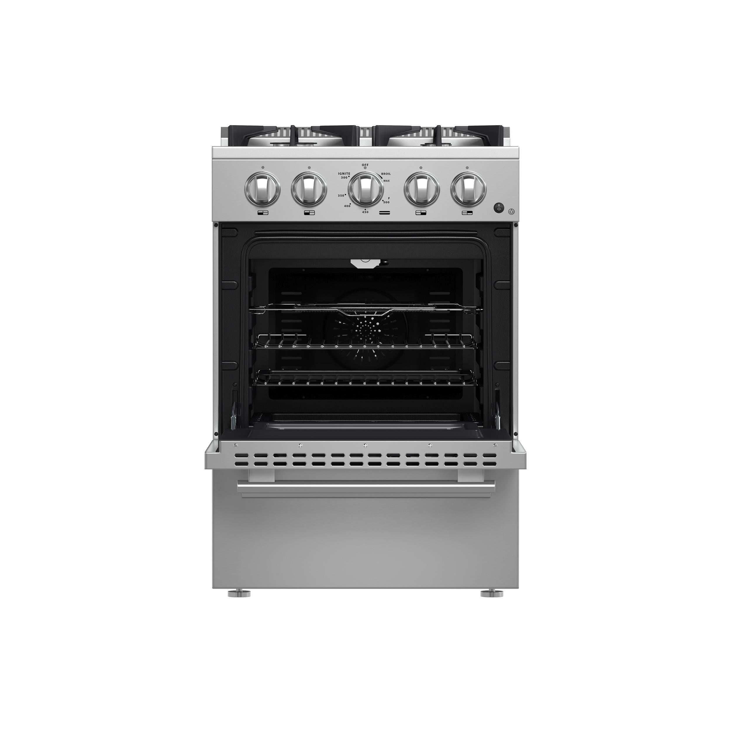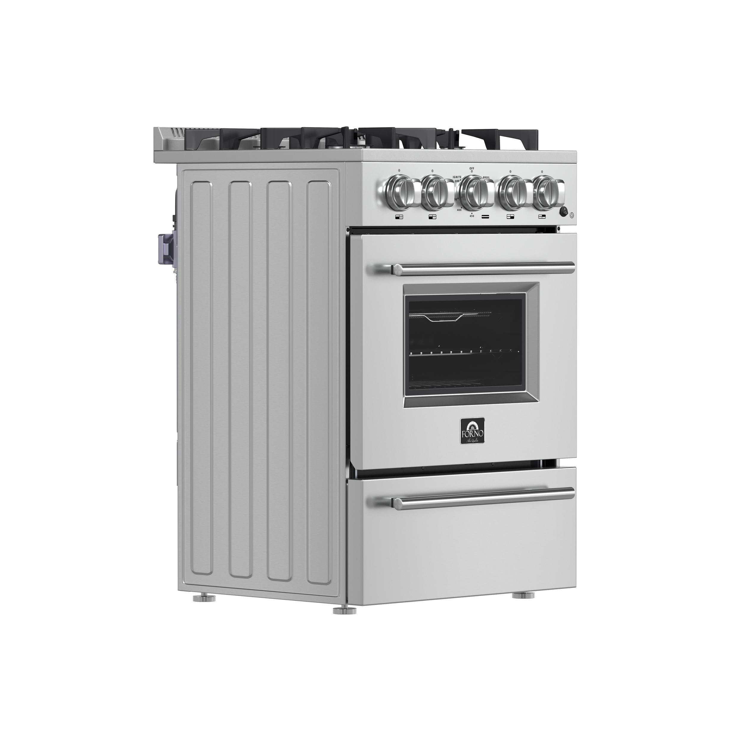 The Forno Breno 24 Inch Alta Qualita Pro-Style Freestanding Gas Range brings professional styling and Performance into your home kitchen with its durable stainless-steel design. Cooking Surface has with 4 sealed burners with a total output of 38,000 BTU and features continuous cast iron grates. The convection oven has a capacity of 2.3 cu. ft. with a combined broil and oven output of 13,000 BTU. Included are 2 electroplated oven racks, LP conversion kit and air-fryer kit. Additionally, zinc coated metal knobs with bezel rings will maintain their beauty for years.