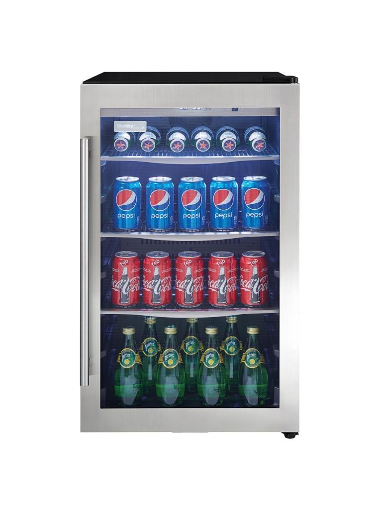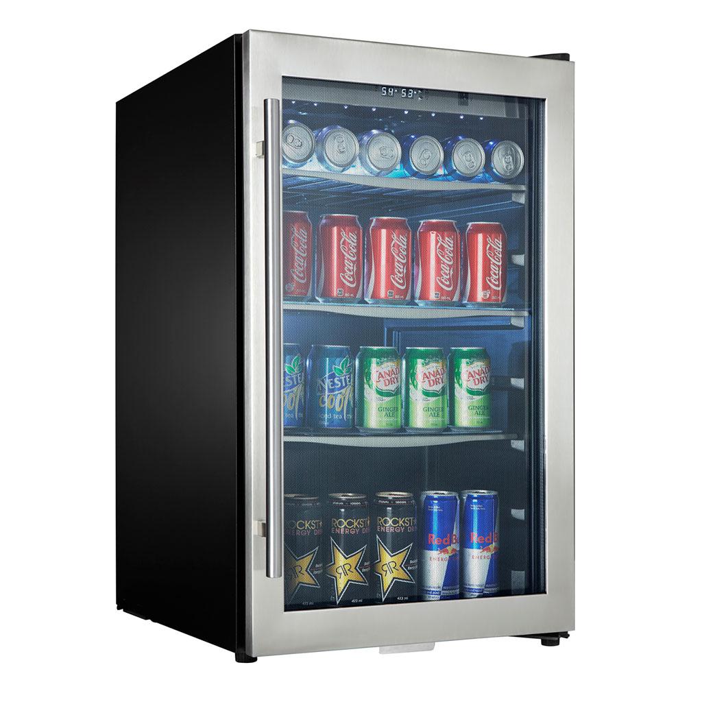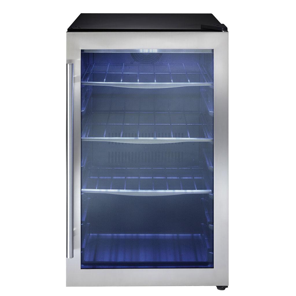Whether you find yourself entertaining guests or needing more convenient refrigeration for your family, this supreme beverage center delivers style and practicality. This beverage center is perfect for kitchen organization and hosting in small spaces such as an apartment, condo, or cottage! Save fridge space with this spacious unit offering 4.3 cubic feet (116 L) of cooling and storage space. Cool up to 124 (355 ml) beverage cans or 88 cans and 9 bottles of your favorite wines on three attractive black-wire shelves. Your drinks are showcased under white LED illuminated lights. Designed with an adjustable electronic thermostat, this wine and beer chiller can be set anywhere between 33F - 50F (1C - 10C). The captivating tempered dotted-glass door is framed in striking stainless steel and designed to keep harmful ultraviolet rays at bay. This small refrigerator also features a clever, reversible door hinge that enables you to adjust it for a left or right-handed opening based on preference.