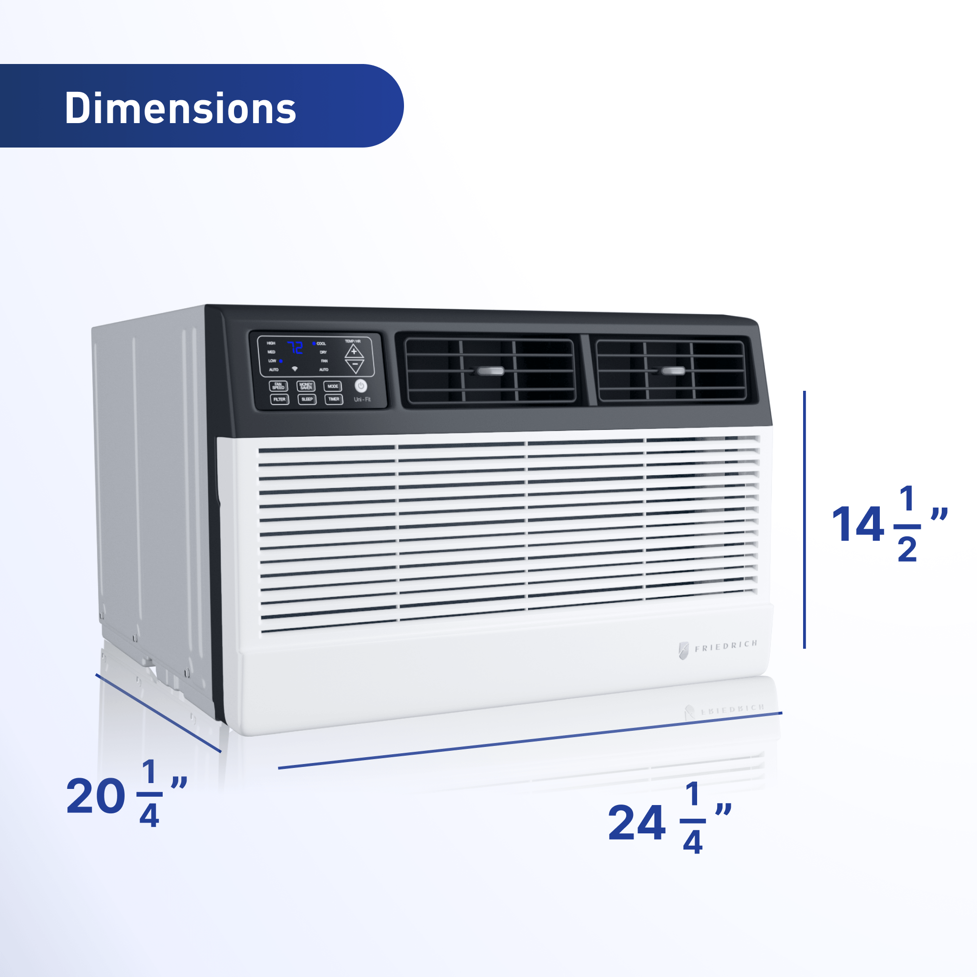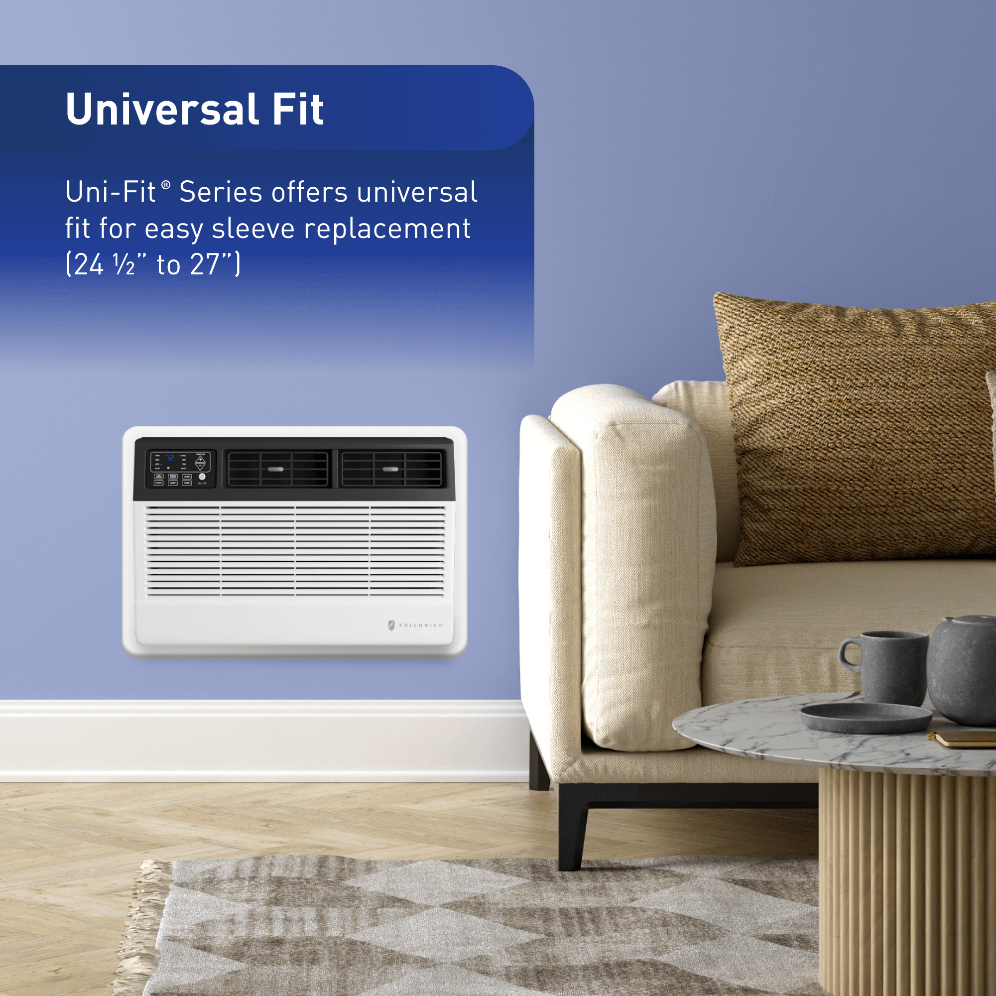 The Friedrich(R) Uni-Fit(R)Smart Through-the-Wall Air Conditioners offer universal fit for easy replacement in most sleeves, with the chassis designed to fit multiple existing sleeves from 24 1/2 to 27 . They re engineered for quiet operation with its QuietMaster(TM) Technology ensuring up to 25% quieter operation. Crafted with commercial-grade quality and precision engineering, it thrives in demanding applications, delivering long-lasting performance and superior value compared to competitors. With the FriedrichGo(TM) app, setup is simple, allowing you to create personalized cooling schedules and adjust settings remotely, providing ultimate control anytime, anywhere. The Friedrich Uni-Fit(R) Smart Through-the-Wall Air Conditioners not only keeps you cool but also sets the bar high for excellence in cooling solutions.