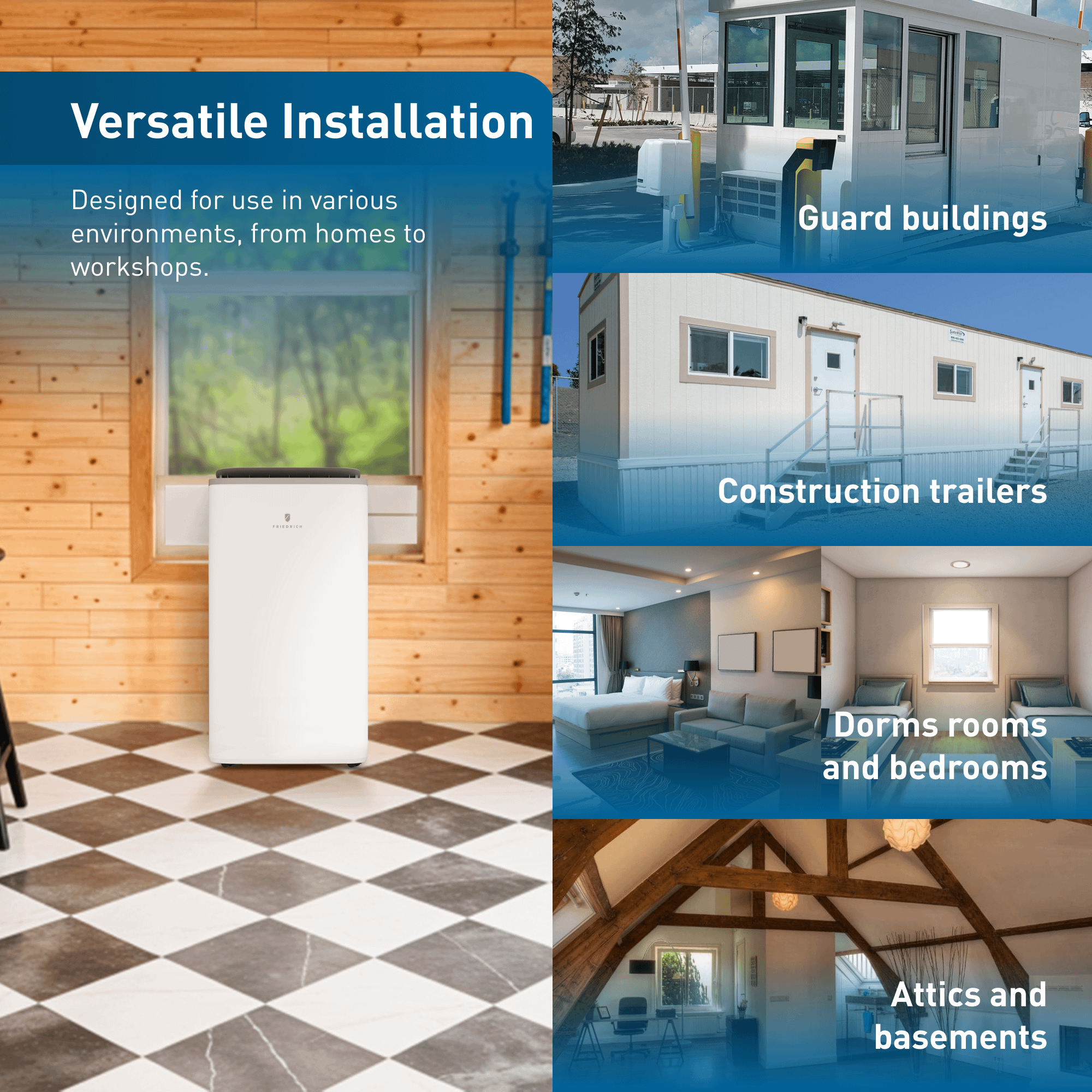 The Friedrich(R) ZoneAire(R) Select Single-Hose Portables is the ultimate all-in-one climate control solution. Choose from our versatile 3-in-1 system options, offering customizable cooling, dehumidifying, and fan capabilities to suit your needs. With energy-efficient operation powered by R-32 refrigerant and low GWP, you can enjoy superior performance while minimizing environmental impact. Friedrich(R) ZoneAire(R) Select Single-Hose Portables design can offer both efficient cooling and automatic temperature adjustment and are incorporated with a powerful dehumidification feature that removes up to 65 pts./day. With built-in Wi-Fi and ComfortPro App, you can easily manage a 24-hour timer from wherever you are. It also offers voice command compatibility with Amazon Alexa and Google Home, allowing you to adjust your settings with just a voice prompt. Plus, enjoy added convenience with features like auto swing air louvers, a self-evaporative condensate system, LCD light up remote control, EcoMode, and auto restart functionality. From home offices to workshops to guard buildings or trailers, our portable air conditioners are the ideal solution for any space, providing unmatched comfort and versatility. Experience the perfect balance of performance and convenience, all at your fingertips.