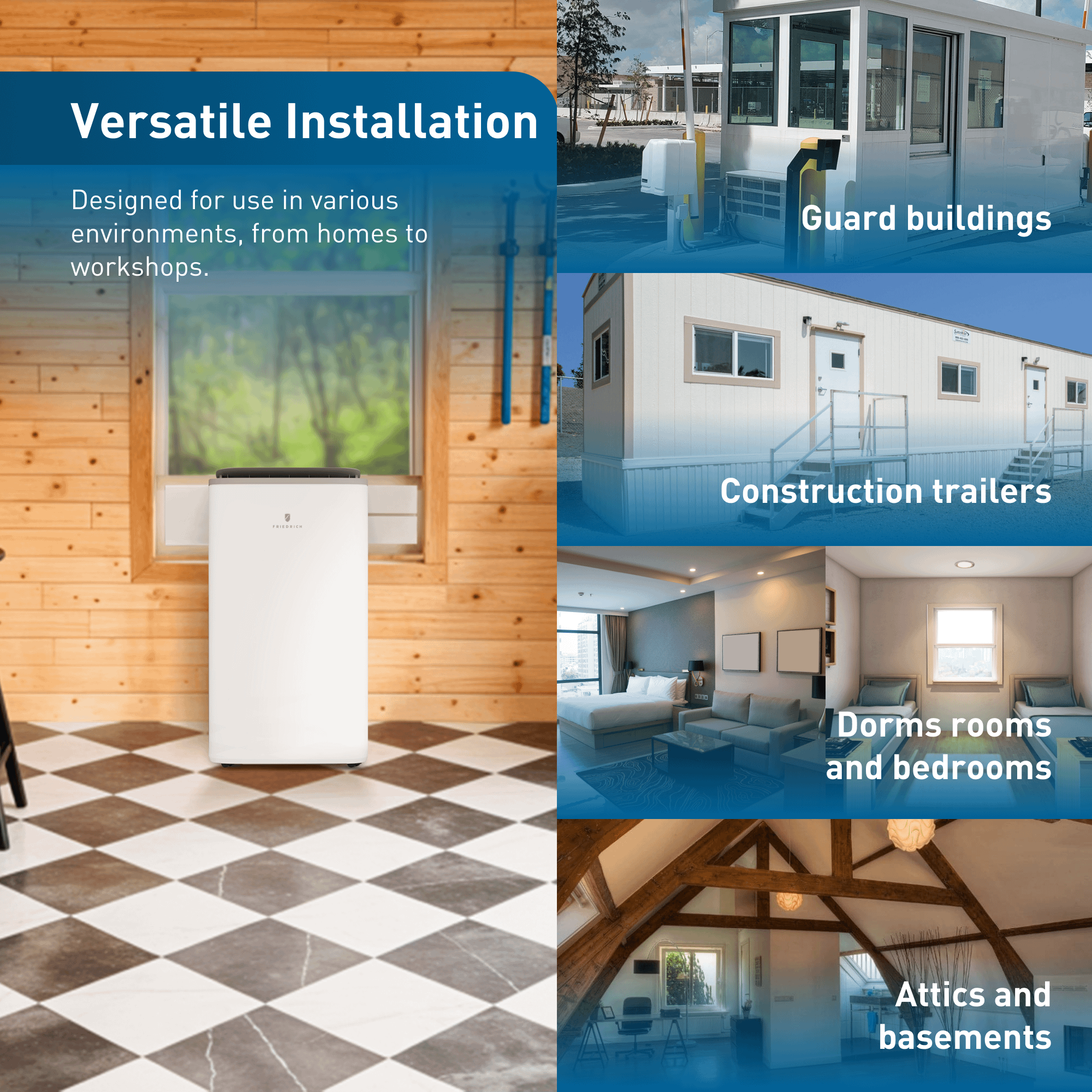 The Friedrich(R) ZoneAire(R) Premier and Premier Inverter Dual-Hose Portables is the ultimate all-in-one climate control solution. Choose from our versatile 4-in-1 cooling, fan, dehumidifier, and heat pump system options, offering customizable capabilities to suit your needs. Experience fast cooling with our innovative dual hose system, delivering up to 40% faster cooling performance. With energy-efficient operation powered by R-32 refrigerant and low GWP, you can enjoy superior performance while minimizing environmental impact. Plus, enjoy added convenience with features like auto swing air louvers, a self-evaporative condensate system, LCD light up remote control, washable filters, and auto restart functionality. Friedrich(R) ZoneAire(R) Inverter Dual-Hose Portables are incorporated with cutting-edge Precision Inverter(R) innovations that deliver precise temperature control with up to 40% higher efficiencies than standard single speed. Both dual-hose portable design ensures faster cooling, intensive dehumidification and automatic temperature adjustment. With built-in Wi-Fi and ComfortPro App, you can easily manage a 24-hour timer from wherever you are. It also offers voice command compatibility with Amazon Alexa and Google Home, allowing you to adjust your settings with just a voice prompt. From home offices to workshops to guard buildings or trailers, our portable air conditioners are the ideal solution for any space, providing unmatched comfort and versatility. Experience the perfect balance of performance and convenience, all at your fingertips