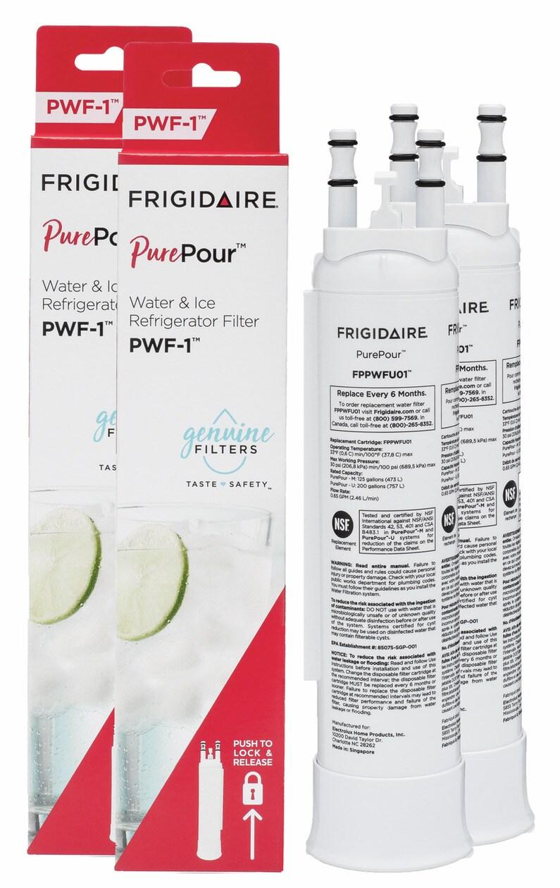 Keep safe, great tasting water flowing with PurePour(TM) Water filters (PWF-1(TM)). FPPWFU01(TM) reduces up to 99% of contaminants, cuts back on plastic and saves the cost of bottled water. Frigidaire Genuine Filters - the smarter, safer choice. Set of 2 contains two water filters.