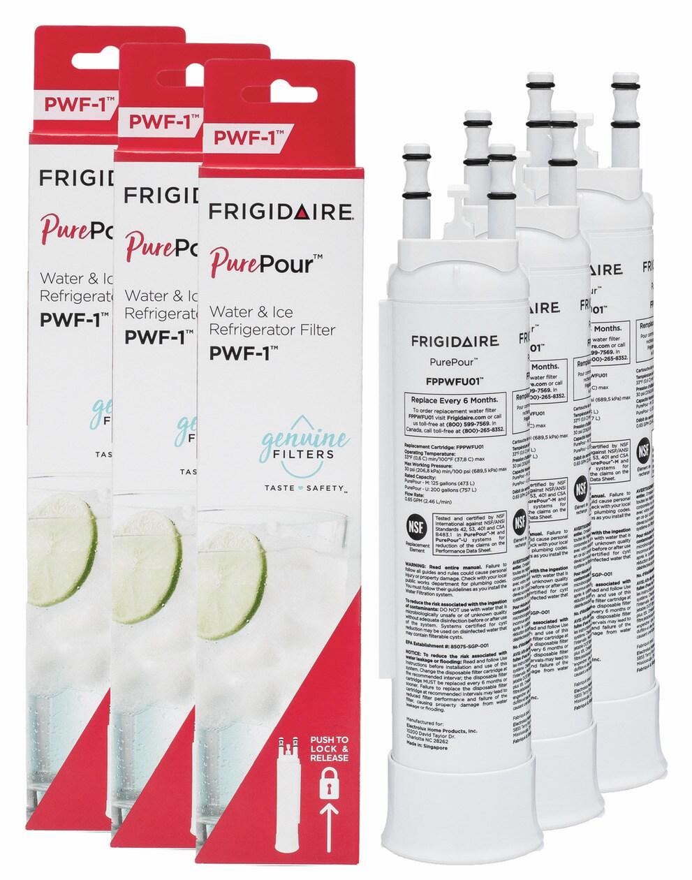 Keep safe, great tasting water flowing with PurePour(TM) Water filters (PWF-1(TM)). FPPWFU01(TM) reduces up to 99% of contaminants, cuts back on plastic and saves the cost of bottled water. Frigidaire Genuine Filters - the smarter, safer choice. Set of 3 contains three water filters.