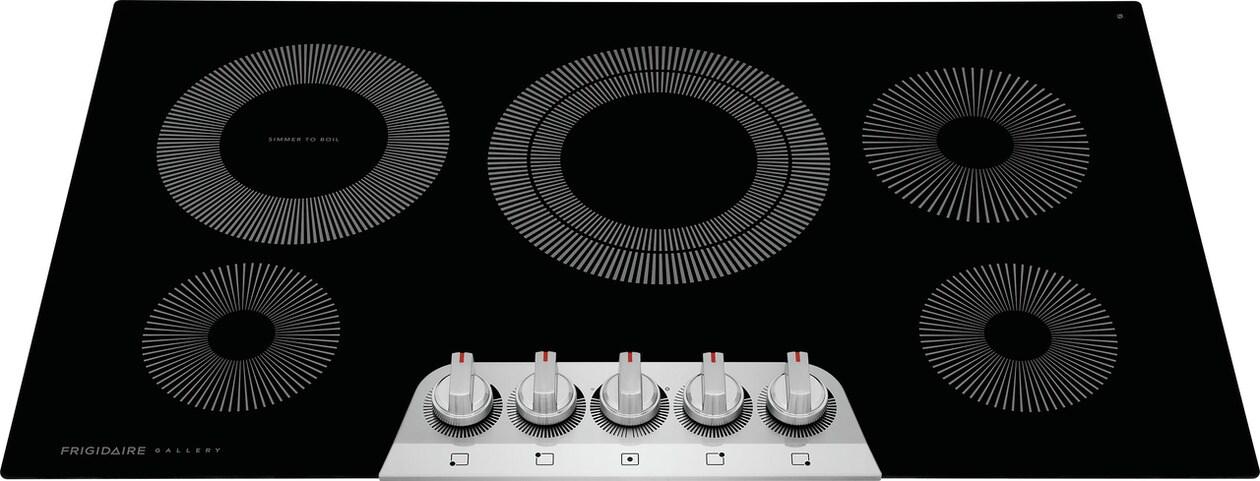 The Frigidaire GCCE3670AS 36'' Electric Cooktop delivers a premium cooking experience through its five versatile elements, including a 6''–9'' expandable SpaceWise® element designed to accommodate a range of cookware sizes. With a ceramic glass surface, it offers both modern aesthetics and ease of cleaning. The cooktop is engineered for precision with Ready-Select® controls that allow you to easily adjust heat levels. Additional safety is provided through hot surface indicators, alerting you when the cooktop is too hot to touch. The 36-inch width fits seamlessly into any kitchen counter, providing an expansive and efficient cooking area. Designed for built-in installation, this electric cooktop ensures a smooth, integrated look that complements contemporary kitchens.