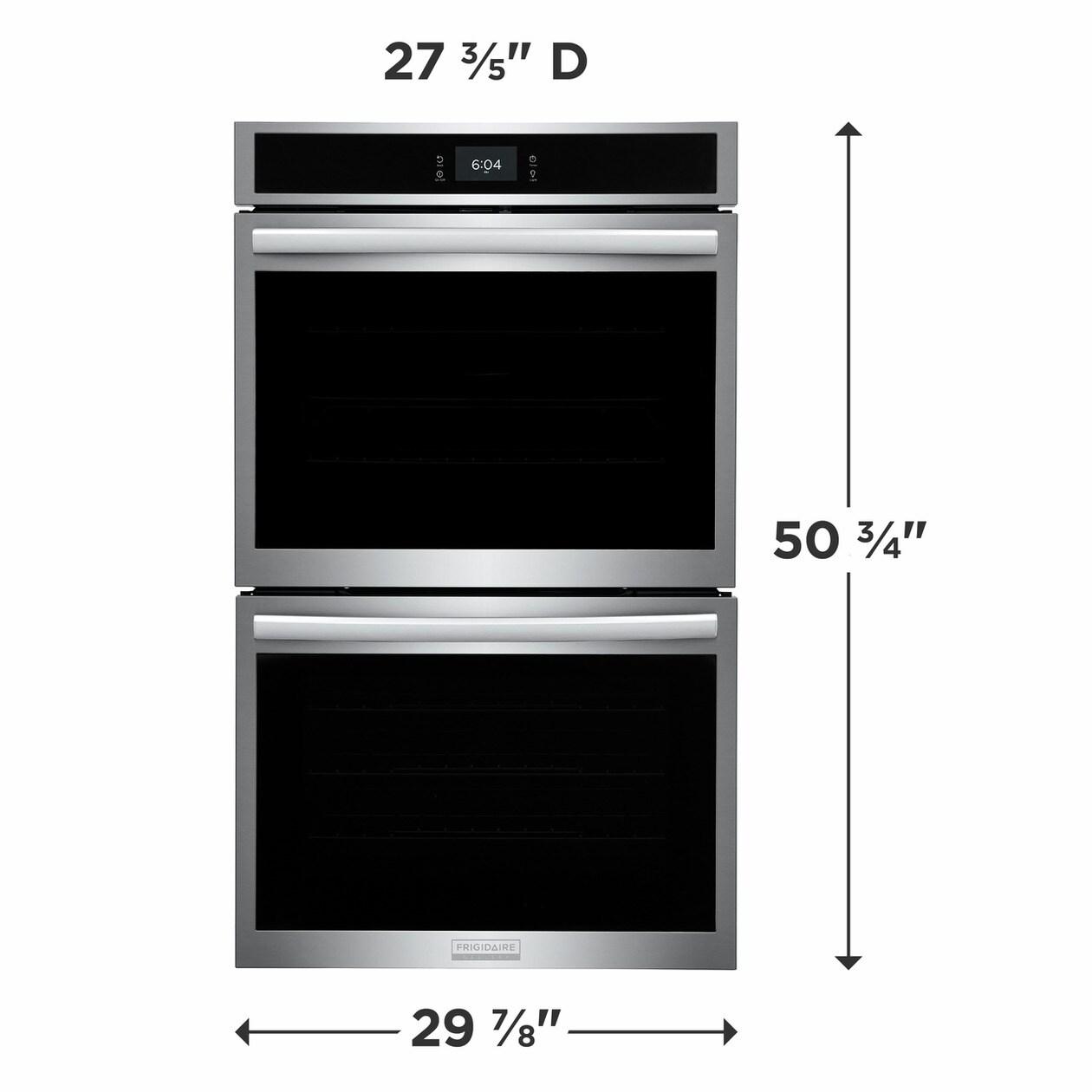 The Frigidaire GCWD3067AF is a 30-inch double electric wall oven designed to enhance your cooking experience with its advanced features and sleek design. It boasts a 10.6 cu. ft. total capacity, providing ample space to cook multiple dishes simultaneously. The Smudge-Proof® Stainless Steel finish resists fingerprints and cleans easily, maintaining a pristine appearance. Equipped with the Total Convection system, this oven offers over 15 cooking modes, including Air Fry for healthier meals, No Preheat for quick baking, Steam Bake and Steam Roast for moist and flavorful results, Slow Cook for tender dishes, and Air Sous Vide for precise cooking. The Premium Glide Rack provides easy access to your dishes, while the Temperature Probe ensures accurate cooking temperatures. The oven also features a 4.3-inch capacitive touch digital control panel for intuitive operation and a Fit Promise that guarantees the oven will fit your existing cabinet cutout or Frigidaire will reimburse up to $300 for modifications.