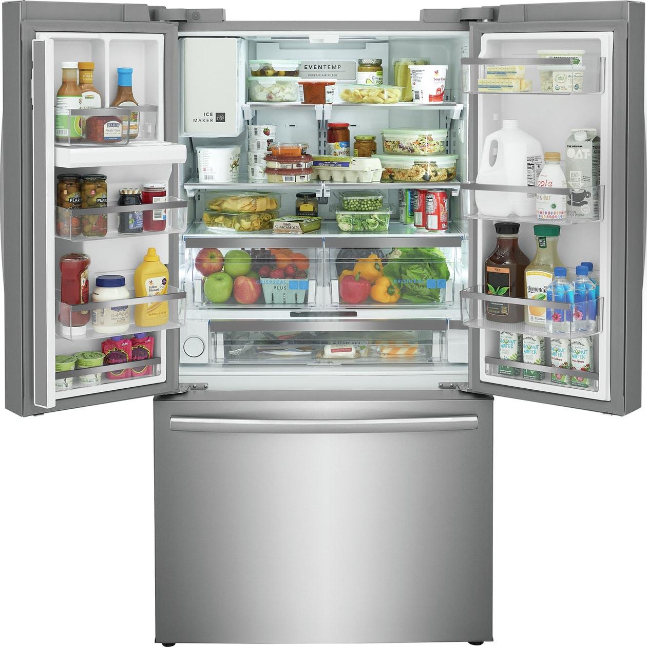 The brand Frigidaire GRFC2353AF is a premium built‑in counter‑depth refrigerator/freezer offering a total 23.5 cu ft capacity, including a 17.5 cu ft refrigerator section and 6 cu ft freezer section. Features include spill‑proof adjustable glass shelves, humidity‑controlled crispers, and a freezer with slide‑out baskets and wire shelving for efficient storage. The unit provides electronic temperature controls for both compartments, a door alarm to prevent temperature loss, and bright LED interior lighting. The fingerprint‑resistant stainless steel exterior complements modern cabinetry and resists smudges for easy upkeep.