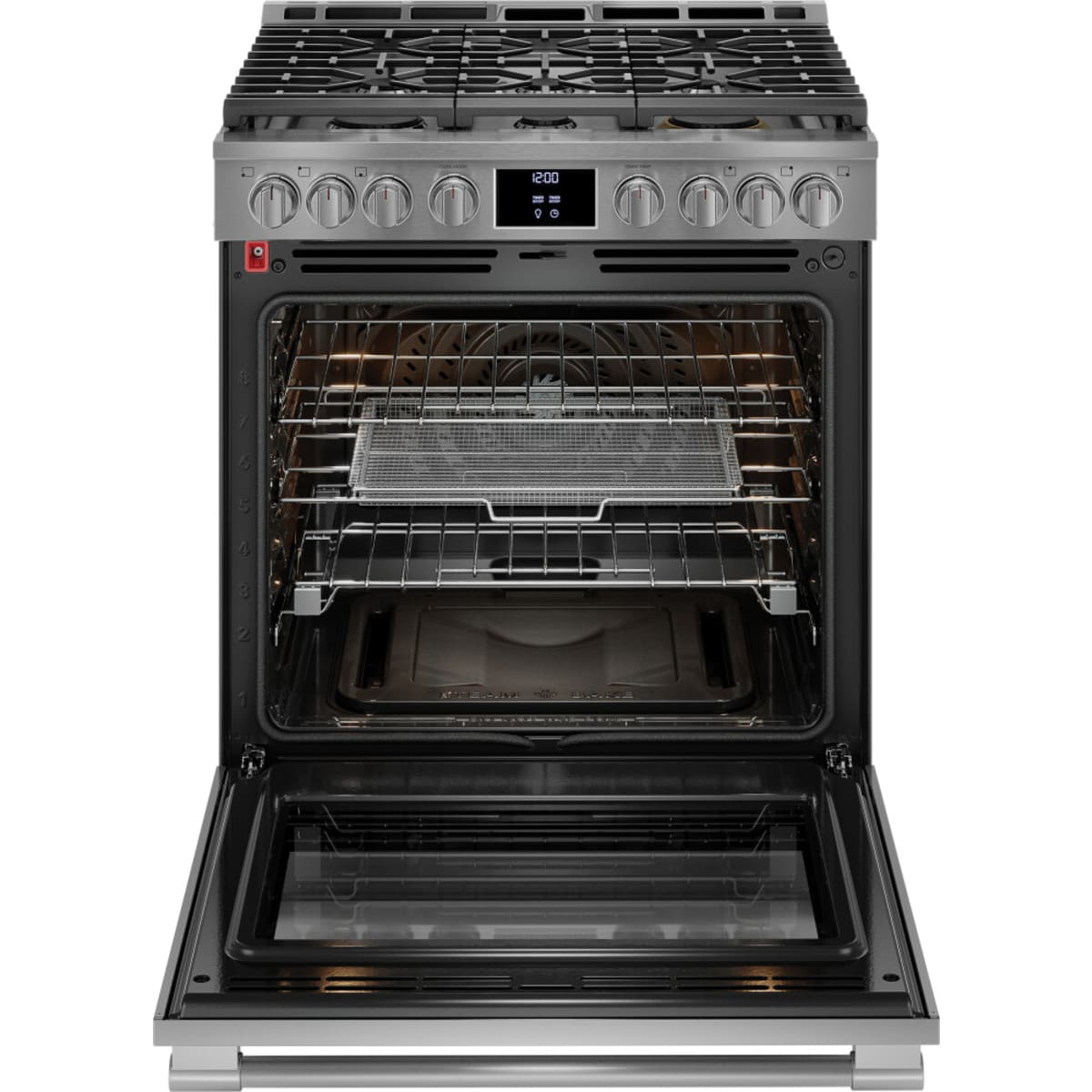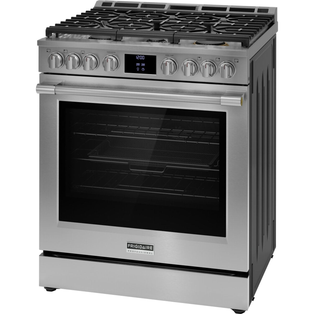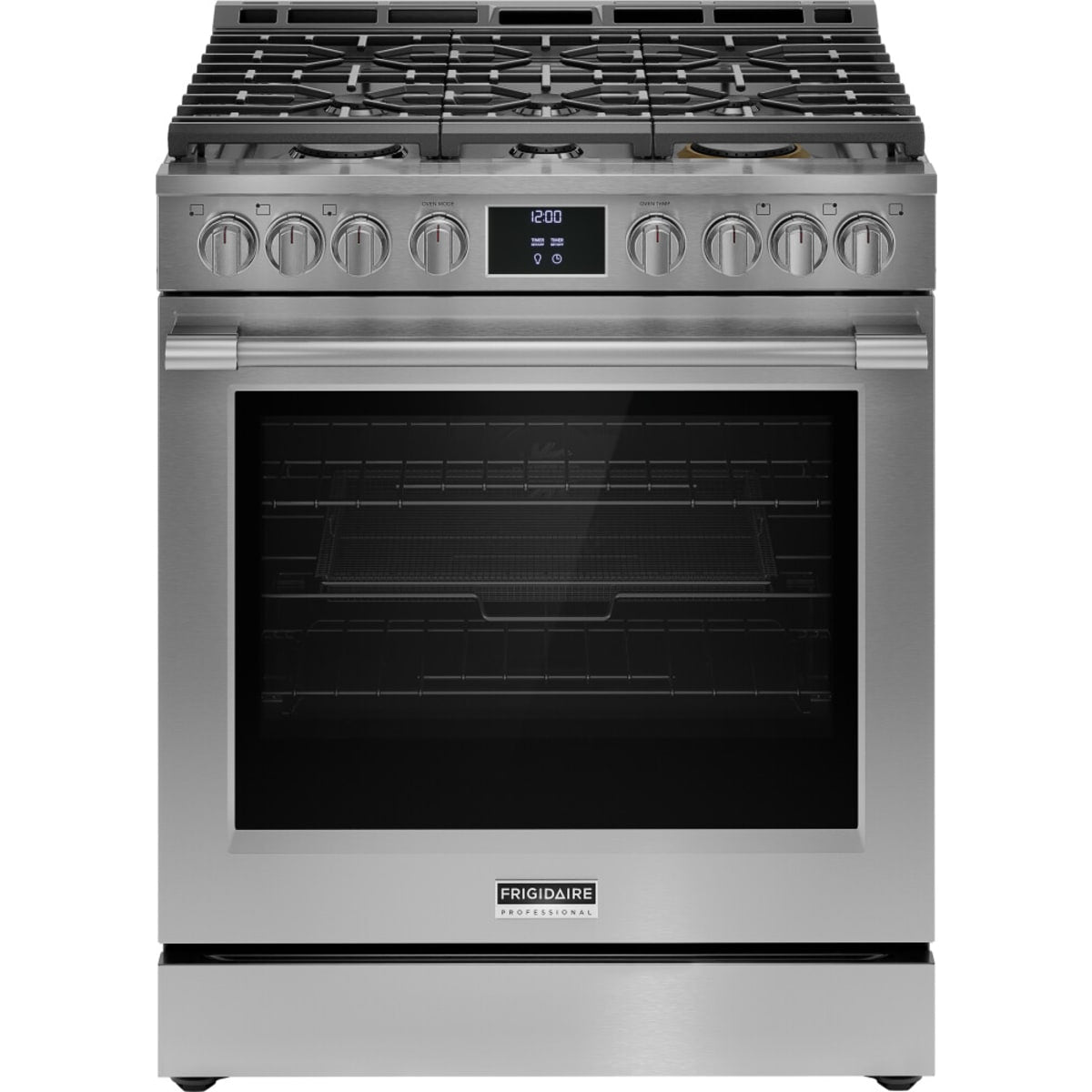 The Frigidaire Professional 30" Front Control Gas Range with Total Convection delivers exceptional versatility and performance. Its six-burner cooktop includes a powerful Quick Boil Burner and an integrated griddle for flexible cooking. Inside, Total Convection offers advanced modes like No Preheat, Air Fry, Steam Bake, and Slow Cook for precise results. A smooth glide rack makes it easy to access dishes, while the sleek design elevates any kitchen.