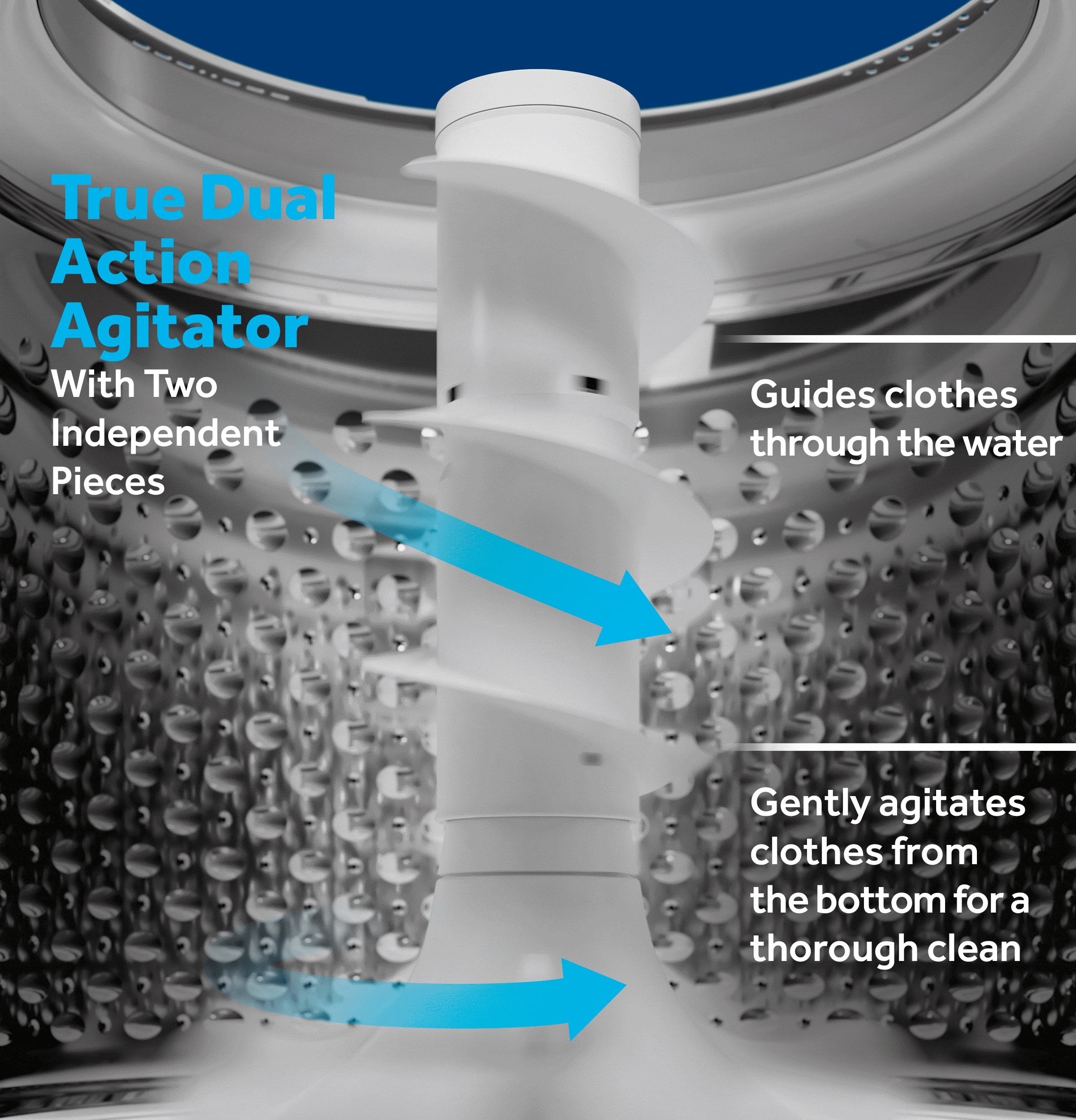 This durable, built-in, Dual Action Agitator provides better circulation and turnover of clothes to achieve a deep clean while being gentle on your clothes.
