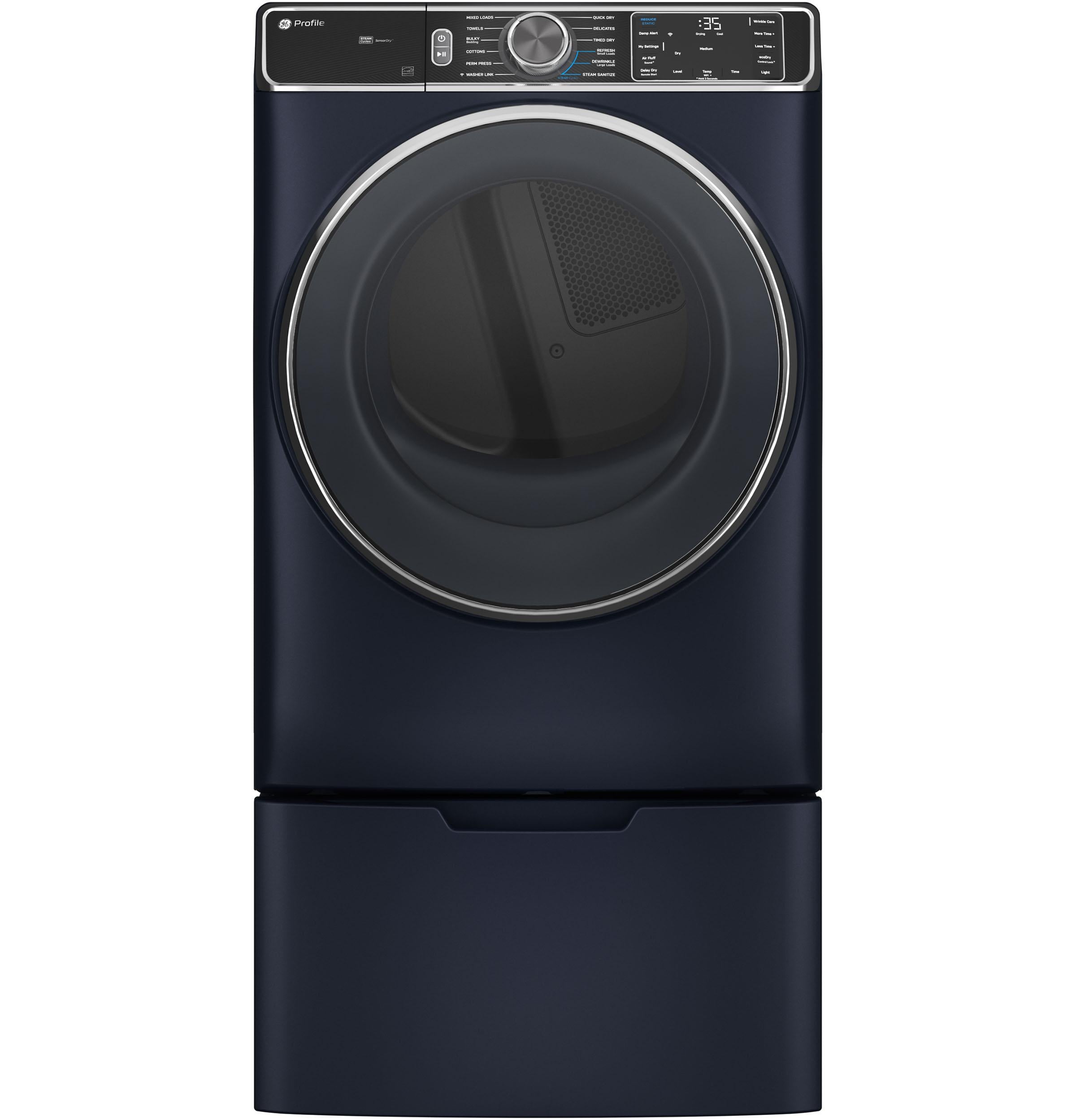 The brand GE Profile PFD87ESPVRS is a 28" front-load electric dryer offering a generous 7.8 cu ft capacity and equipped with steam cycle to refresh clothes and reduce wrinkles, and a steam sanitize option to eliminate germs and bacteria. It includes Washer Link to sync settings with compatible GE washers, and built-in Wi‑Fi via SmartHQ® for remote start, notifications, and diagnostics. Additional features include a quick dry cycle, reduce static option, wrinkle care setting, damp alert sensor, LED interior light, reversible door, and 4-way venting flexibility. With ADA compliance, Energy Star® certification, and a sleek Sapphire Blue finish, this dryer blends performance with convenience.