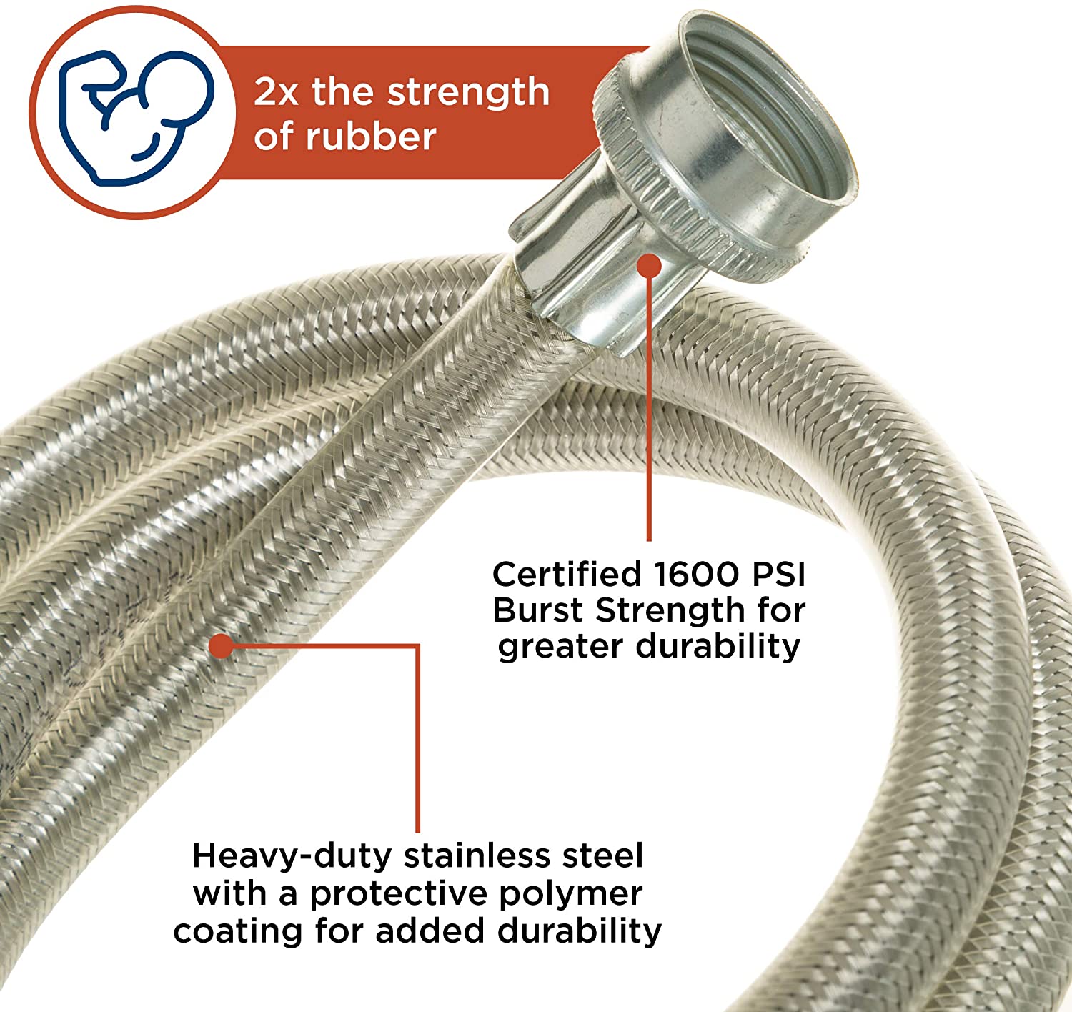 Durable braided stainless-steel exterior prevents against puncturing and tearing with hoses certified to 1600 psi burst strength, twice as strong as rubber, for burst-resistant piece of mind