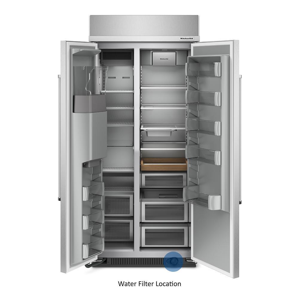 The brand KitchenAid KBSD706MPS delivers premium refrigeration in a streamlined 36-inch counter-depth side‑by‑side design with a total 20.8 cu. ft. capacity (13.5 cu. ft. refrigerator / 7.3 cu. ft. freezer). Featuring an exterior filtered ice & water dispenser with measured-fill technology, it offers refreshment without opening the door. The advanced ExtendFresh™ Plus system with dual air towers and precise temperature sensors helps maintain optimal freshness. Additional highlights include a convenient under-shelf prep zone with baking pan, a sliding storage tray, adjustable spill-resistant glass shelves, and bright interior LED lighting. The appliance also supports Sabbath mode, features easy-access bins, and is fingerprint-resistant thanks to its PrintShield™ finish.