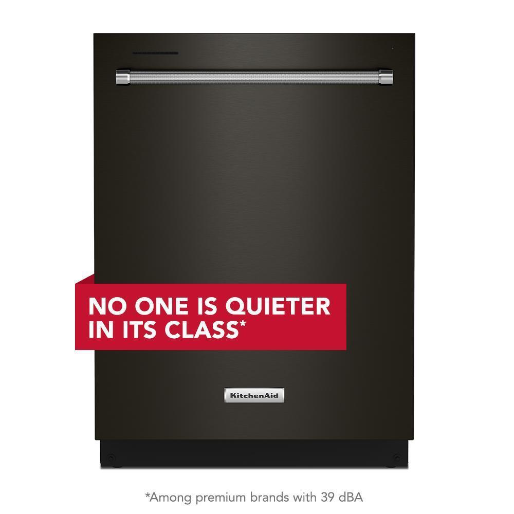 The KITCHENAID KDTE204KBS 24" Top Control Built-In Dishwasher with Third Level Utensil Rack, ProWash™ Cycle, and 39 dBA - Black Stainless Steel delivers exceptional cleaning performance with whisper-quiet operation. Its third level utensil rack provides additional space for long and flat items like silverware and spatulas, while the adjustable middle rack adds flexibility to accommodate tall items such as stand mixer bowls or pitchers. The dishwasher features a 13 place setting capacity and operates at an ultra-quiet 39 dBA, making it ideal for open-concept kitchens. The ProWash™ Cycle uses sensors to adapt wash time and water temperature for optimal cleaning, and the Express Wash cycle cleans lightly soiled items quickly. Additional features include a Sani-Rinse option that eliminates 99.999% of food soil bacteria, a Heat Dry option for thorough drying, and a triple filtration system that ensures clean water circulates throughout the wash. The durable stainless steel interior resists streaks and odors, while the PrintShield™ Finish resists smudges and fingerprints for easy cleaning.