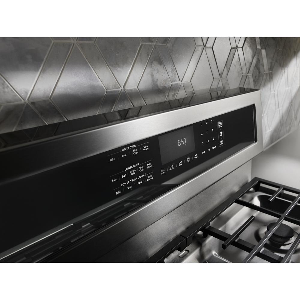 The brand KitchenAid KFDD500ESS delivers a powerful combination of precision and flexibility in a 30-inch dual fuel double oven range designed for serious cooks. It pairs the responsiveness of a gas cooktop with the consistency of electric ovens, including a lower oven with Even-Heat™ True Convection for thorough, even baking and roasting. The 5-burner cooktop features a 17,000 BTU professional burner ideal for rapid boiling and searing, along with a 5,000 BTU simmer burner for delicate heating. The upper and lower ovens offer a combined 6.7 cu. ft. capacity, allowing you to cook multiple dishes at once. With a durable stainless steel finish, continuous cast-iron grates, and intuitive controls, this range offers style, performance, and convenience in one professional-grade package.