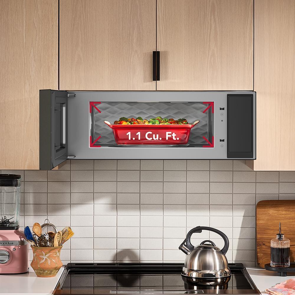 Take on bolder recipes in the kitchen with a sleek microwave hood combination designed to go above and beyond. Dual Fan Ventilation System utilizes a 600 CFM motor to help clear smoke and grease from the air. Smart Capabilities allow you to stay in control of the kitchen with hands-free voice commands for the fan and multi-color LED lights. 1.1 Cu. Ft. Capacity provides a spacious interior that comfortably fits a variety of large dishes with enough height for a tall mug and width for a large casserole dish.