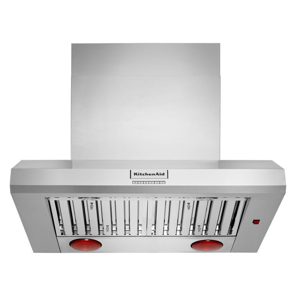 Equip your kitchen with a powerful 36-inch wall-mount canopy range hood designed to pair with 36-inch KitchenAid(R) Commercial-Style Ranges and Rangetops. A 90,000 BTU rating allows this vent hood to keep up with high-heat cooking on multiple burners. Two food warming heat lamps hold cooked items at serving temperature for up to an hour while you finish other dishes.