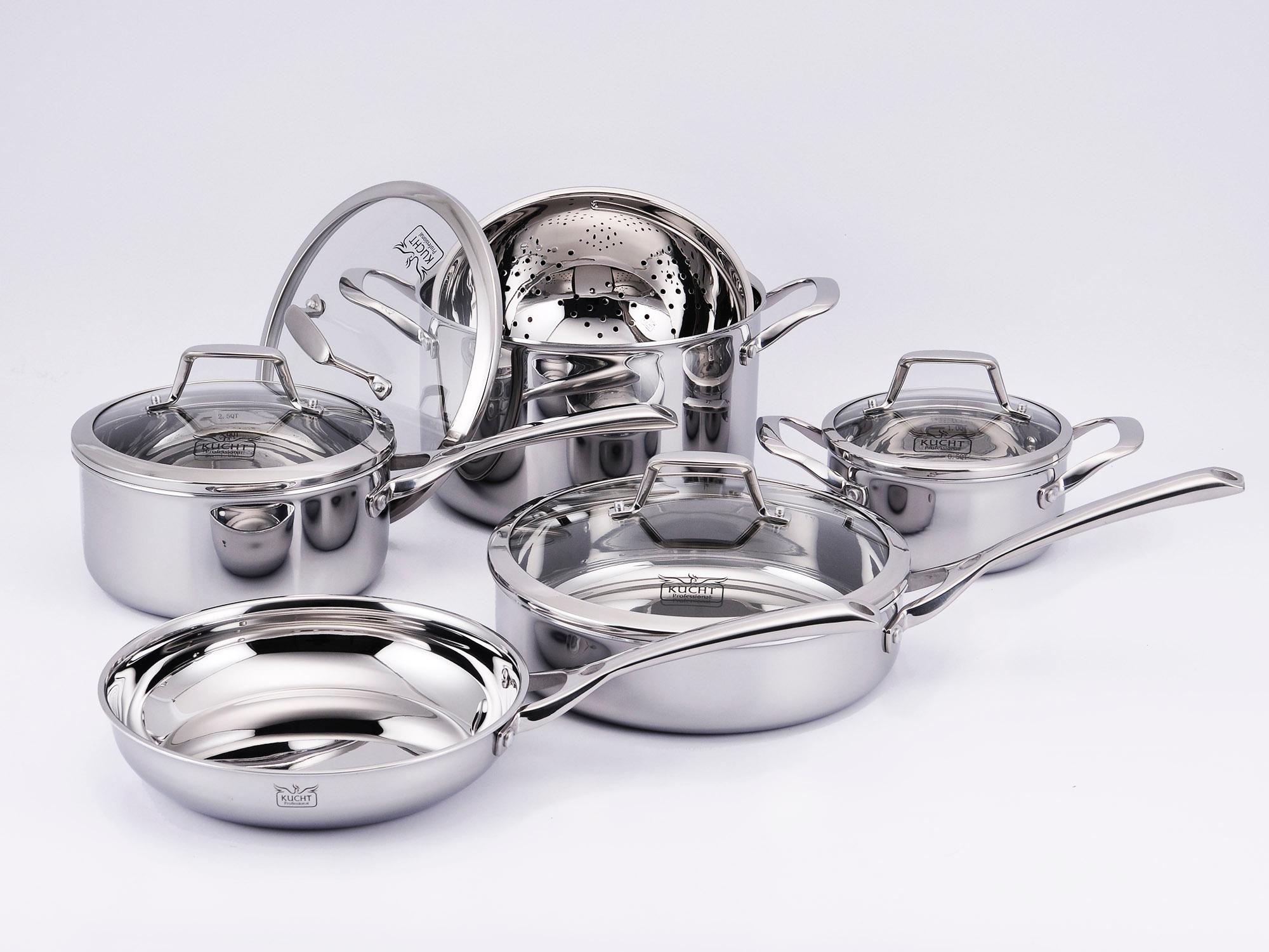 KUCHT Culinary Professional 3-Ply Cookware brings back the art of cooking. It was designed to create the best performance. Our 3-Ply cookware set comes with 18/10 (surgical quality) Stainless Steel Interior, a middle Aluminum Alloy Core layer for even heat distribution and an Induction Capable Magnetic Stainless Steel exterior. This technology delivers more efficient heat transfer not only throughout the bottom of the pan, but the sides as well. The interior layer of stainless steel is easy to clean and dishwasher friendly. KUCHT professional handle has the perfect grip and remains cool to the touch when used on the stovetop. The glass lids allow you to see the progress of your meal. This 10 piece set includes: 7 Qt. Stock Pot with lid, 8.5" Pasta Steamer/Colander, 3.4 Qt. Saut(eback) Pan with lid, 3.2 Qt. Sauce Pan with lid, 1.6 Qt. Casserole Pan with lid and 10" Fry Pan. Gas, electric, vitroceramic, induction, oven and dishwasher safe.