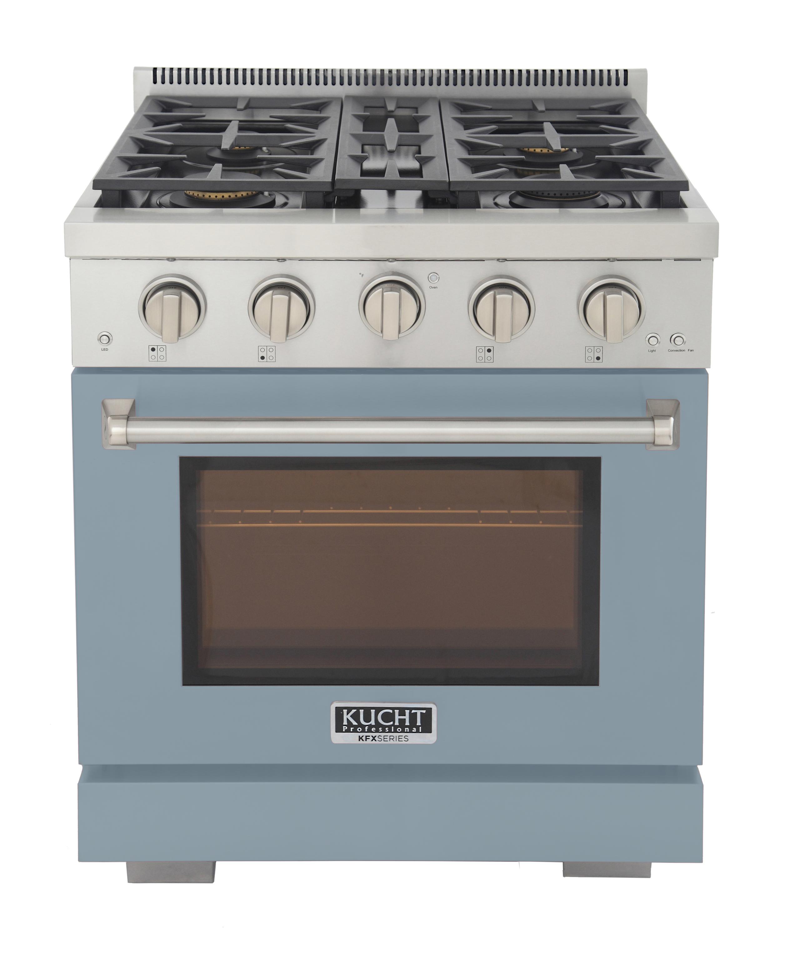 Introducing the new KFX series: Combining design, high performance, and safety. Resistant, intuitive, modern, and elegant, the 30 in. model provides amazing capacity for its size. Our new KFX300 is a gorgeous focal point for your kitchen and allows a combination of burners, one with high BTUs for fast stir-frying, and one with super-low BTUs for simmering, to help you get that perfect flavor. One of the featured burners is a heavy duty 21,000 BTU Rocket Power Burner that provides evenly distributed heat and plenty of power to use a home WOK or medium Paella Pan with professional results. The oven interior is covered with fine blue porcelain, and the heavy duty stainless steel racks are adjustable and telescopic, creating ease of use and even easy to clean. This high powered model was designed to function with Kucht's Ignition, using an auto-reignition system that ignites every time with ease, and automatically reignites any time a flame burns out. The range top's continuous grates covers the 4 burners and allows you to move your kitchen utensils safely and with ease. You can slide the heaviest pots and pans on the rails without even having to lift them. The new KFX300 Gas Range offers massive power and flexibility in a small size design to bring the most elaborated recipes to life at your own kitchen. This extremely powerful and easy to use Gas Range will allow you to cook any recipe with the same quality, precision, and speed of a chef.