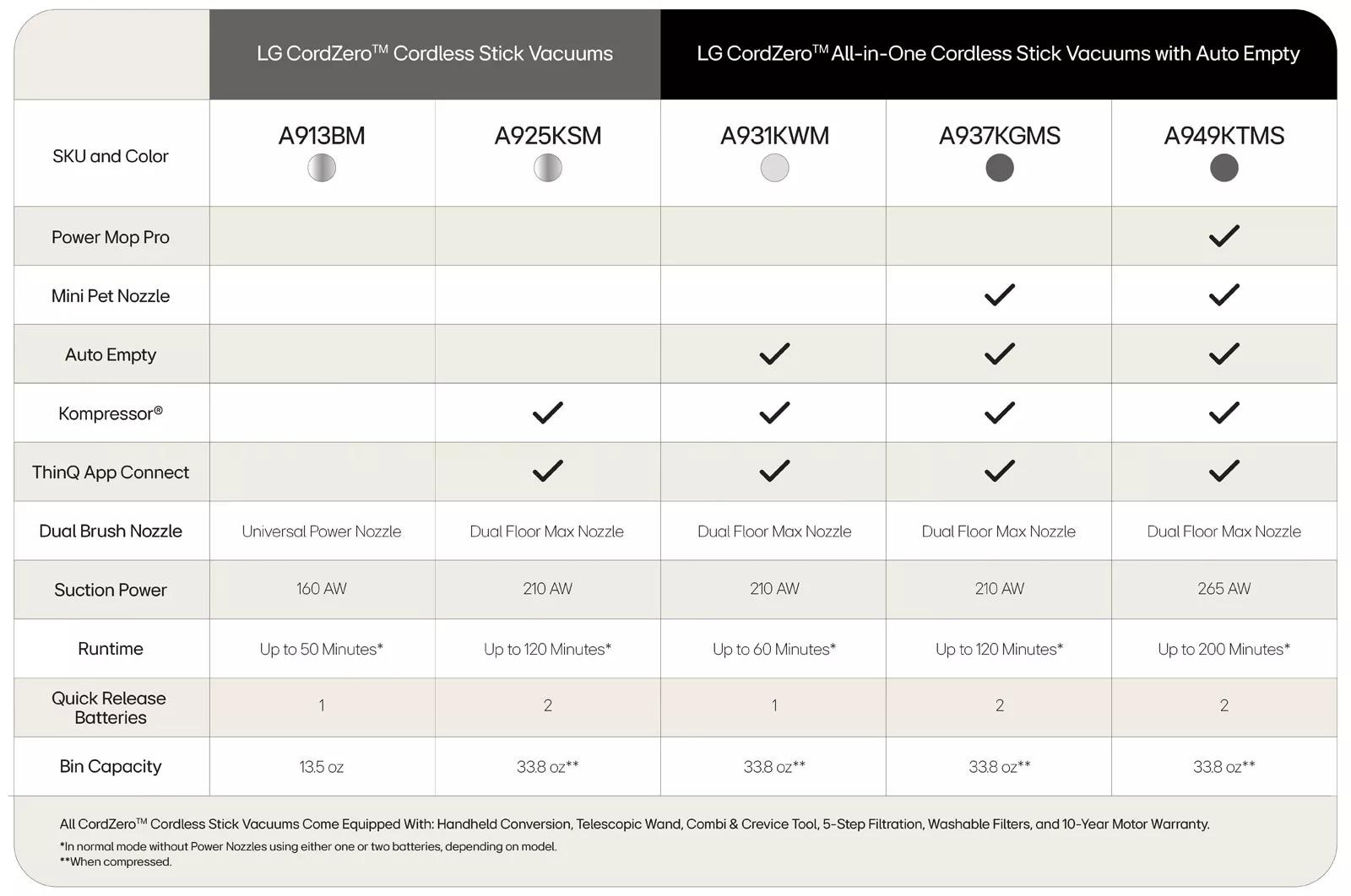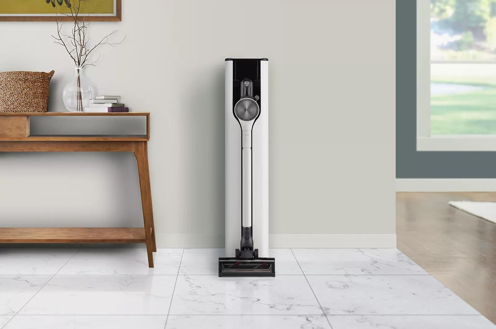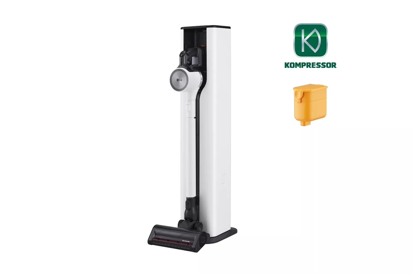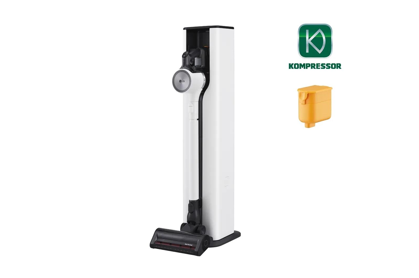 The LG A931KWM CordZero All-in-One cordless stick vacuum offers cutting-edge cleaning convenience with advanced features to tackle a wide range of messes. Its innovative All-in-One Tower™ includes an integrated auto-emptying system that stores and charges the vacuum while neatly managing tools and collected dust. The Kompressor™ technology compresses dirt and debris in the dust bin, allowing for extended cleaning sessions without interruption. With powerful suction and a Smart Inverter Motor™, this vacuum delivers consistent performance across hardwood, tile, and carpet. The included Power Mop attachment allows for wet mopping, adding an extra layer of floor care with minimal effort. The Dual Battery System offers extended runtime, while washable filters and a detachable hand vacuum provide greater flexibility. Finished in White, this smart, stylish vacuum fits seamlessly into modern homes, offering deep, hands-free cleaning at your command.