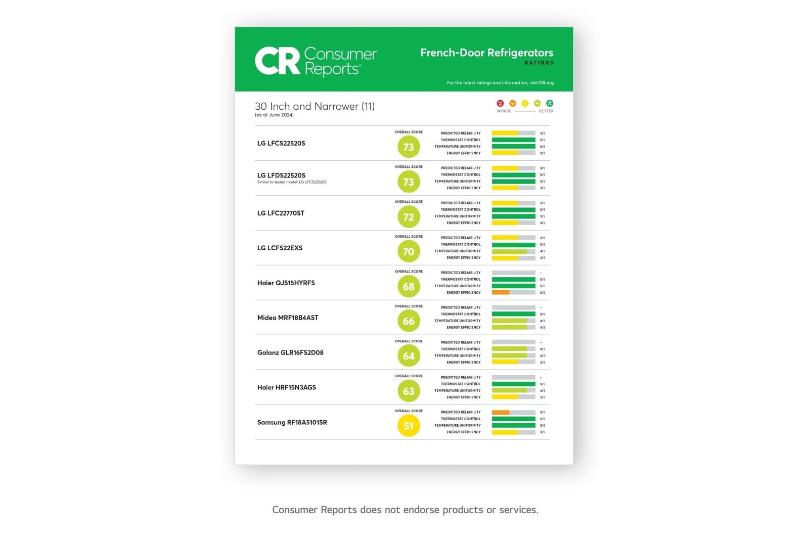 See why Consumer Reports rated the LRFCS22520S and LFDS22520S French Door Refrigerators as the top models in the 30 Inch and Narrower category. 1 SEE RATINGS CHART