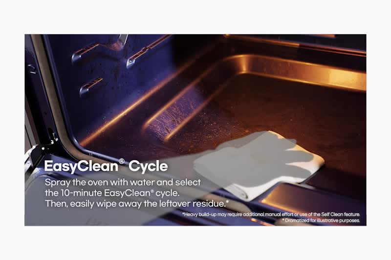 Simply spray the oven interior with water, press the EasyClean(R) button, and let the oven do the work in just 10 minutes-without chemicals or high-heat. Then, easily wipe away the leftover residue.