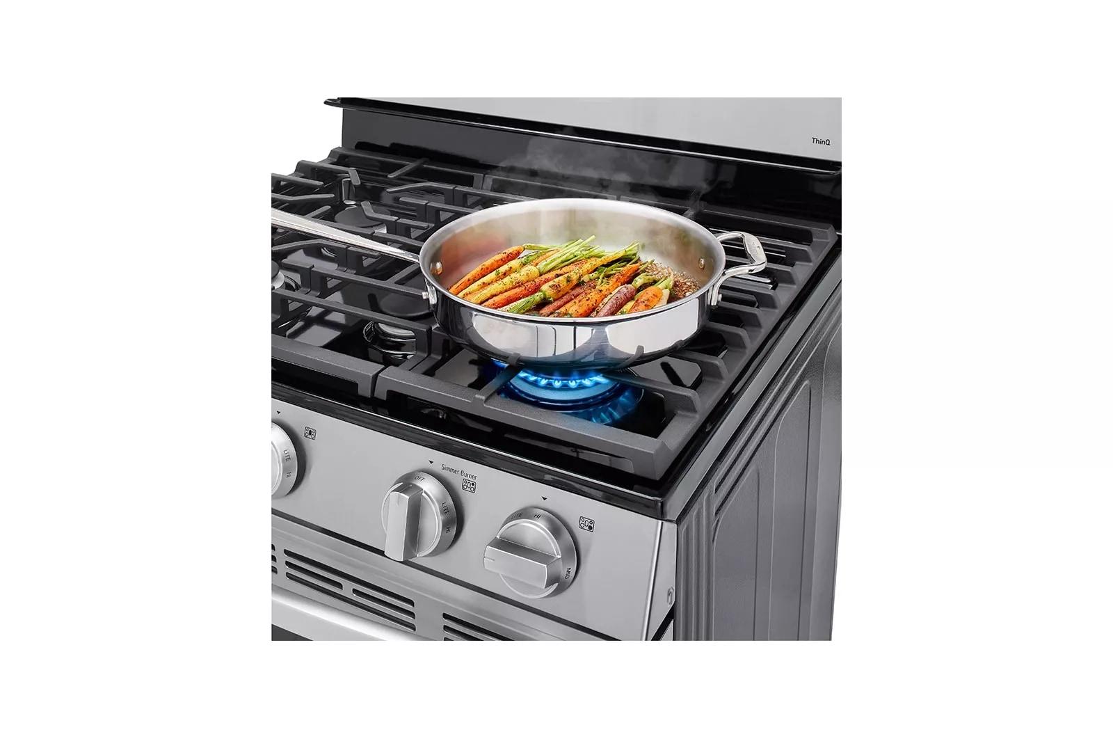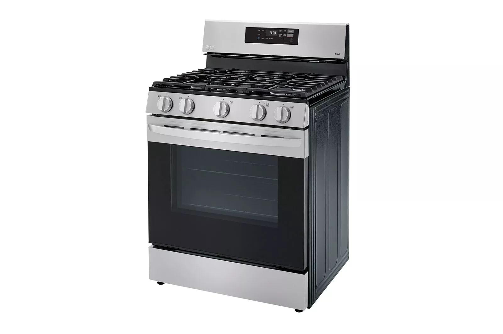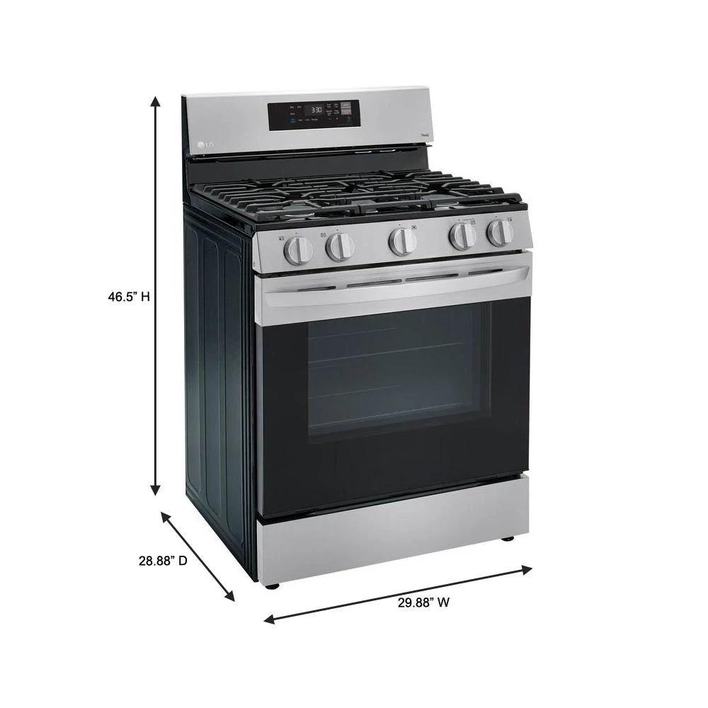The brand LG LRGL5821S is a premium 5.8 cu. ft. freestanding gas range engineered for seamless cooking and intelligent home integration. Featuring a versatile cooktop with four sealed burners, this range offers precise flame control and effortless cleanup. The spacious oven supports True Convection for consistent baking and roasting across multiple racks, while the EasyClean™ steam-clean feature reduces scrub time without harsh chemicals. Smart functionalities include Wi‑Fi ThinQ® connectivity for remote temperature control, voice commands, and convenient recipe notifications. An intuitive LED display and cooktop indicators simplify use, and the sleek stainless steel finish resists fingerprints for a polished kitchen look. Designed for reliability and convenience, the LG LRGL5821S brings professional-quality performance to everyday cooking.
