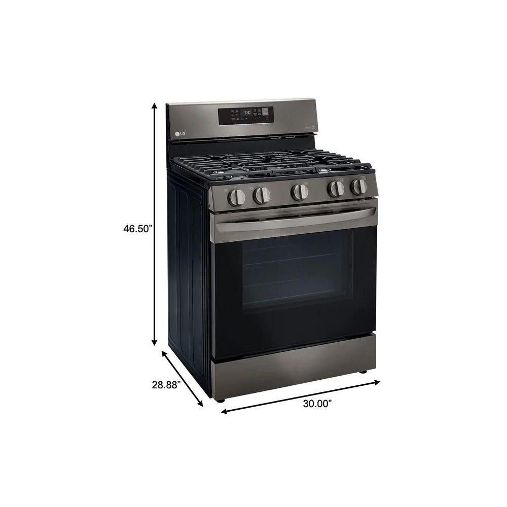 The LG LRGL5823D 5.8 cu ft. Smart Gas Range with Convection & Griddle offers advanced cooking performance and contemporary style. This range features a spacious 5.8 cu ft. convection oven for even heat distribution, ensuring consistent baking and roasting. On top, the sealed gas cooktop comes with powerful burners and a sturdy non‑stick griddle plate accessory, perfect for pancakes, grilled sandwiches, and breakfast favorites. The stainless steel finish adds durability and a sleek aesthetic, while the smooth glass touch display and dial controls make for intuitive, responsive operation. Smart connectivity through LG ThinQ® allows remote monitoring, voice control, smart diagnosis, and scan‑to‑cook technology. With oven interior lighting and a child safety lock, this range balances convenience, safety, and robust cooking capabilities for everyday chefs.