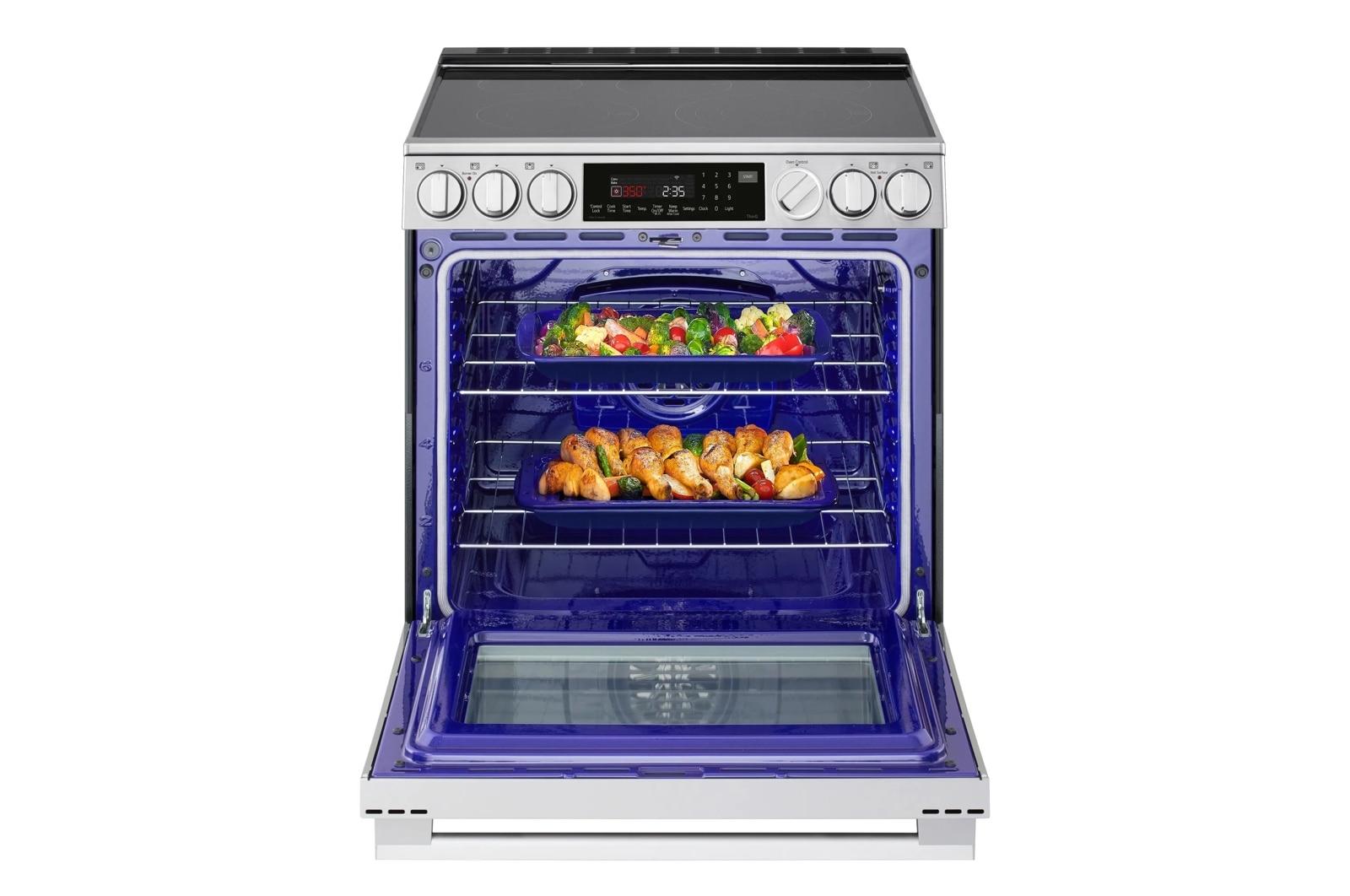 LG ProBake Convection(R) brings pro technology home with a combined two-speed fan and ultra-powerful rear heating element. The oven mode automatically selects the lower speed for delicate baking or the higher speed for air frying and roasting. The result is faster preheating, quicker cooking and more even baking on multiple racks at the same time. And with no bottom heating element, cleaning up baked-on spills and splatters is much easier. 1