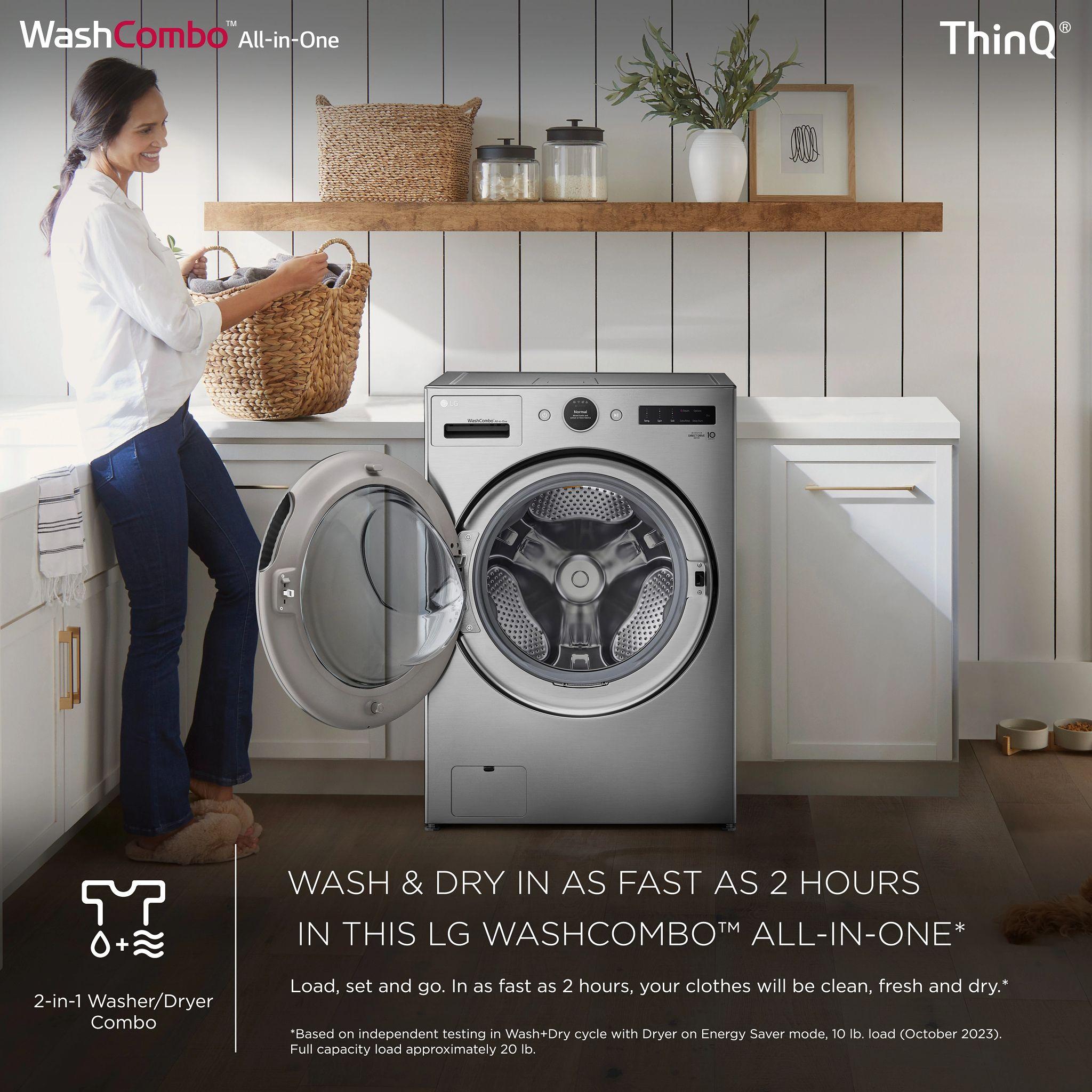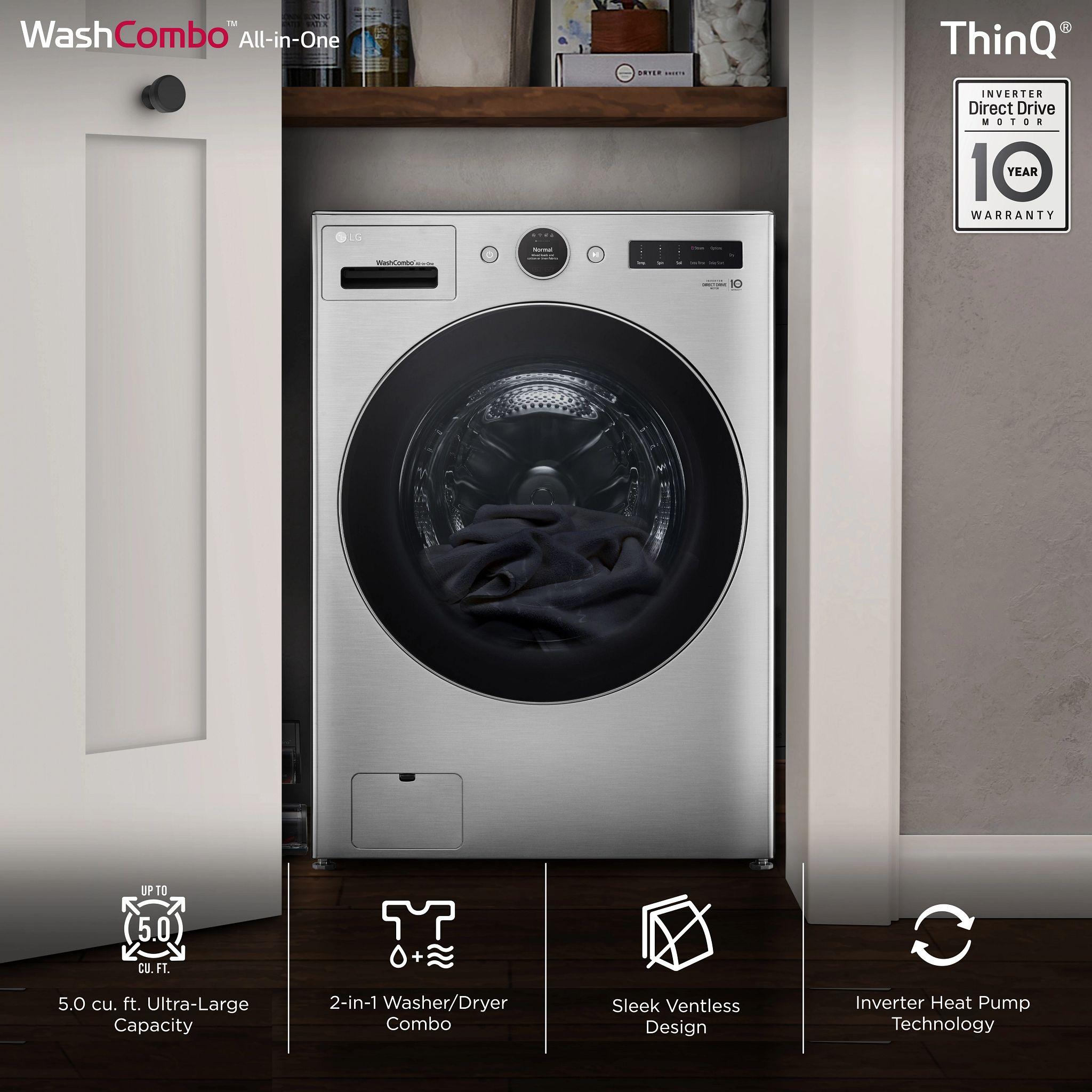 The LG WM6998HVA is a 27" Smart All-in-One Washer Dryer Combo that delivers advanced laundry solutions in a sleek, space-saving design. Featuring a generous 5.0 cu. ft. mega capacity, it accommodates large loads, including king-size comforters. The Inverter HeatPump™ technology ensures up to 60% energy savings, while the TurboWash™ 360 system utilizes five powerful jets for thorough cleaning in under 30 minutes. With 30 wash cycles and 18 options, including AI-powered settings, users can customize each load for optimal results. The LCD Digital Dial Control provides intuitive operation, and the ezDispense™ automatic detergent dispenser and ezLintFilter enhance convenience. Its ventless design and standard 120V plug allow for flexible installation, and the Wi-Fi connectivity with ThinQ® Technology enables remote monitoring and control. The Graphite Steel finish and tempered glass door add a premium touch to any laundry space.